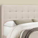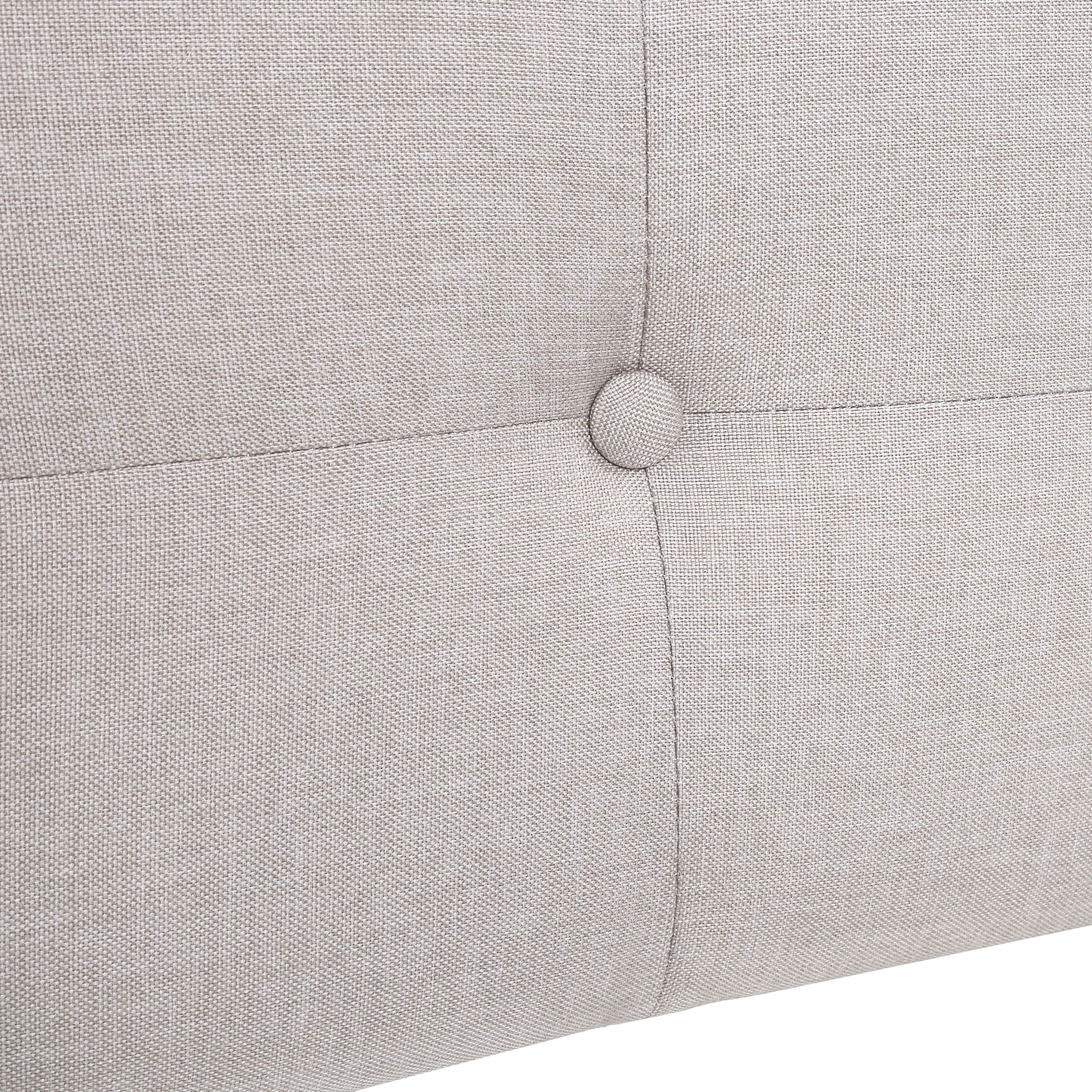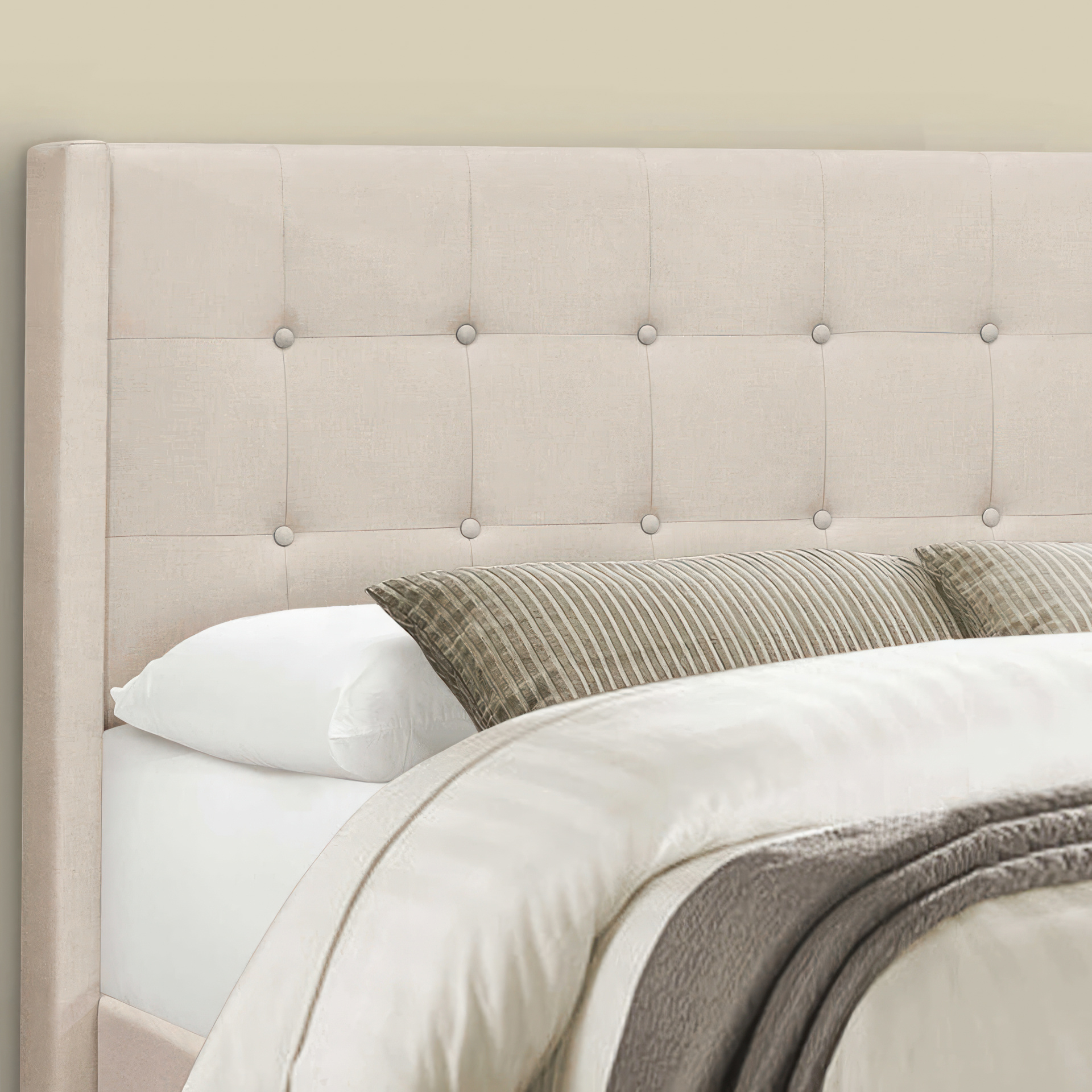 This queen-sized bed frame is covered in a neutral beige linen-look fabric over foam cushioning on all sides, with elegant button tufting on both the curved headboard and footboard for a full luxurious appeal.