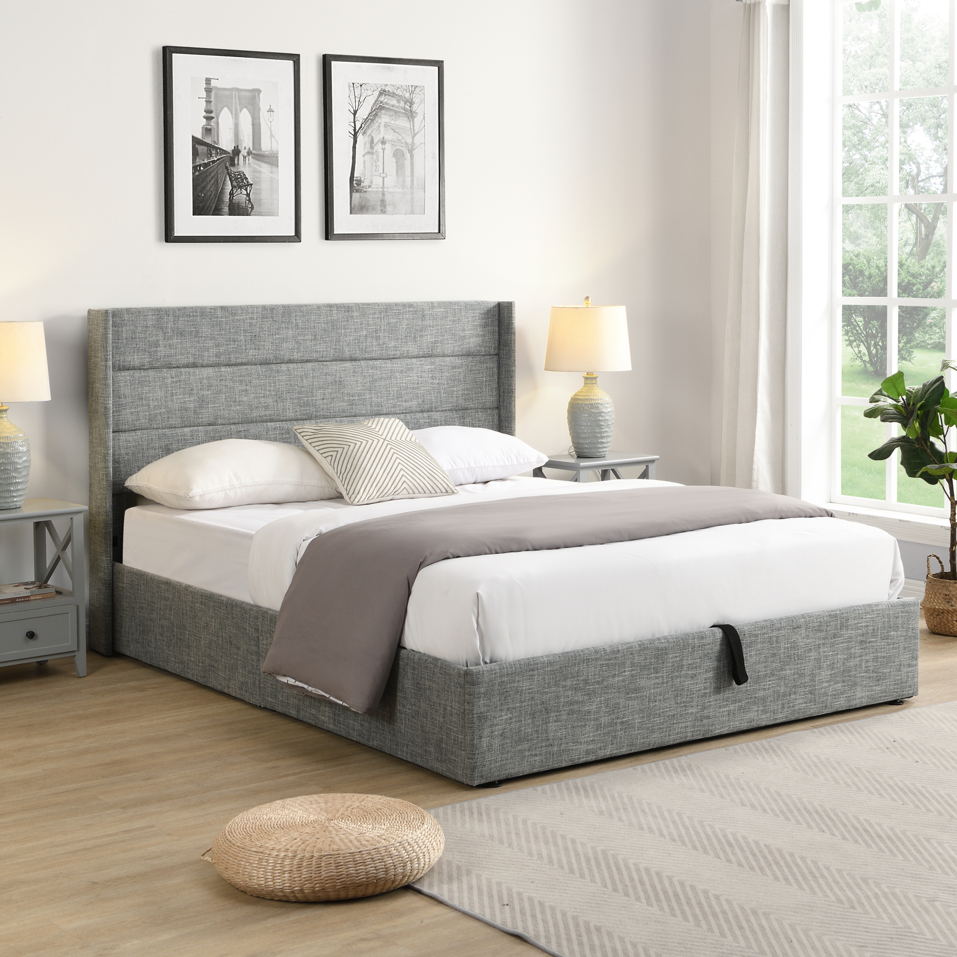 Our platform bed features a clean, modern design with upholstered panels and chic winged sides, instantly enhancing the look of your bedroom.