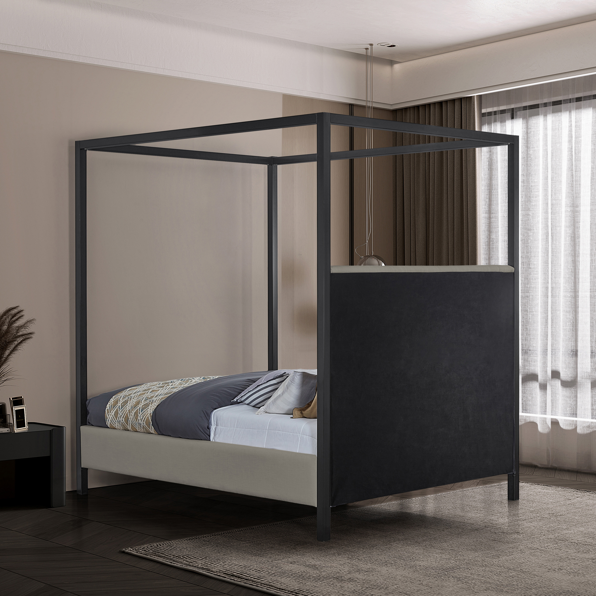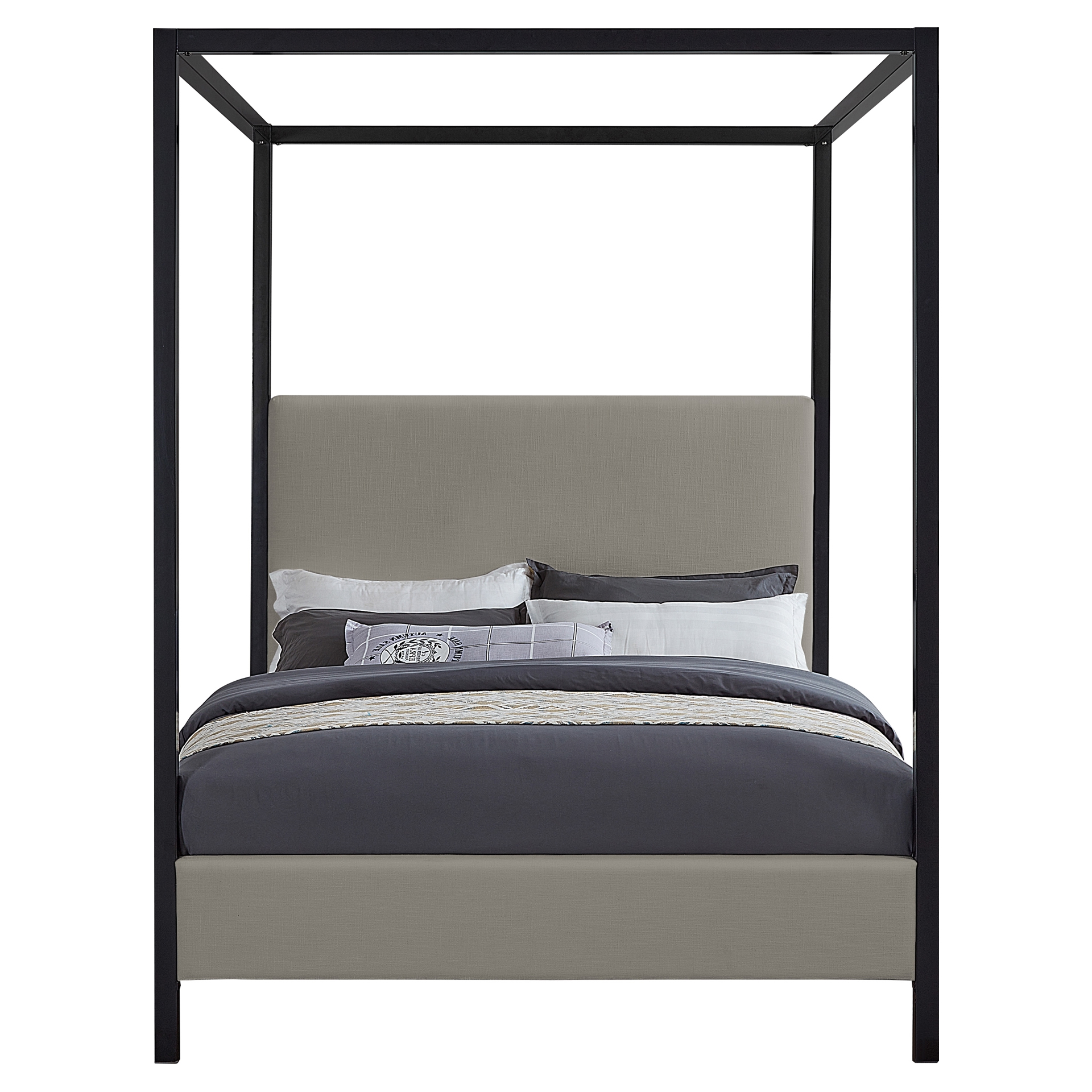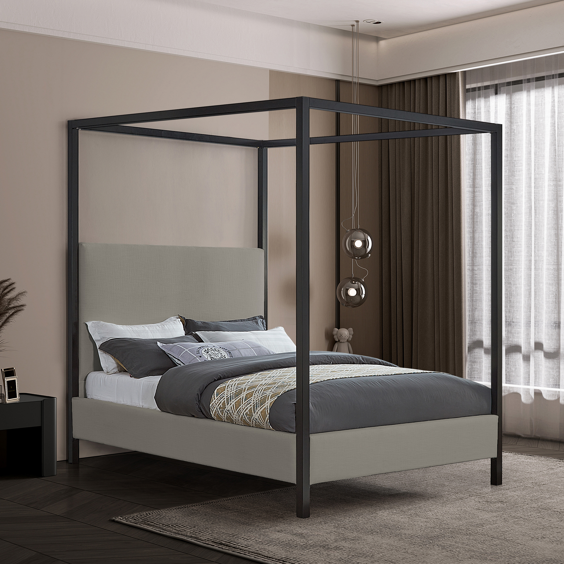 Its matte black finish contrasts elegantly with the grey linen-look polyester upholstery covering the headboard and sides of the bed.