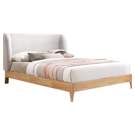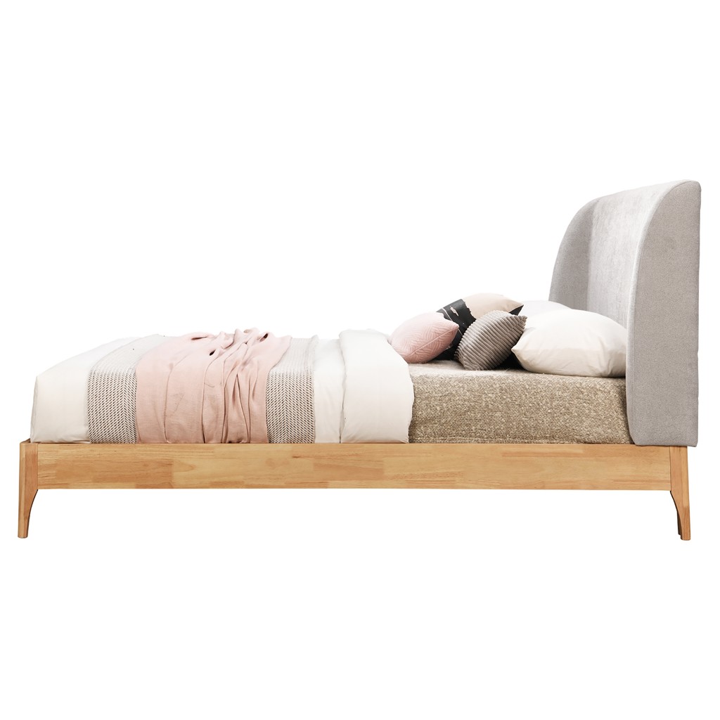 A winged headboard adds an elegant touch to the design of this handsome bed, and upholstery in a soft neutral grey color makes it easy to integrate the bed with other furnishings.