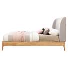 Solid wood legs in a natural finish form a contrast that enhances the bed's overall aesthetic.