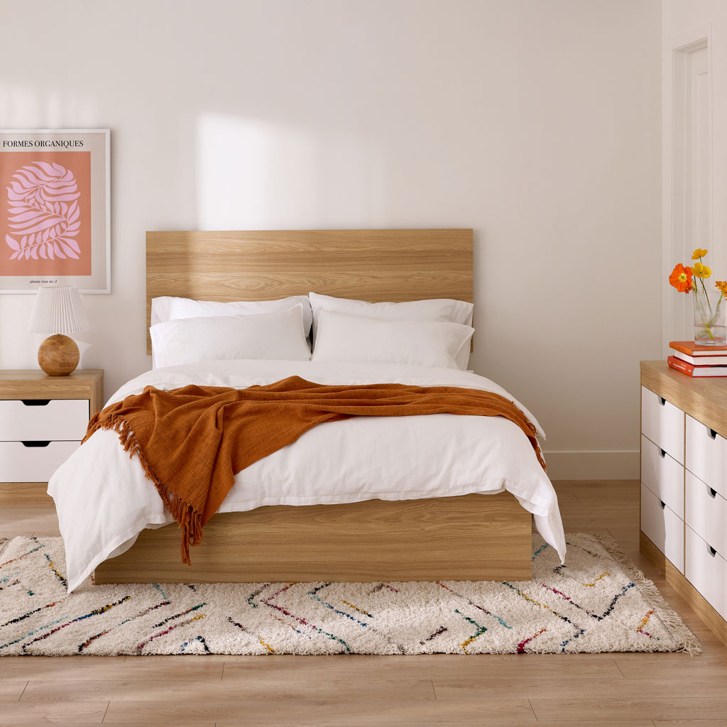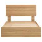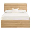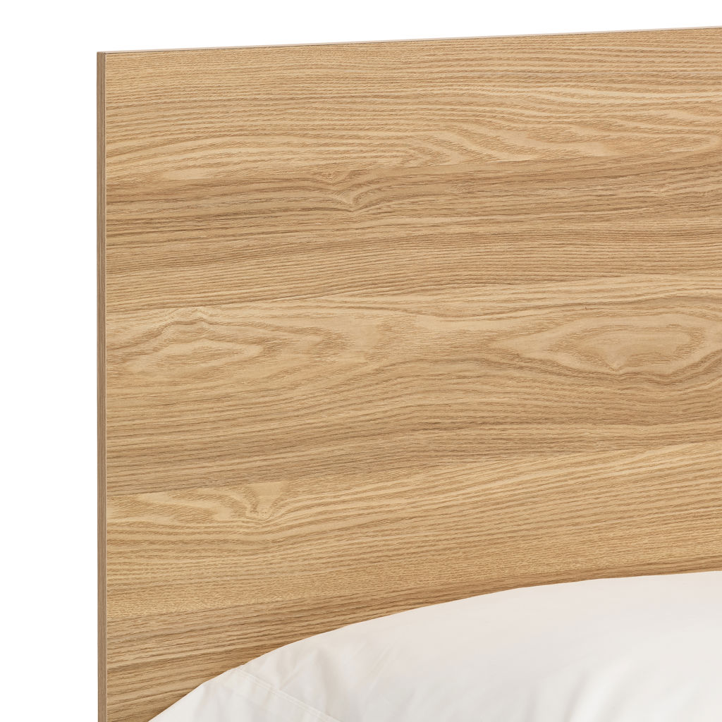 Transform your bedroom with this sleek, space-saving bed design. The sturdy melamine frame with a natural wood look adds warmth and elegance to your décor.