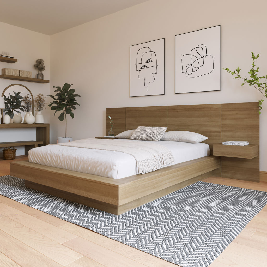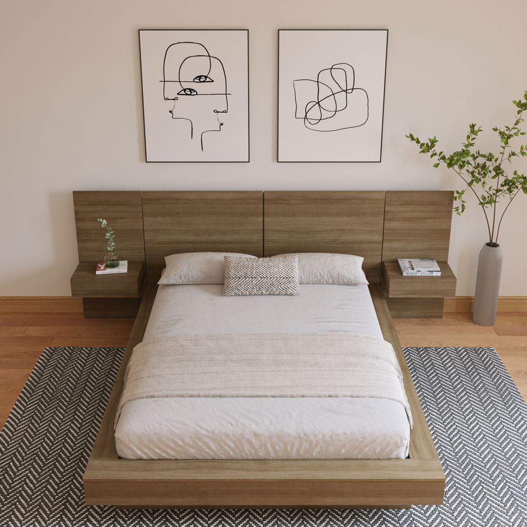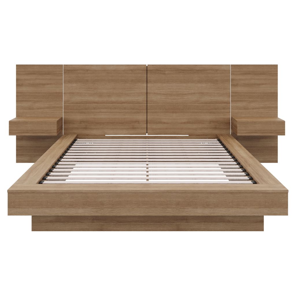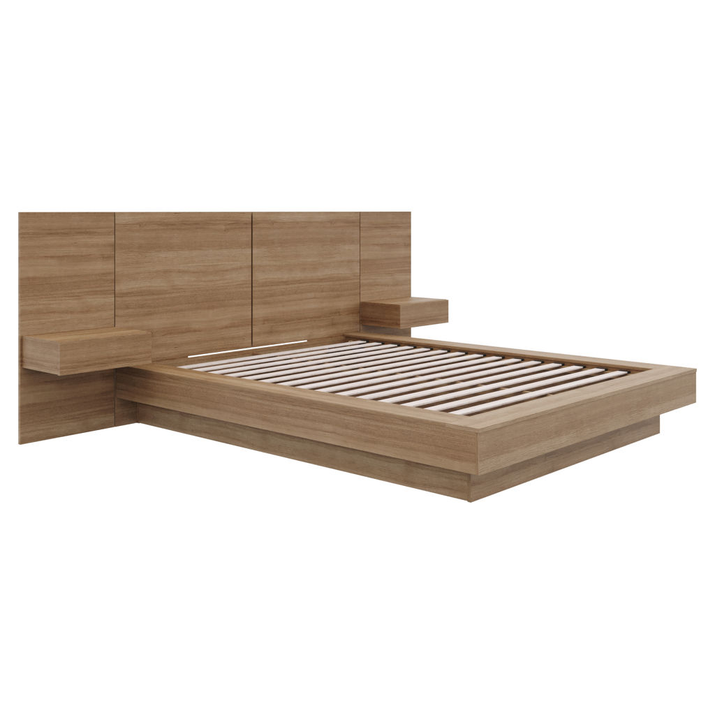 This elegant bed redefines luxury, featuring an opulent headboard with integrated extension panels and floating nightstands, all highlighting the exquisite beauty of brown oak.
