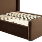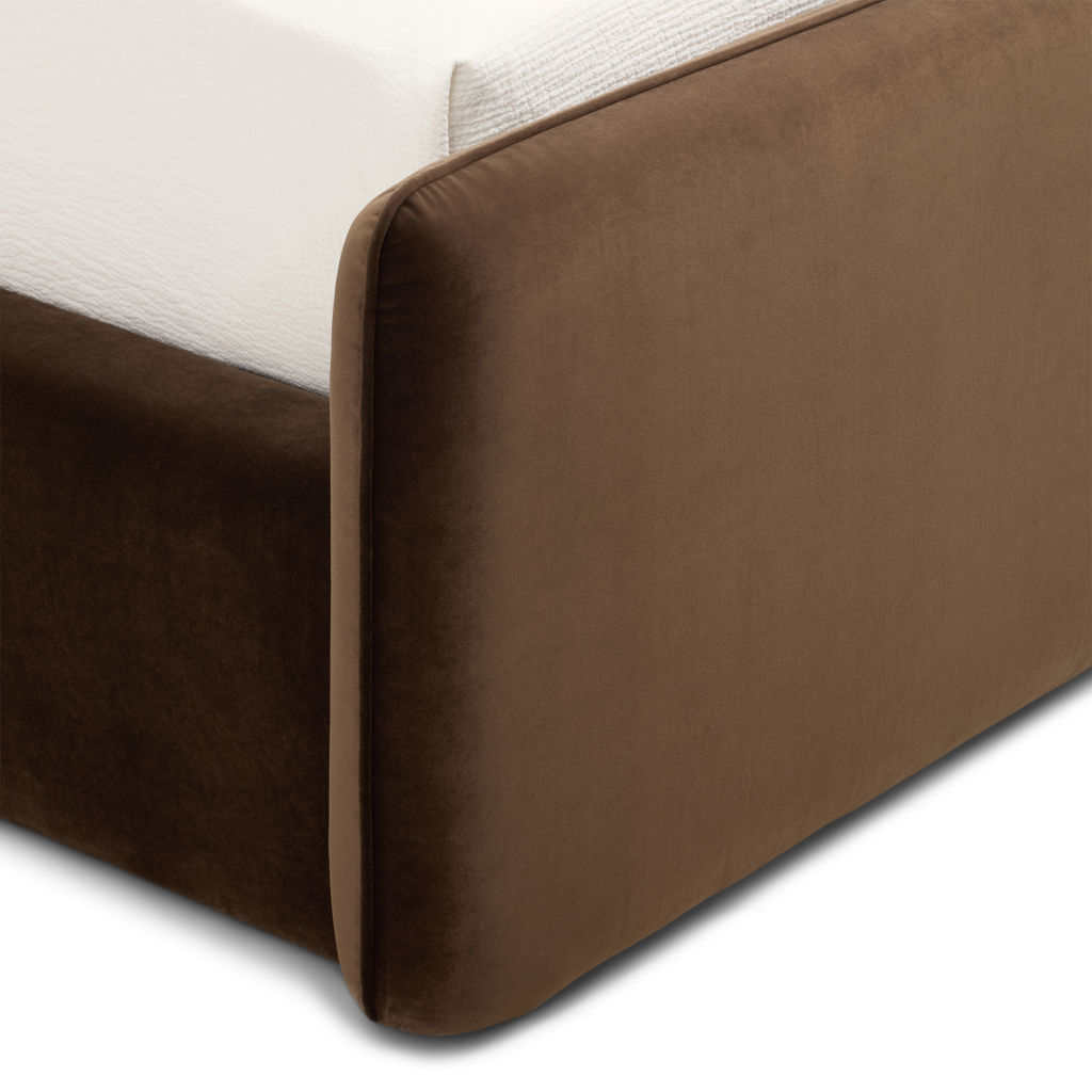 The bed’s distinctive silhouette, with raised side panels, adds a unique architectural dimension to your space while creating an intimate, cocoon-like feel. Its rich brown tone evokes warmth and refinement, instantly transforming your bedroom into a personal sanctuary.