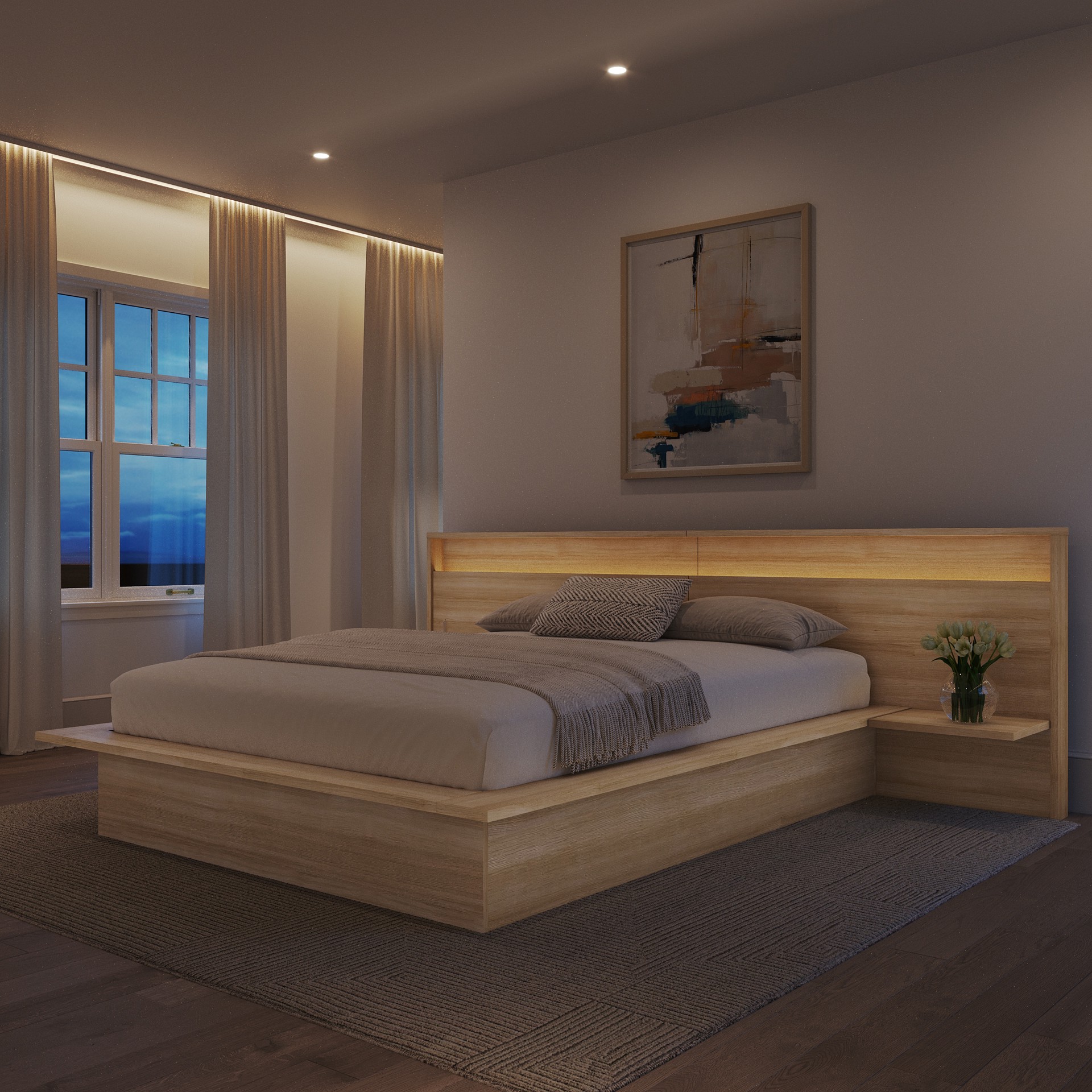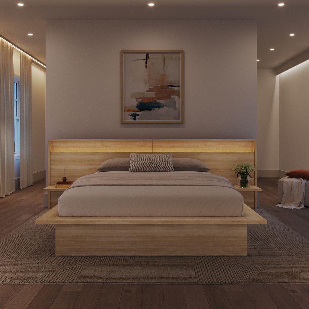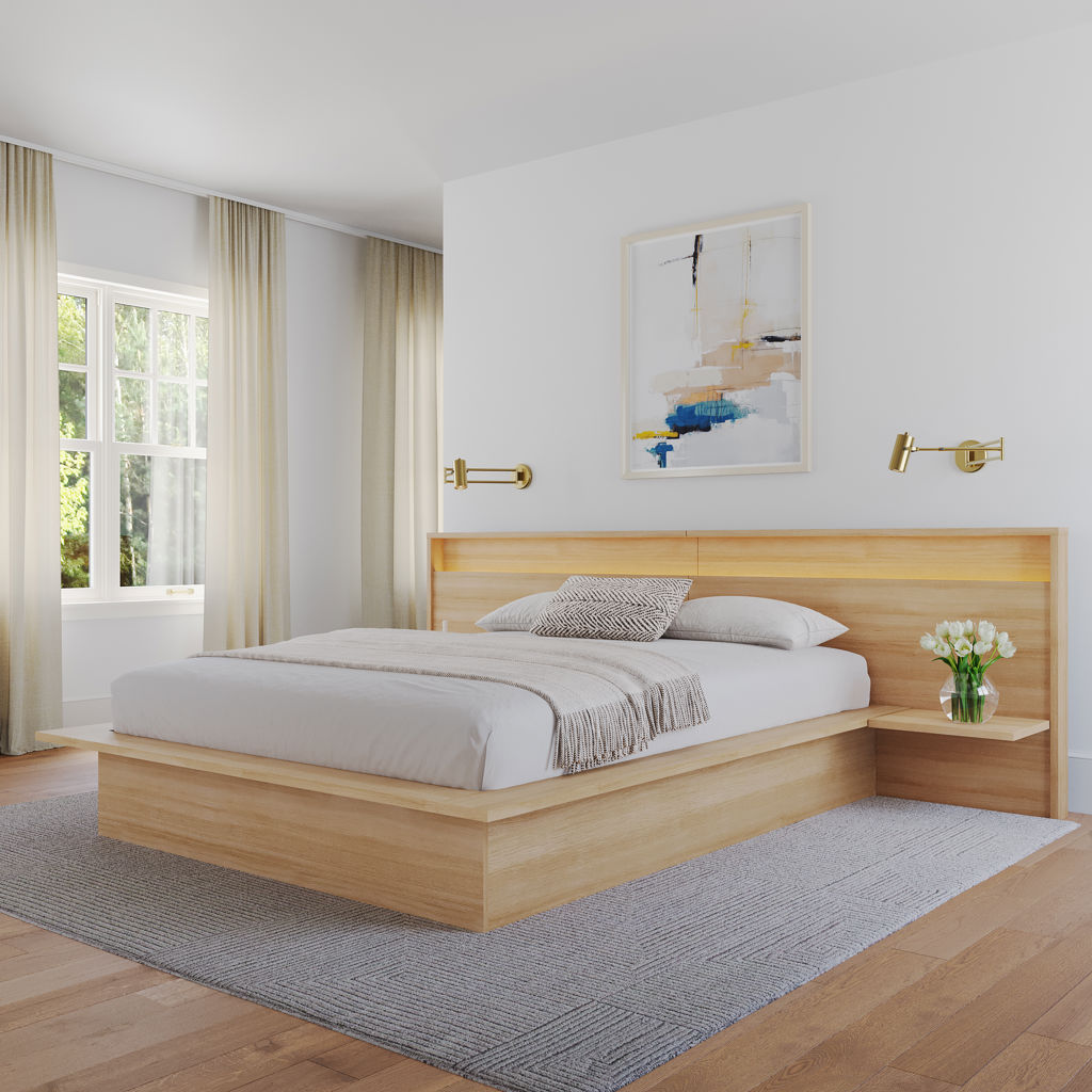 This platform bed, an elegant and refined choice carefully crafted from high-quality engineered wood. Its sleek design brings a contemporary touch to your space, while the natural grain variations create a warm, organic ambience perfect for your bedroom.