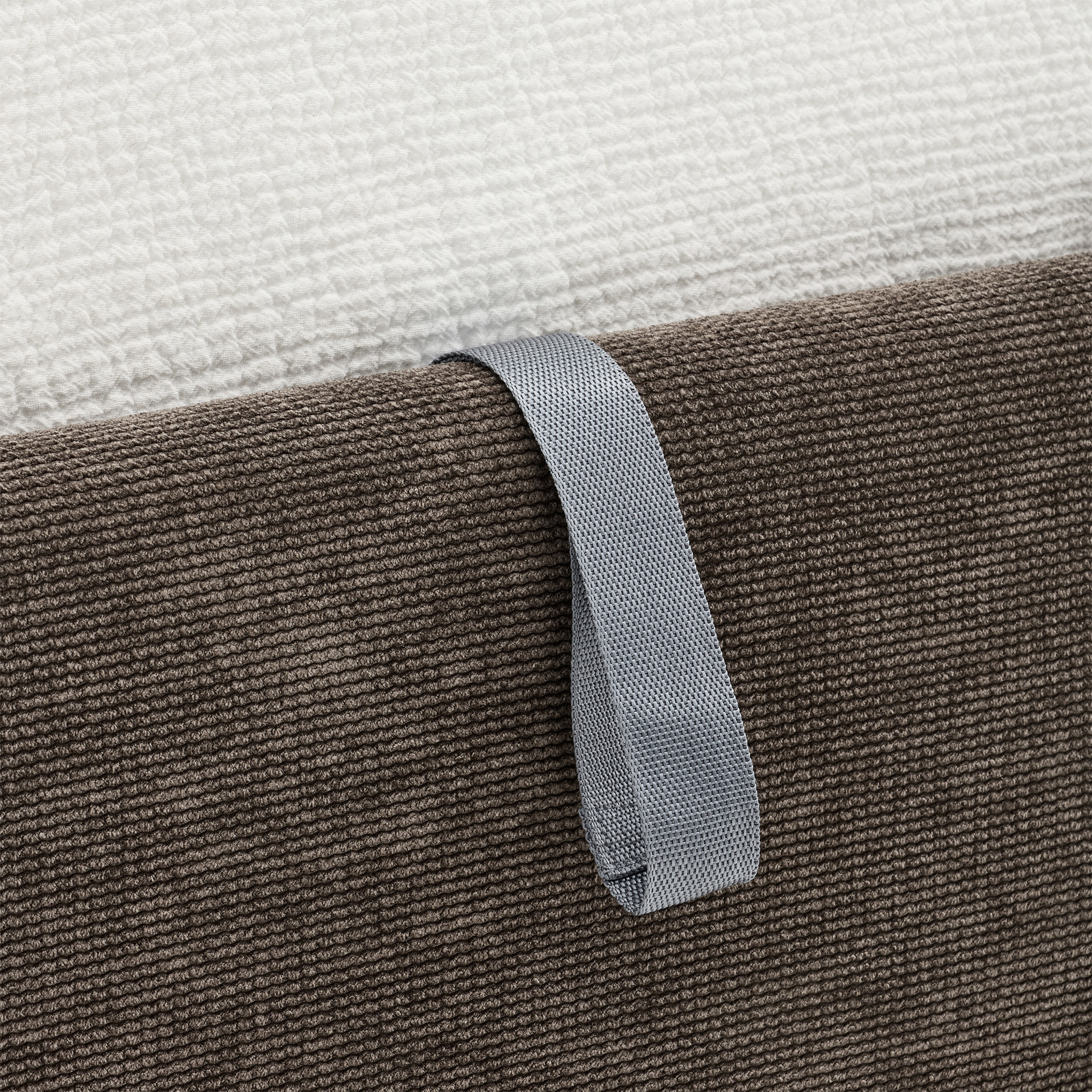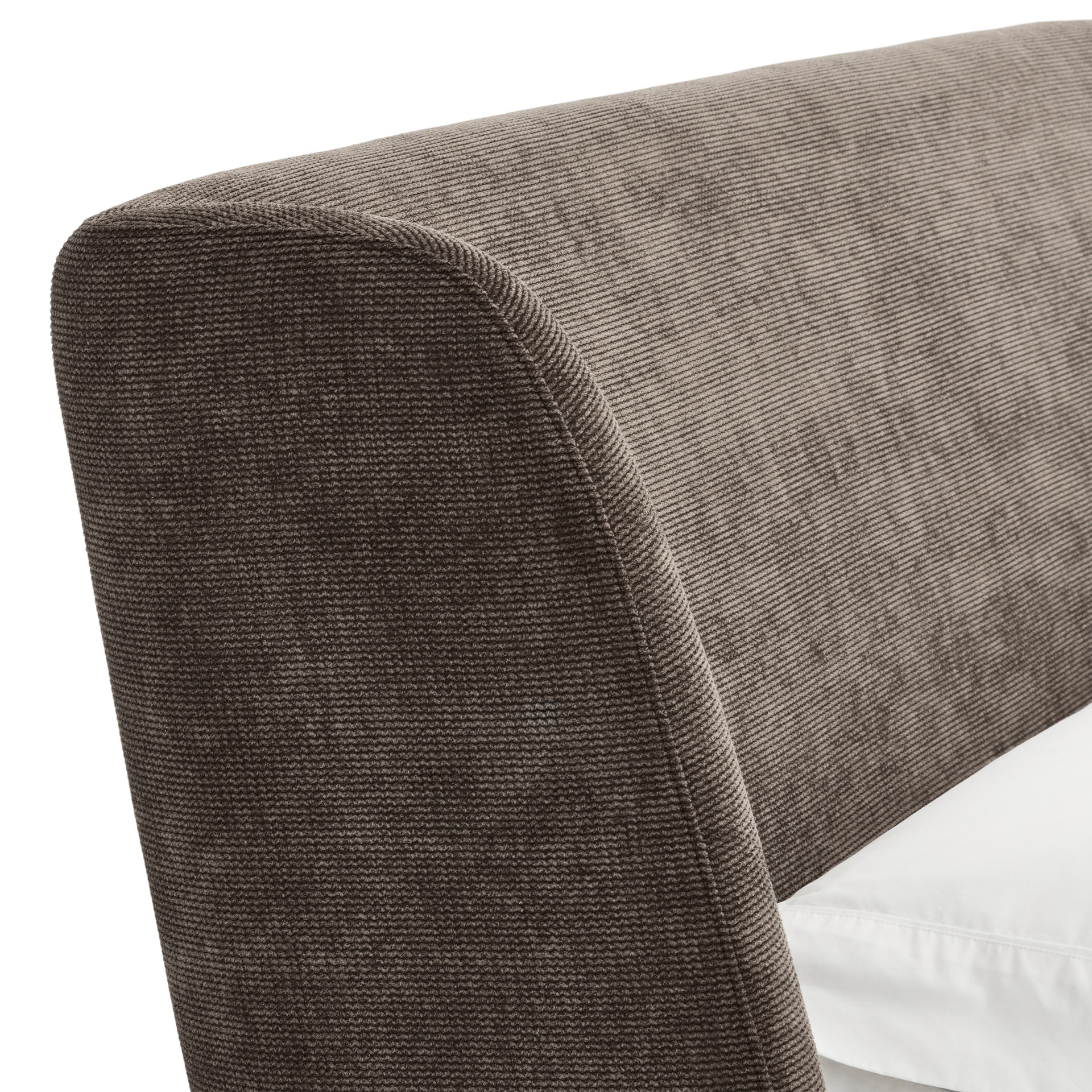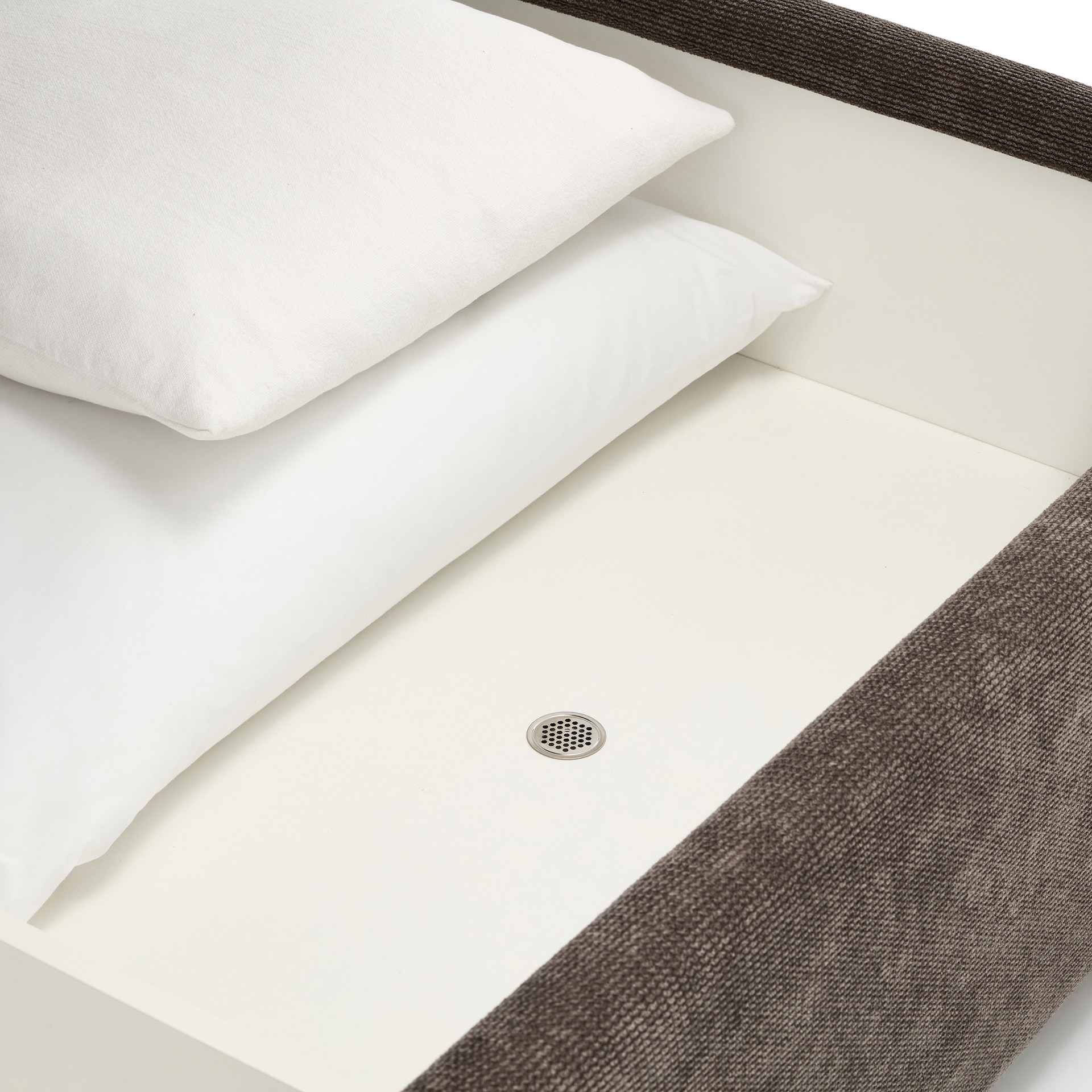 The FITZ upholstered bed with integrated storage combines functionality and style, with removable coverings for easy cleaning. Its high, minimalist headboard not only enhances its modern aesthetic, but also offers ample storage space underneath, making it an ideal choice for optimizing bedroom organization.