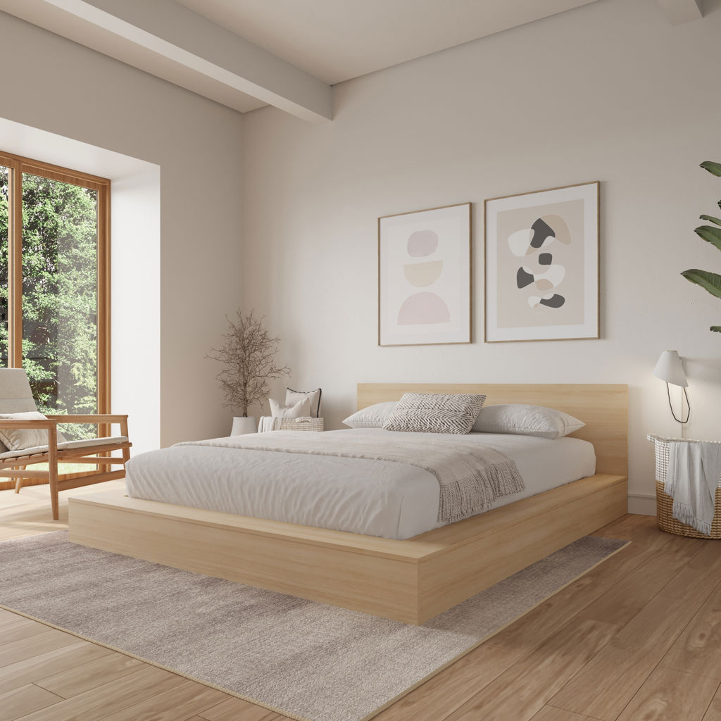 Its low, grounded design promotes a feeling of openness and serenity, while the platform's wide sides offer convenient space to keep your laptop, books or essentials close at hand.