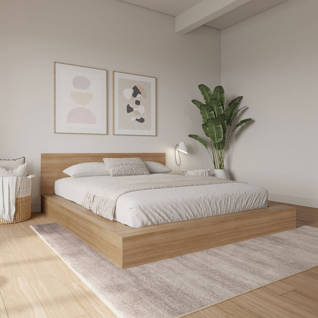 Its low, grounded design promotes a feeling of openness and serenity, while the platform's wide sides offer convenient space to keep your laptop, books or essentials close at hand.
