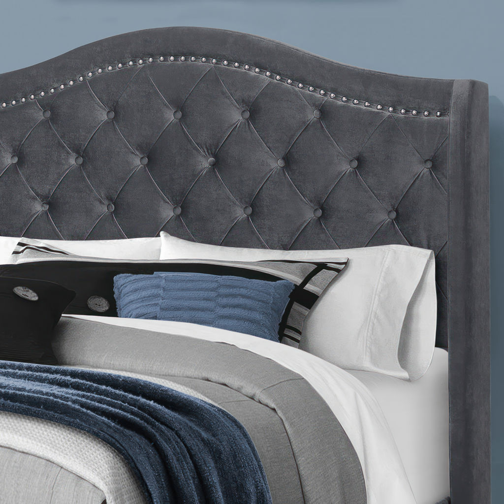 Give your bedroom a stylish look with this luxurious queen bed with an elegant upholstered headboard with side wings in dark grey velvet fabric. Classically styled, the headboard features chrome studs that follow the curve of its silhouette giving it an impressive look. The clean lines of the bed base with its black solid wood legs add stability and a modern touch.