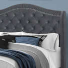 Hardware located in the headboard unit. Upholstered headboard with side wings and dark grey velvet fabric upholstered bed base.