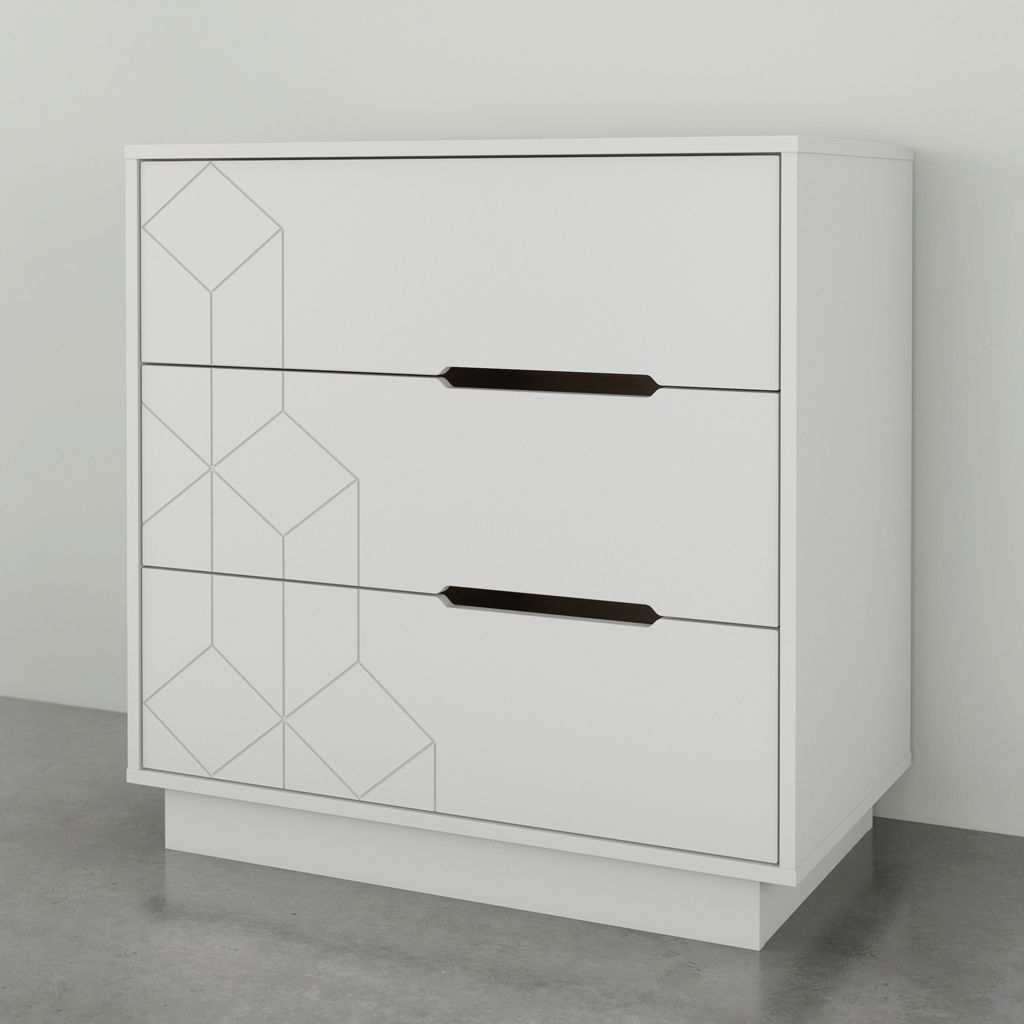 Bring a touch of sophistication to your bedroom with our textured geometric design 3-drawer chest. With its sculpted fronts and matte-finish white lacquer, this chest becomes a true decorative element, as well as being functional.