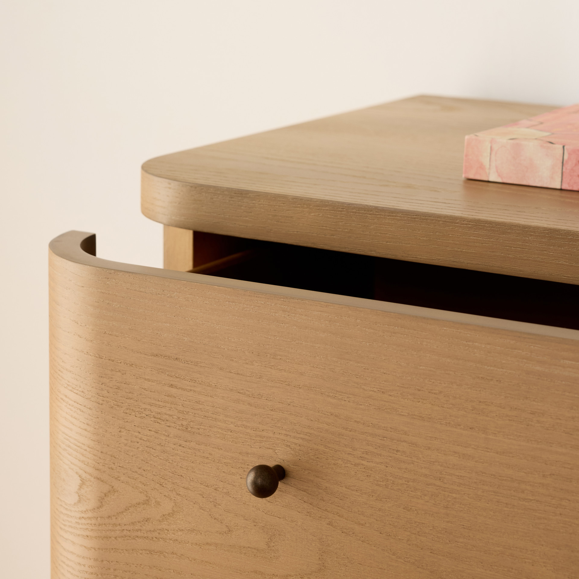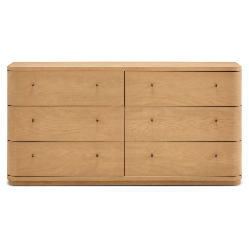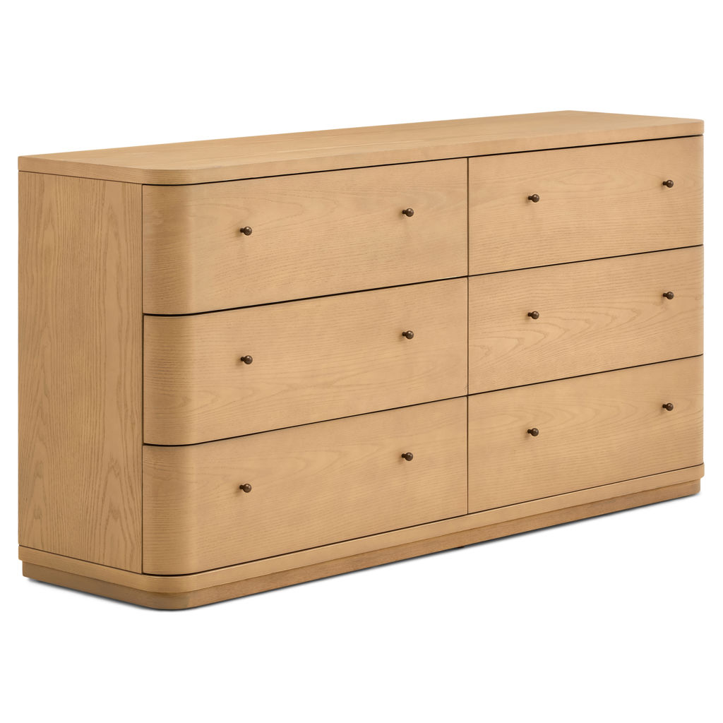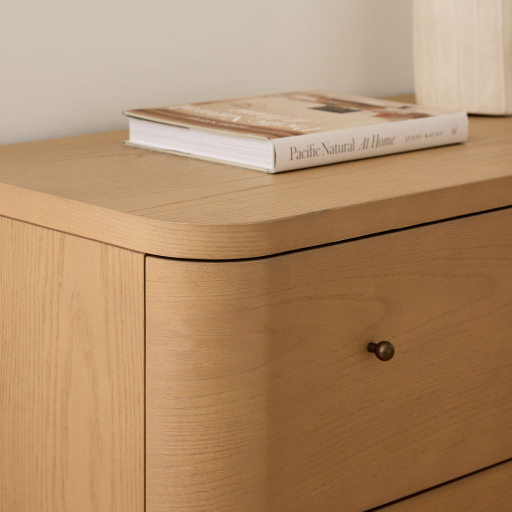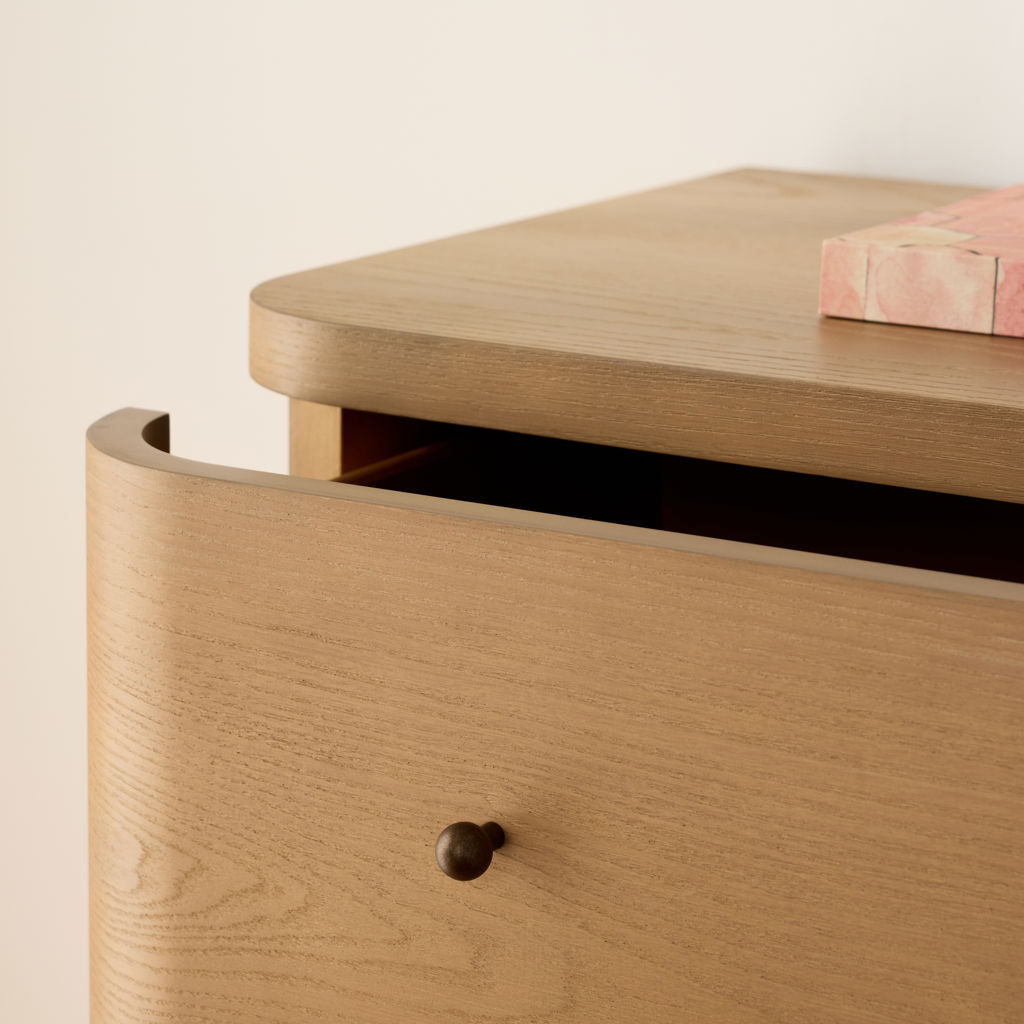 • Gracefully curved drawer fronts create a soft, serene look