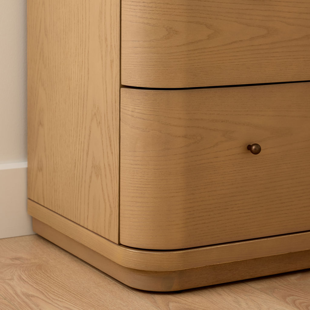 The gentle curves and understated elegance of the Penny collection embody the essence of quiet luxury, where every detail reflects refined sophistication. Crafted from quarter-cut, flat-cut ash veneer, its pale natural tones and subtle grain showcase a subdued beauty.