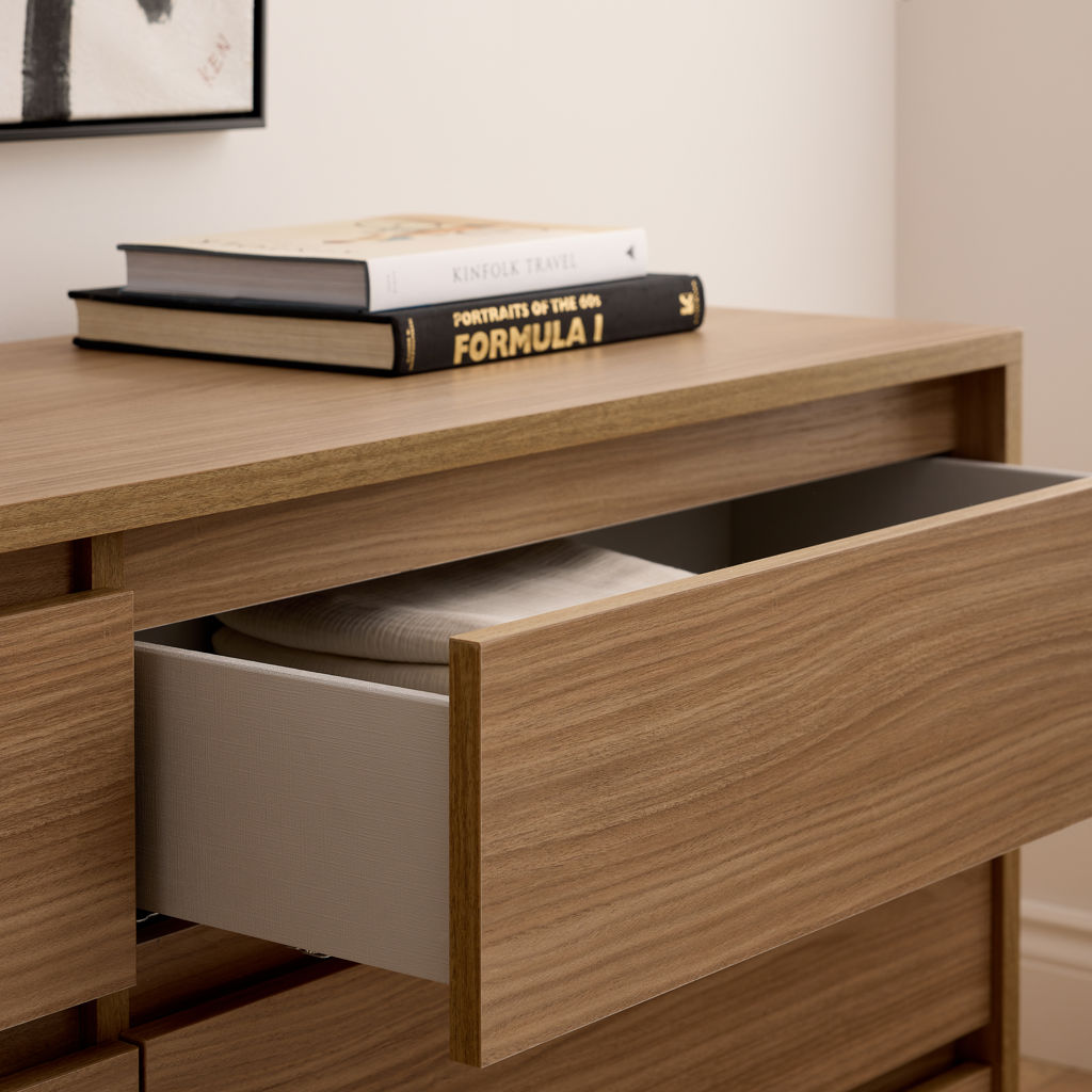 Its natural wood finish highlights the beauty of the clean lines, while its spacious drawers offer all the room you need to organize your clothes and accessories.