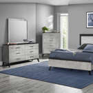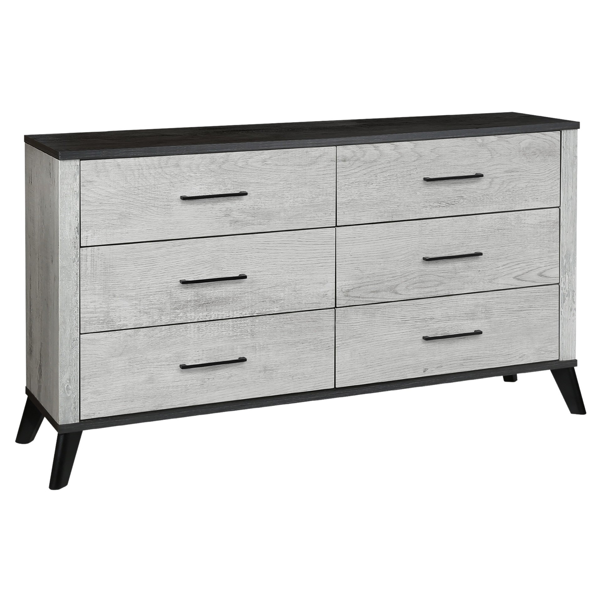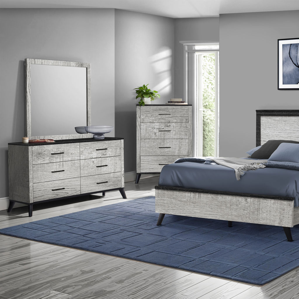 This chic 6-drawer dresser will transform your bedroom sanctuary into a contemporary upgrade. This stylish dresser showcases a sleek grey reclaimed wood-look laminate finish complimented with a sophisticated black top, effortlessly blending rustic warmth with modern elegance.
