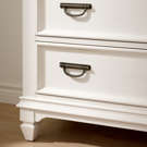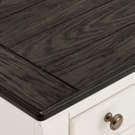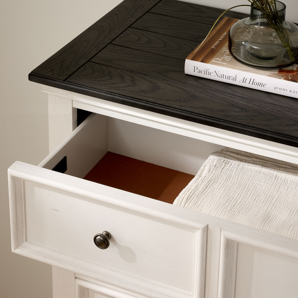 The two-toned wire brush finish with charcoal tops paired with the antique pewter knob and drop bail hardware designs a look that is versatile and would look good in any home, from a beach house to a big city loft.