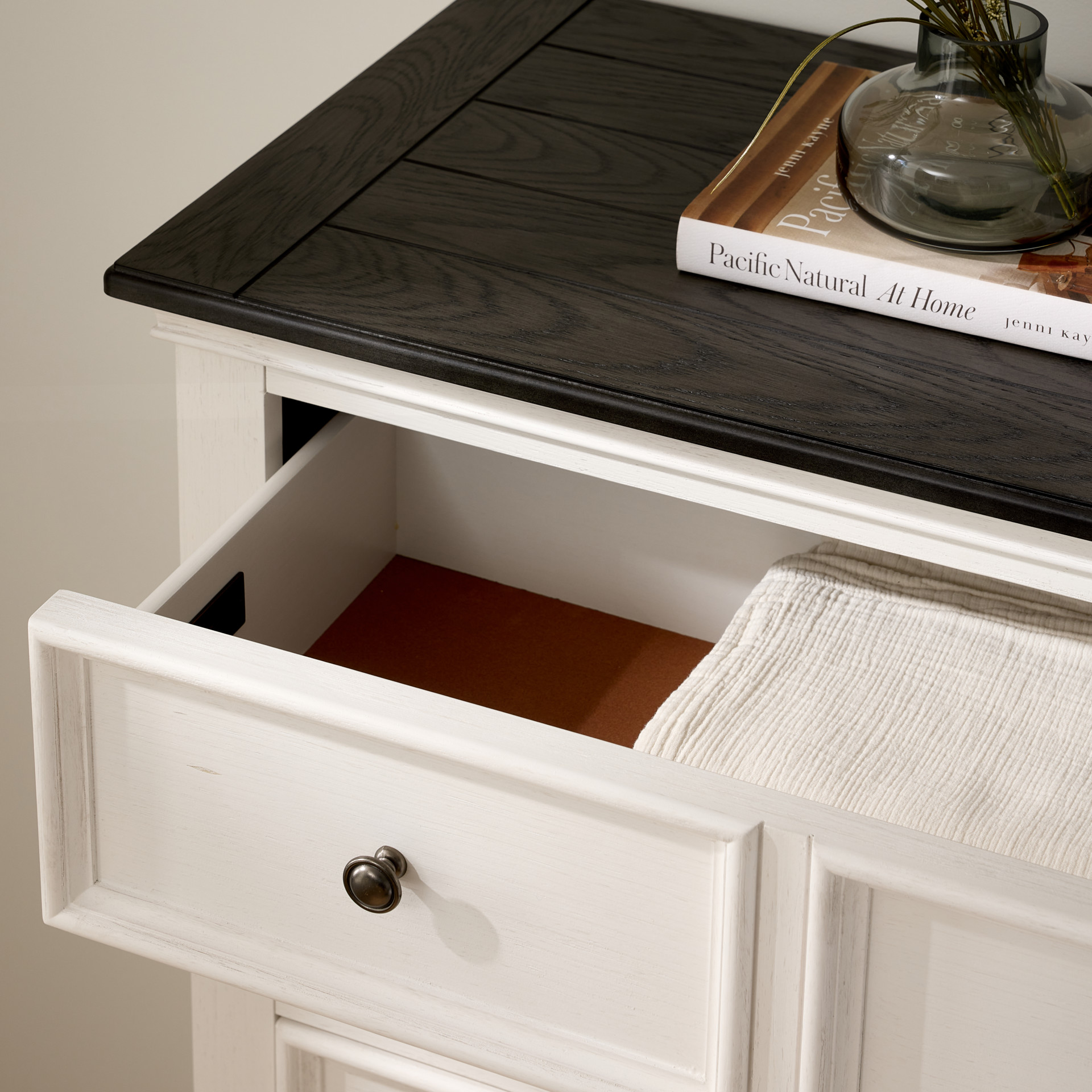 Crafted with pine solids and veneers with cathedral white oak tops, this piece features felt lined top drawers, fully stained interior drawers, beautiful bead molding, and is anchored by tapered feet.