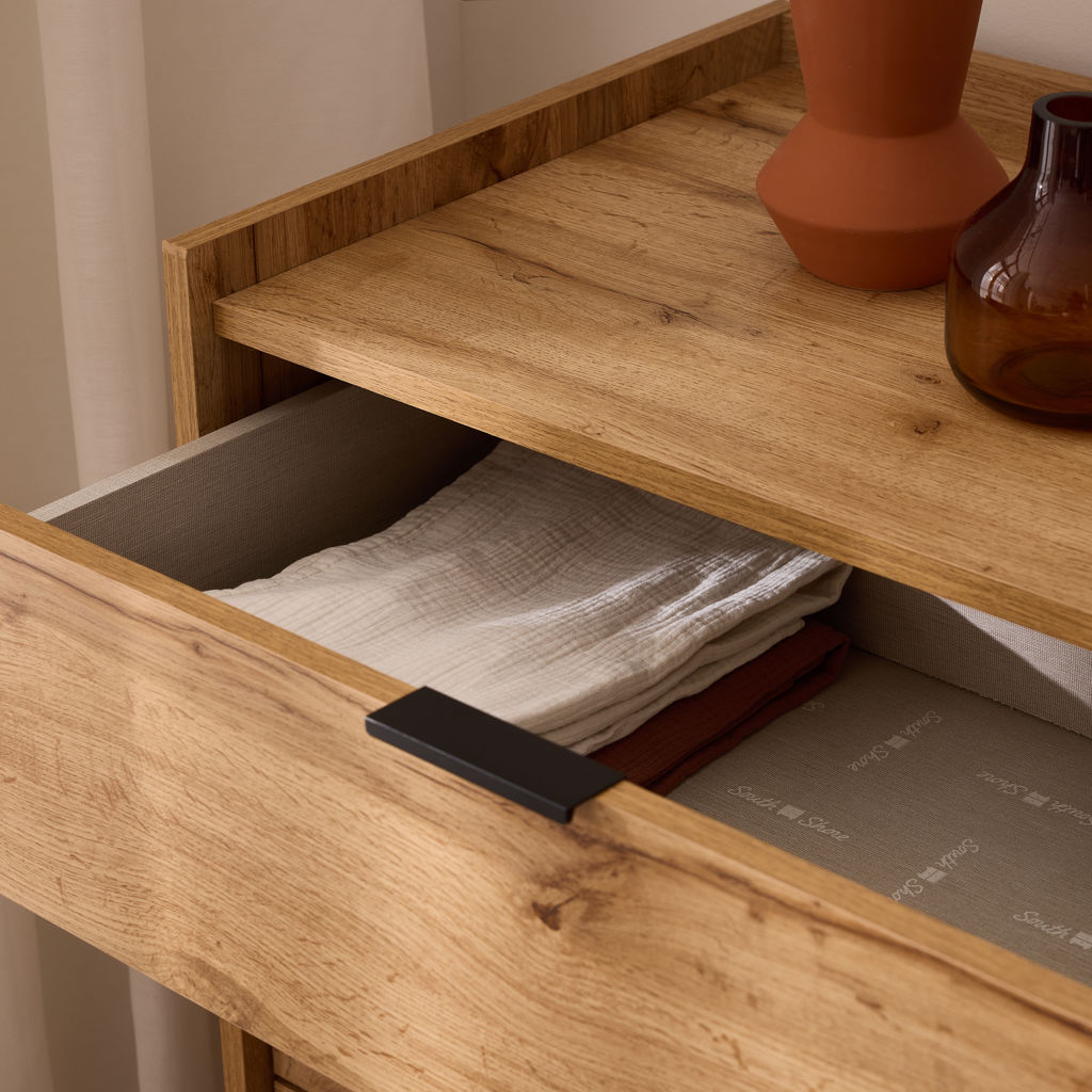 This chest, built tall, is a real find if you have a smaller bedroom. Because it’s slim, it’ll fit nicely between two pieces of furniture or against a wall… but that doesn’t mean you’re cutting back on storage space! It has 5 very large drawers that can hold sweaters, pants, skirts, cardigans, and even bedding. You’ll have everything in one place, which will make your life so much simpler.