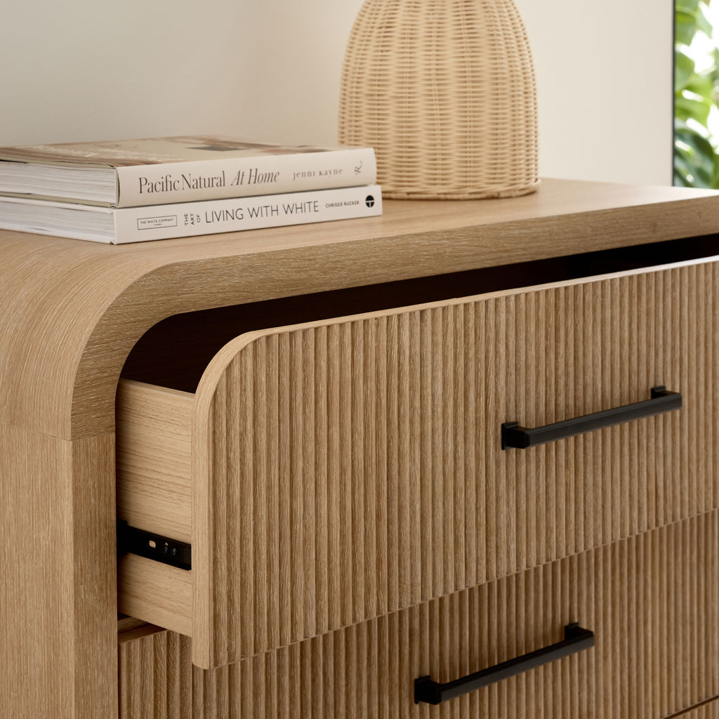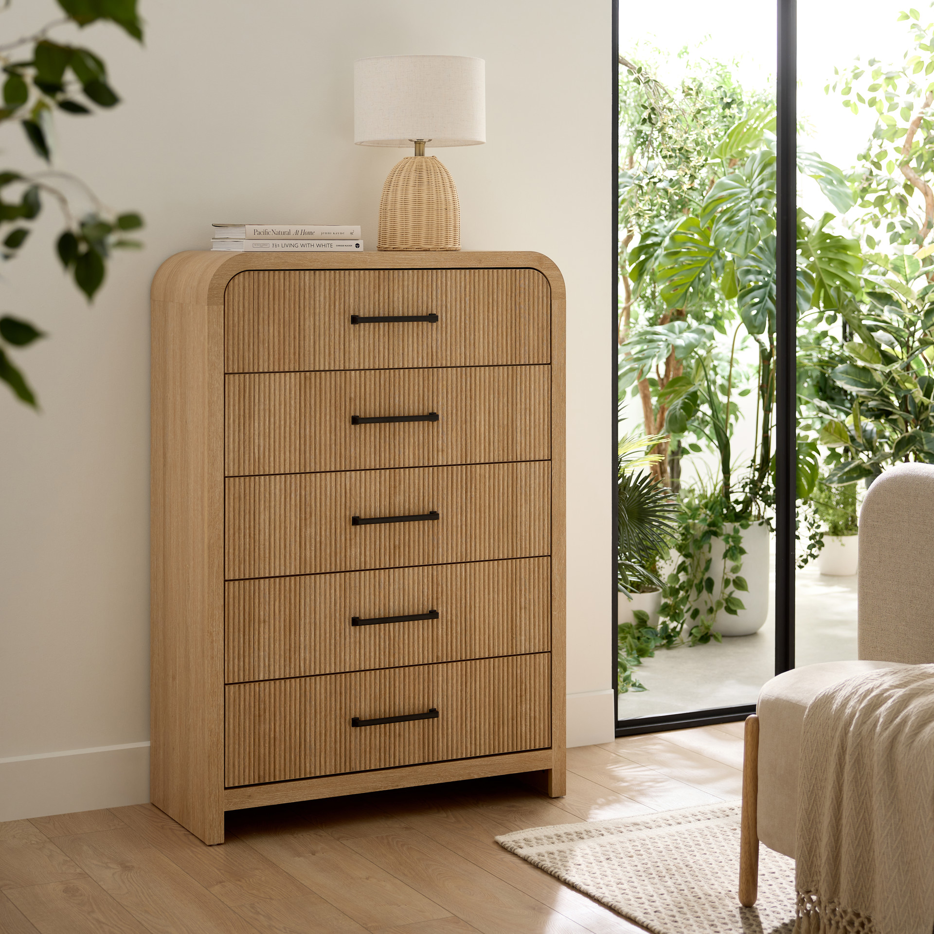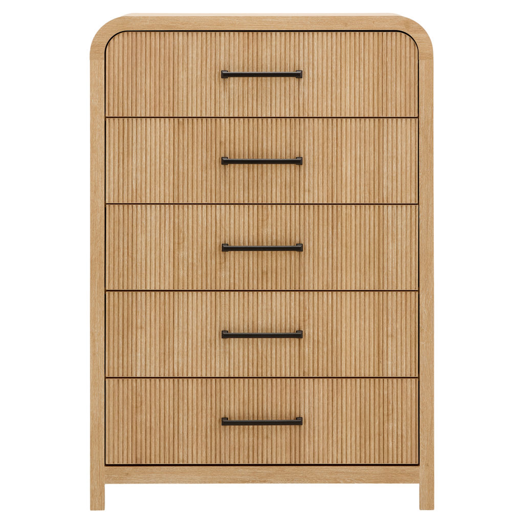 Featuring ball-bearing drawer glides for smooth operation and paper veneer for a sophisticated finish, this chest features ribbed panels, elegant black metal hardware and retro-style rounded edges.