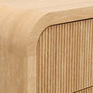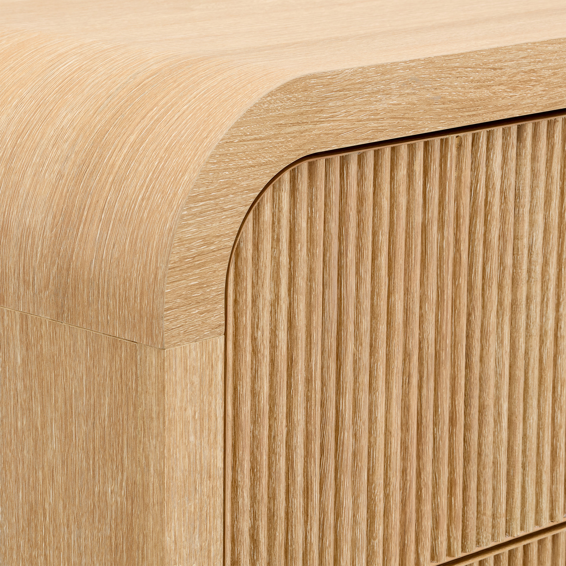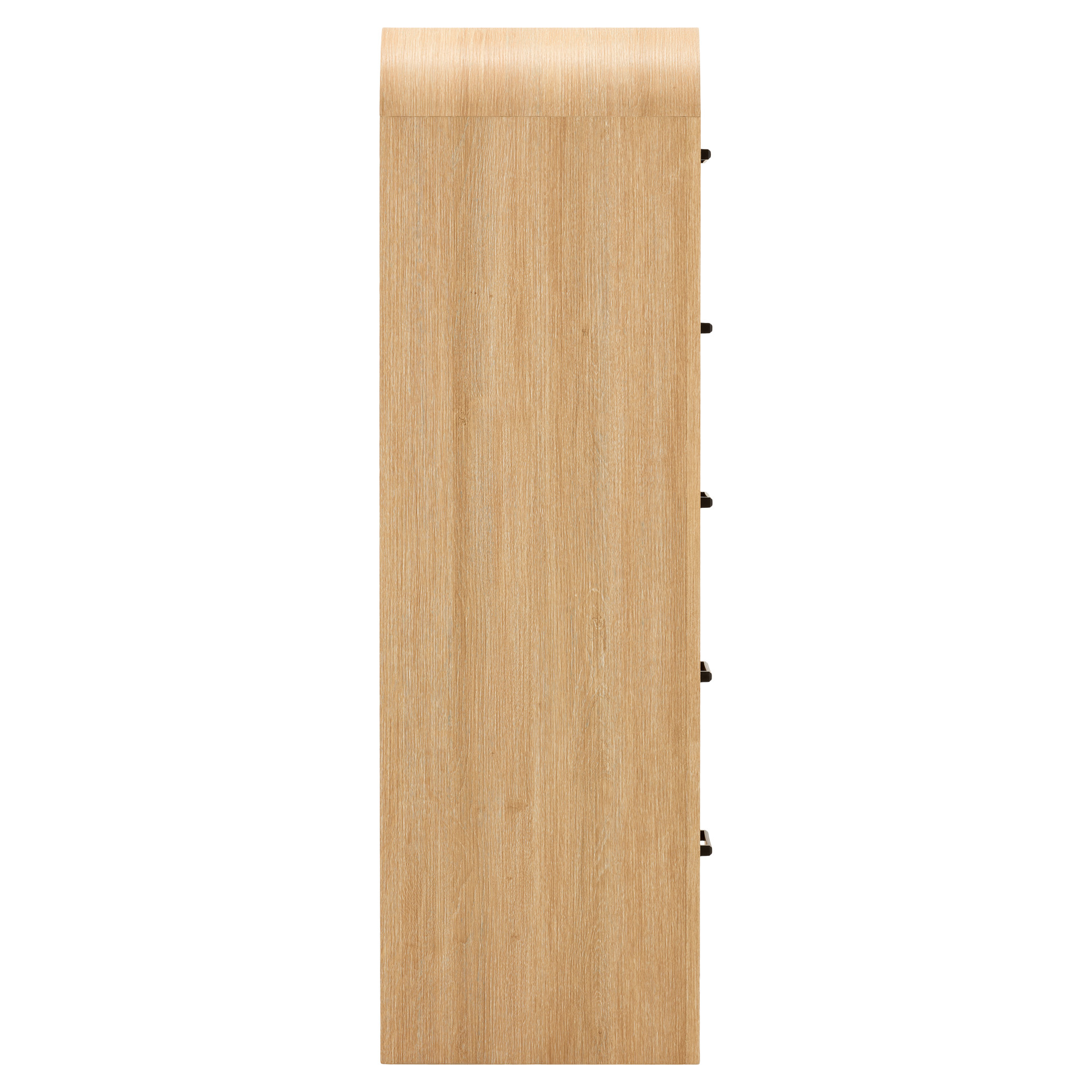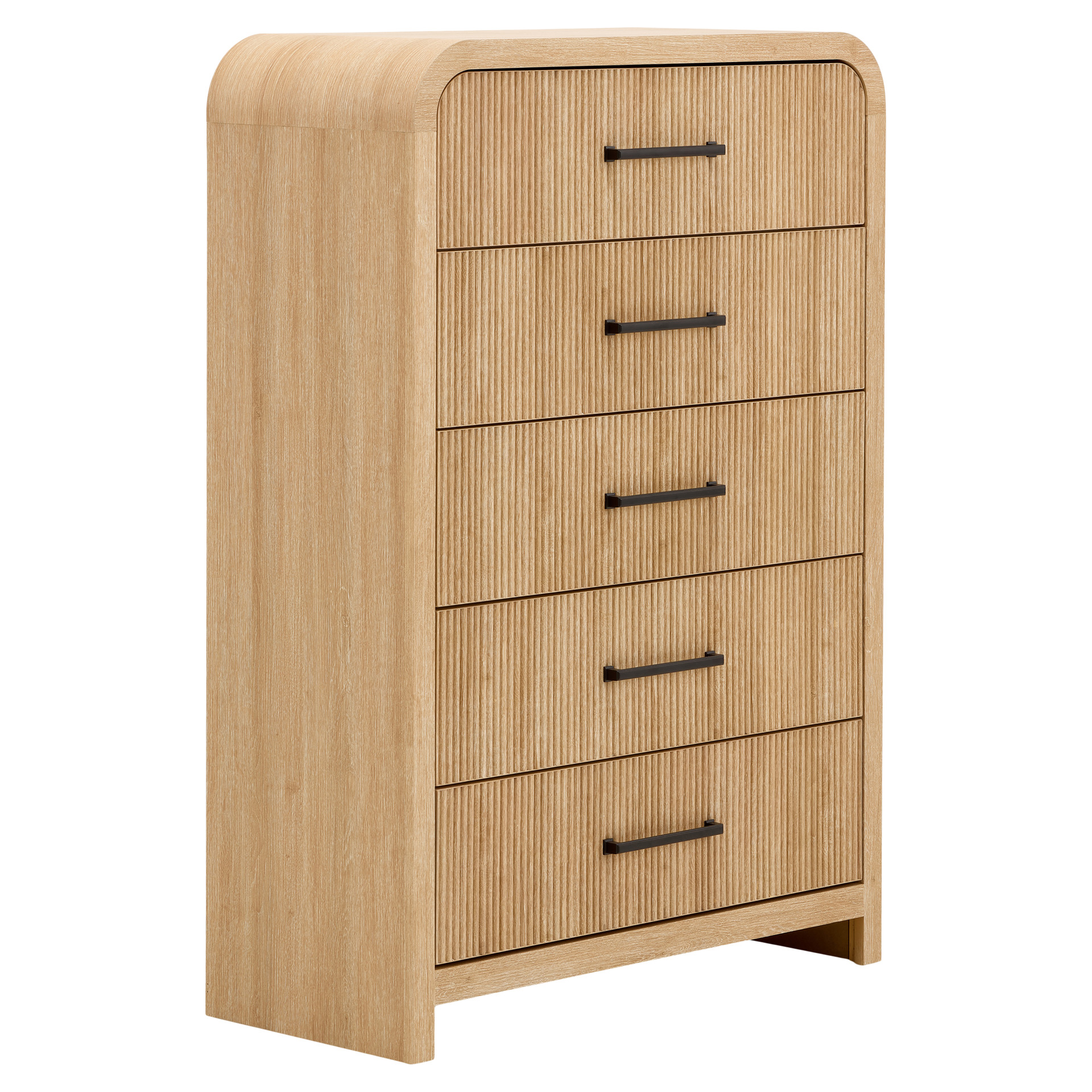 Featuring ball-bearing drawer glides for smooth operation and paper veneer for a sophisticated finish, this chest features ribbed panels, elegant black metal hardware and retro-style rounded edges.