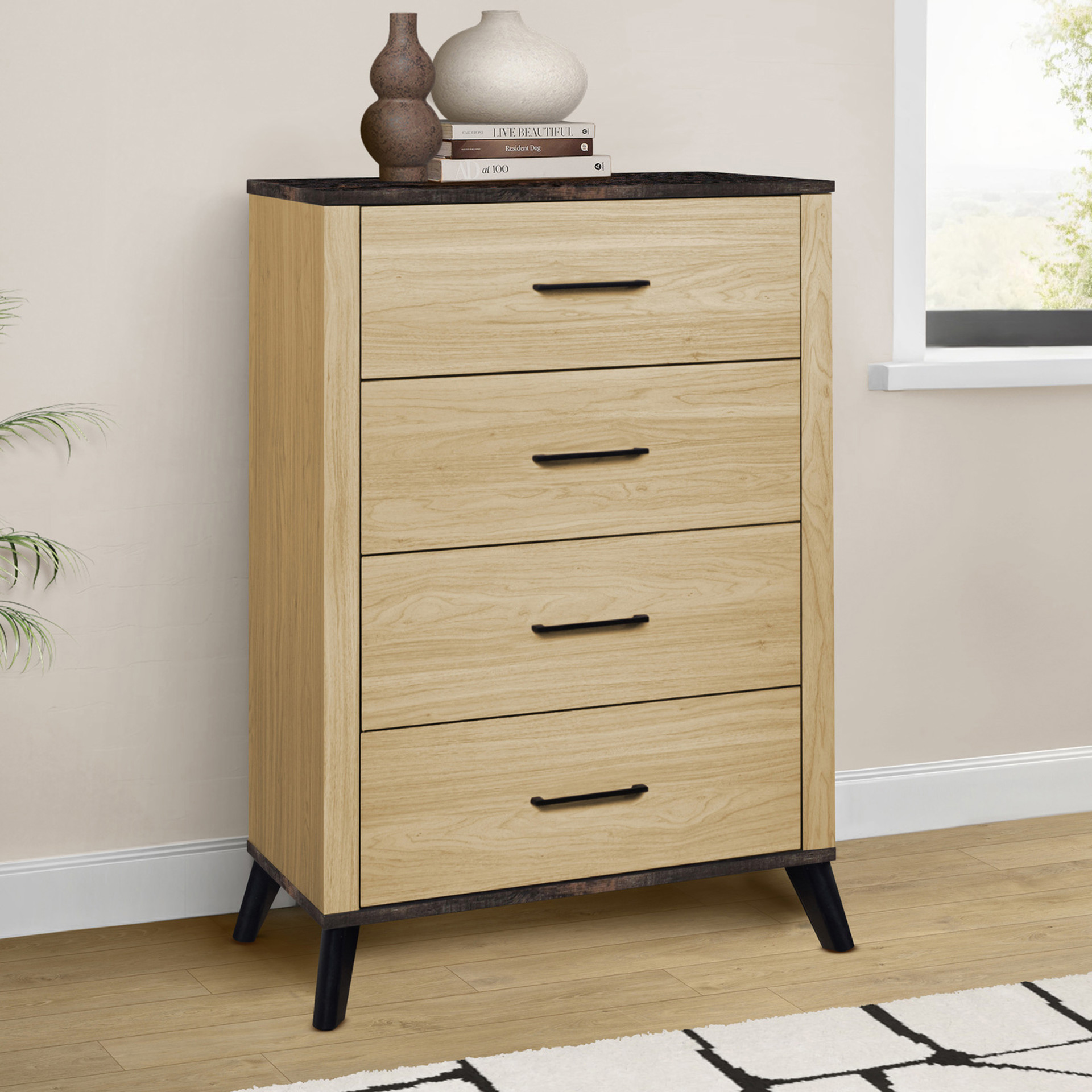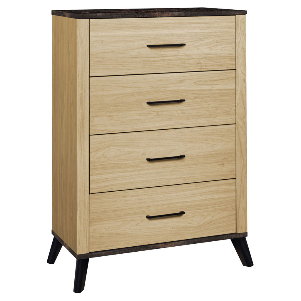 Crafted with an engineered wood frame in a light oak laminate finish and topped with a smooth black laminate surface, this dresser adds a touch of rustic elegance while blending seamlessly into a contemporary décor.