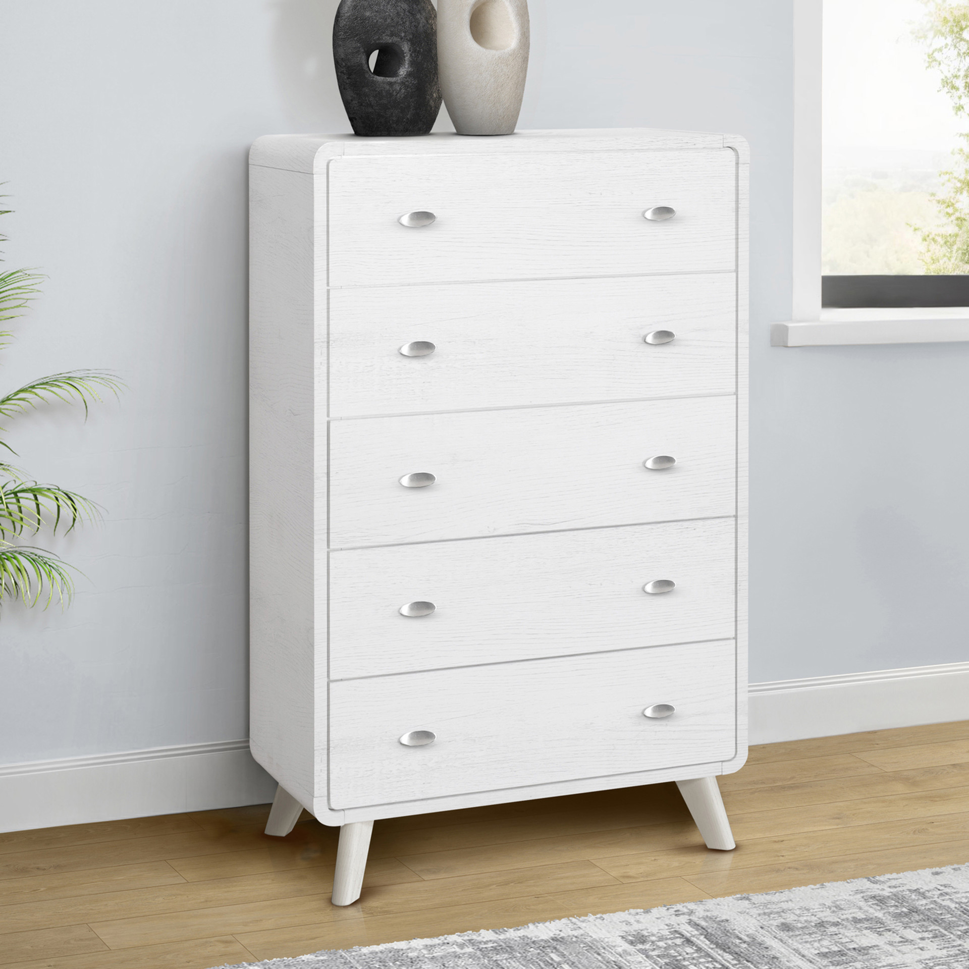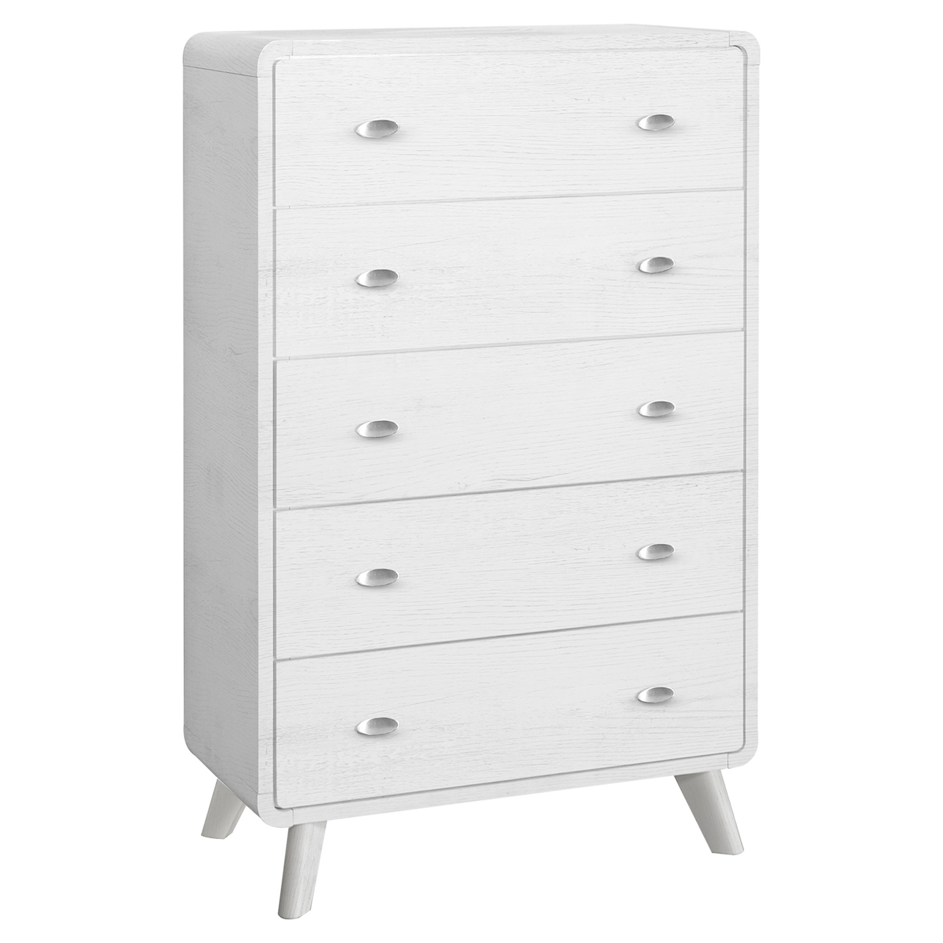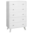 Organize and store your clothing with this elegant 5-drawer chest featuring a mid-century design that perfectly blends style and functionality. Finished in a smooth white oak laminate on all sides, this piece is durably crafted with an engineered wood frame and solid wood legs for added stability and strength.