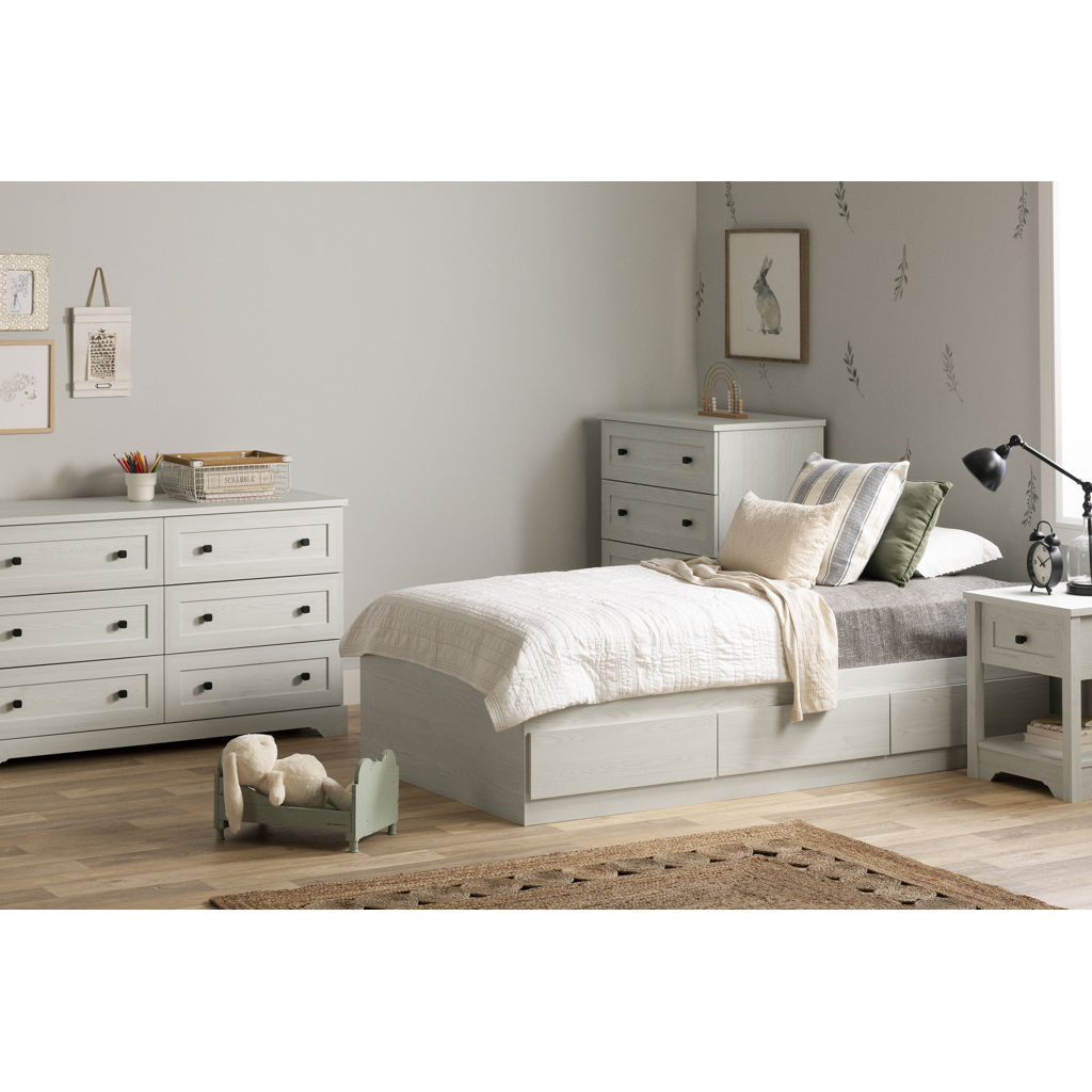 This Farmhouse-style dresser will create an uplifting atmosphere in your child's room. The framed drawers, decorative edge at the bottom, and small handles make it a perfect match with an ever-evolving unisex decor. Versatility is essential with growing kids! Place some beautiful family pictures on the surface, as well as a few stuffed toys to personalize your little one’s space.