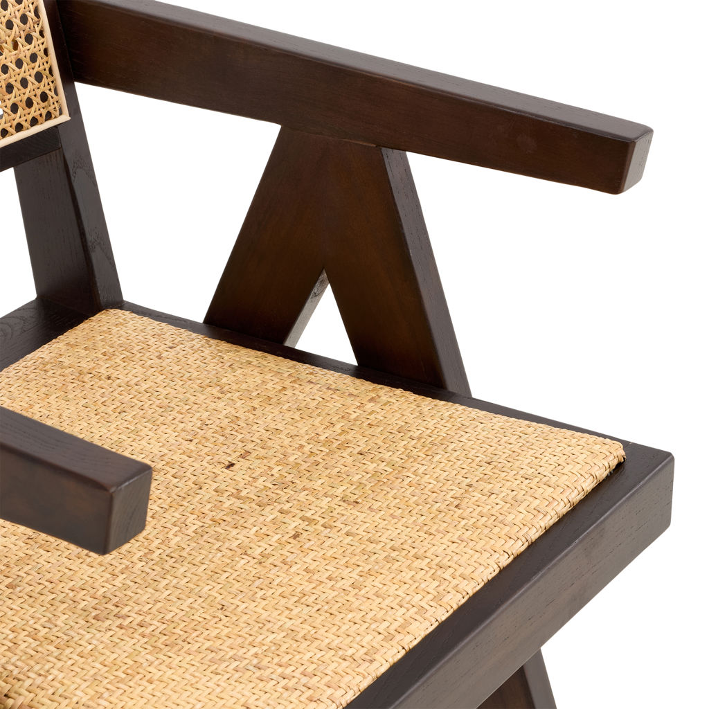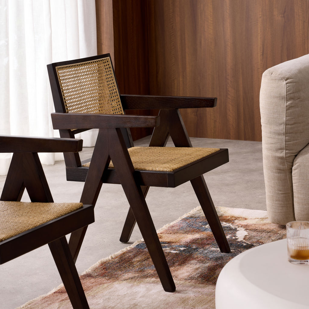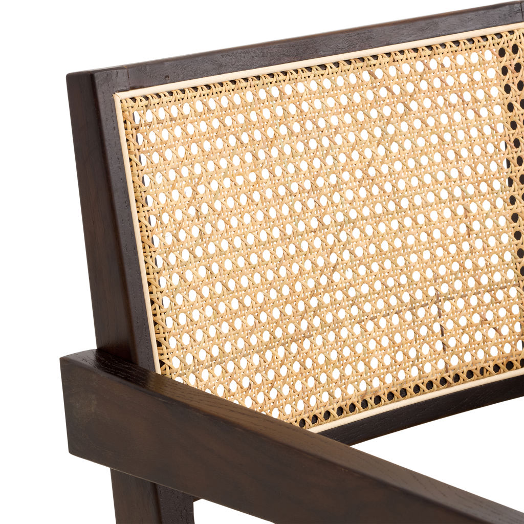 Embrace simplicity and balance with Takashi’s mid-century aesthetic, paired with the richly decadent contrast of dark brown elm and natural rattan.