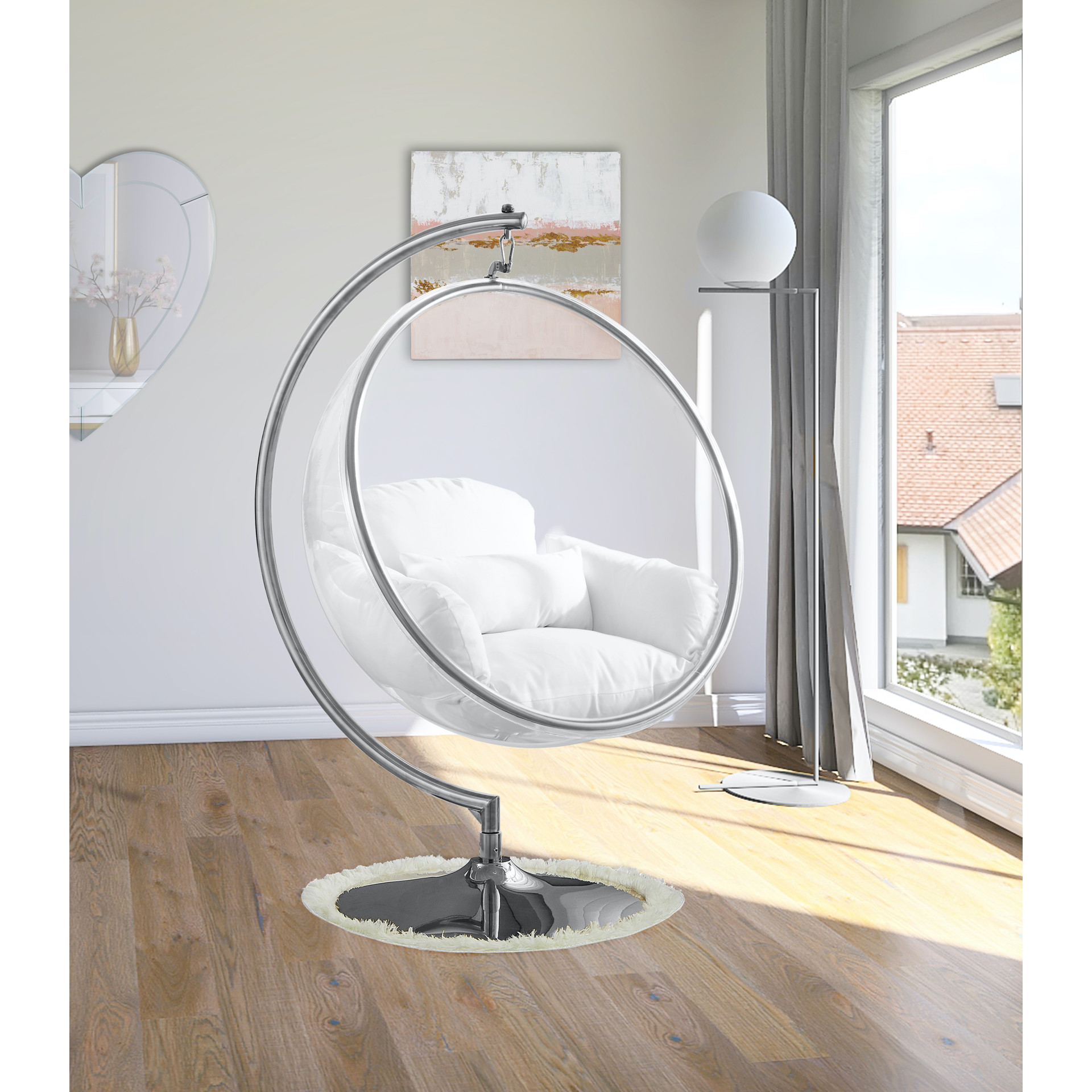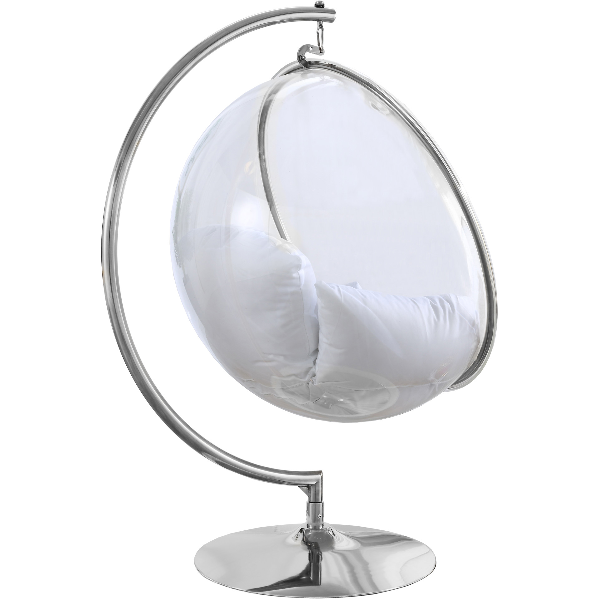 Retreat to your own little bubble, literally, in this Luna acrylic swing bubble accent chair. What a modish addition to your living room, bedroom or other space! This Luna chair features an acrylic egg-style seat topped with white fabric-covered cushions for supreme comfort. The chrome metal base and frame provides sturdy support so that you can chillax to your hearts content in your very own sanctuary.