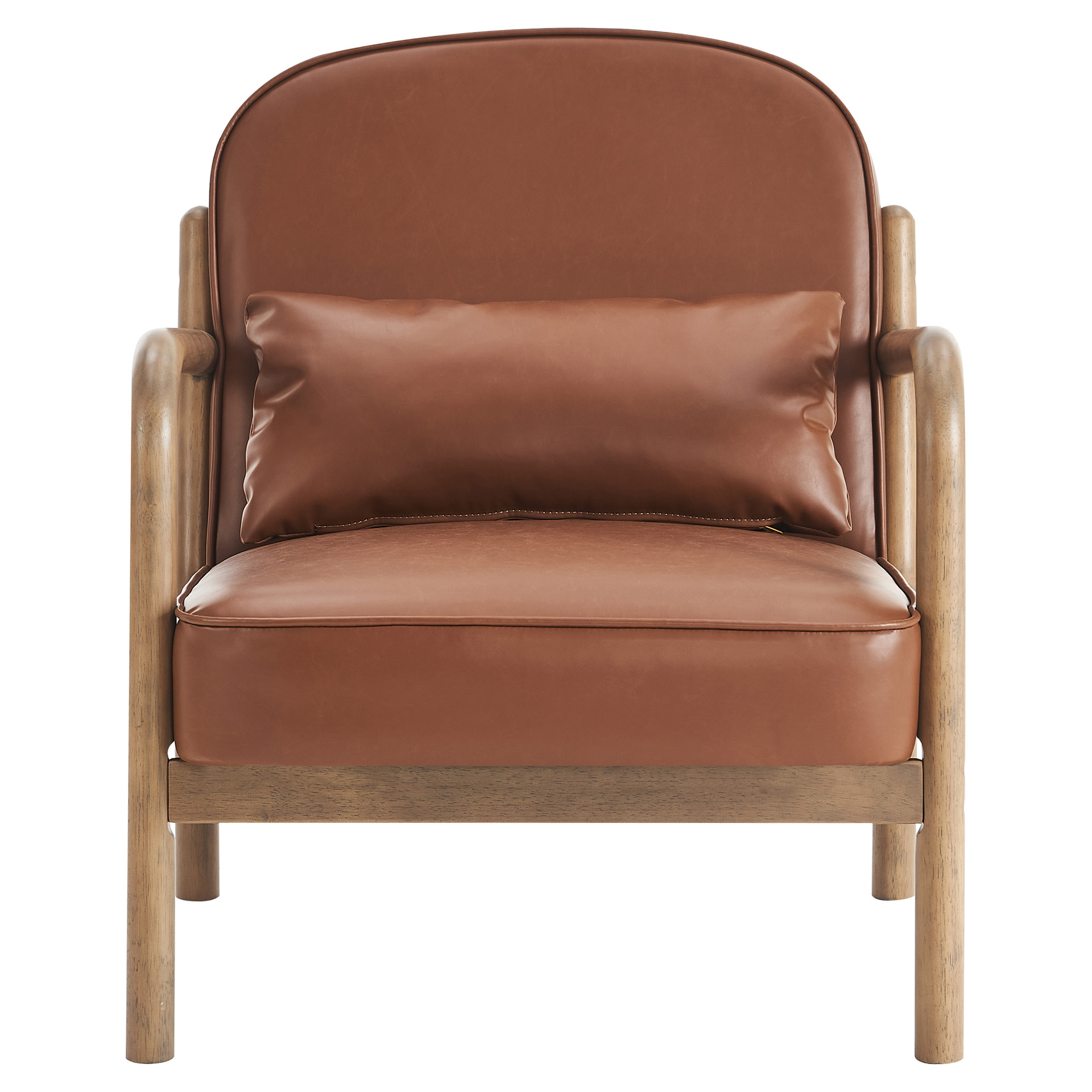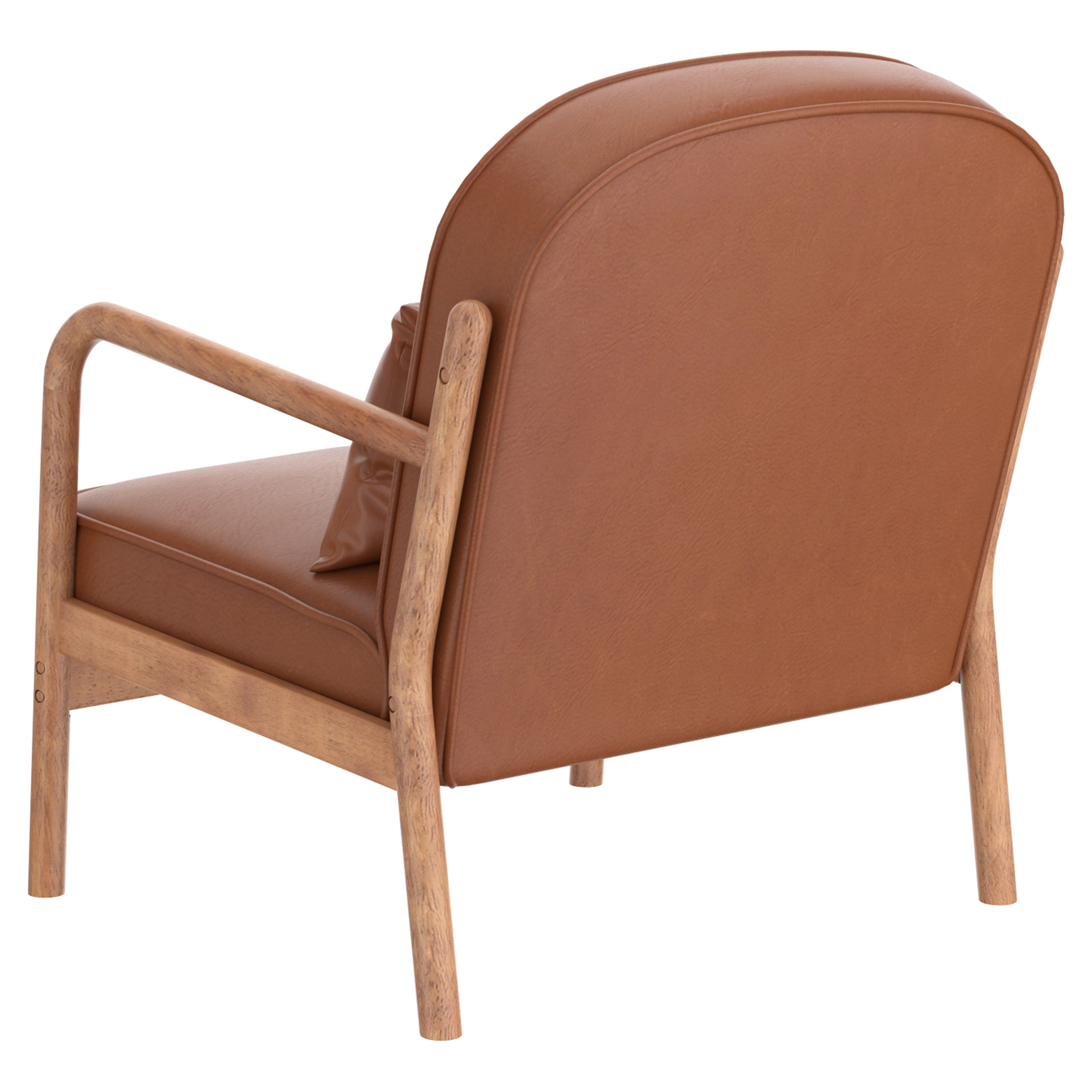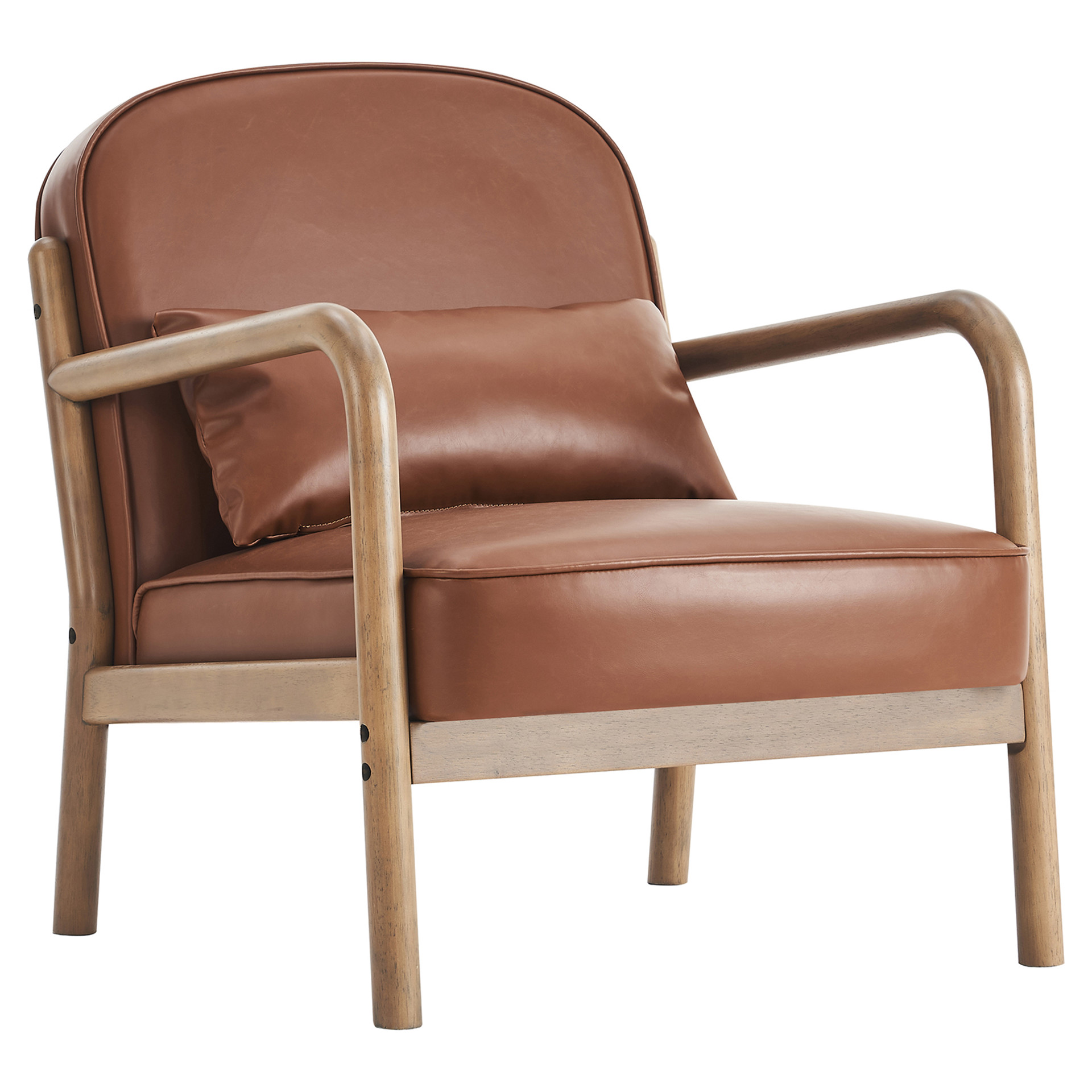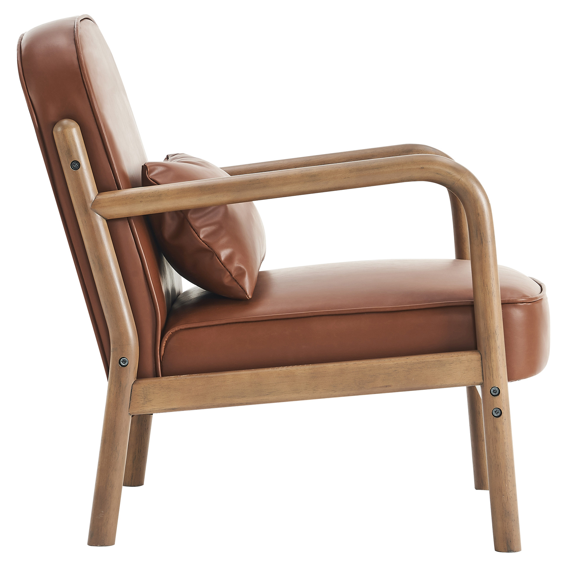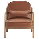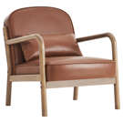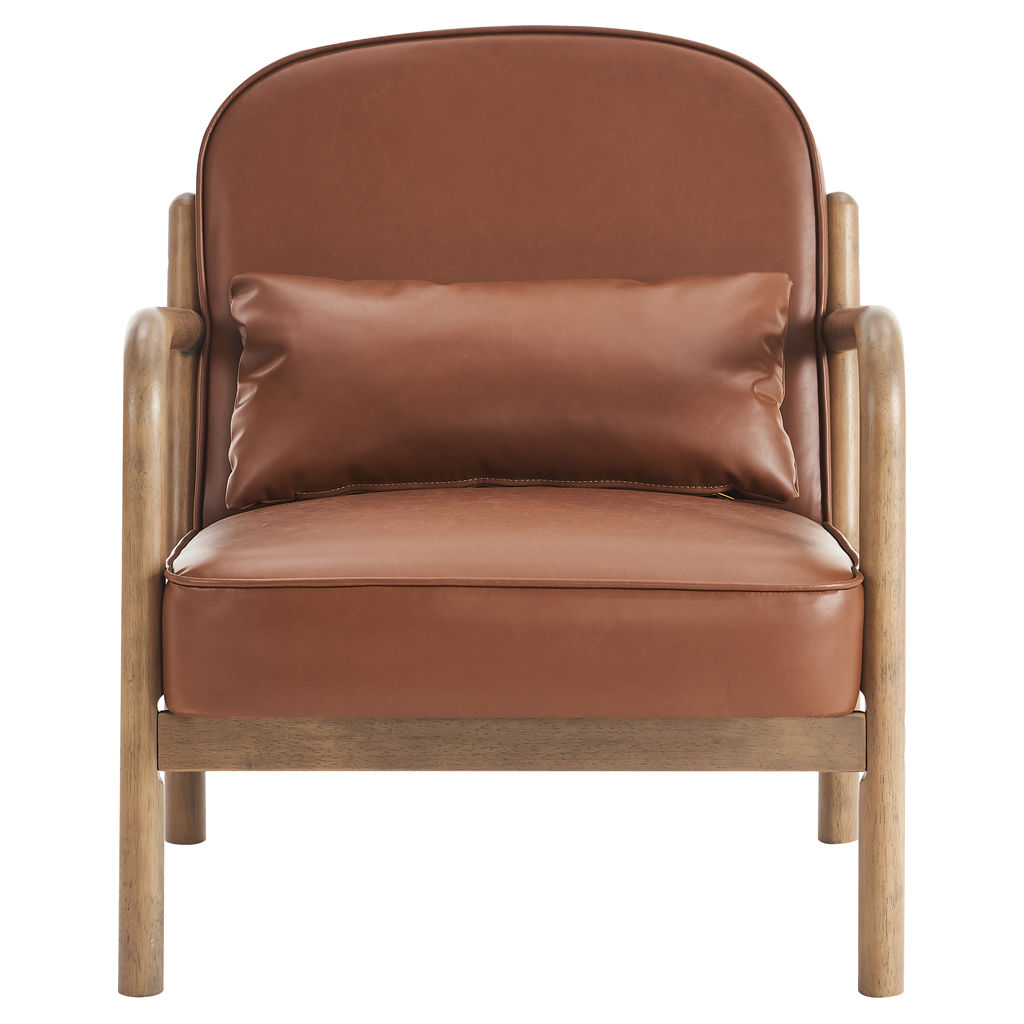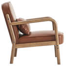 This armchair masterfully combines timeless elegance with modern comfort. Its matte brown faux leather pairs beautifully with the natural wood frame and clean lines, creating a striking visual balance.