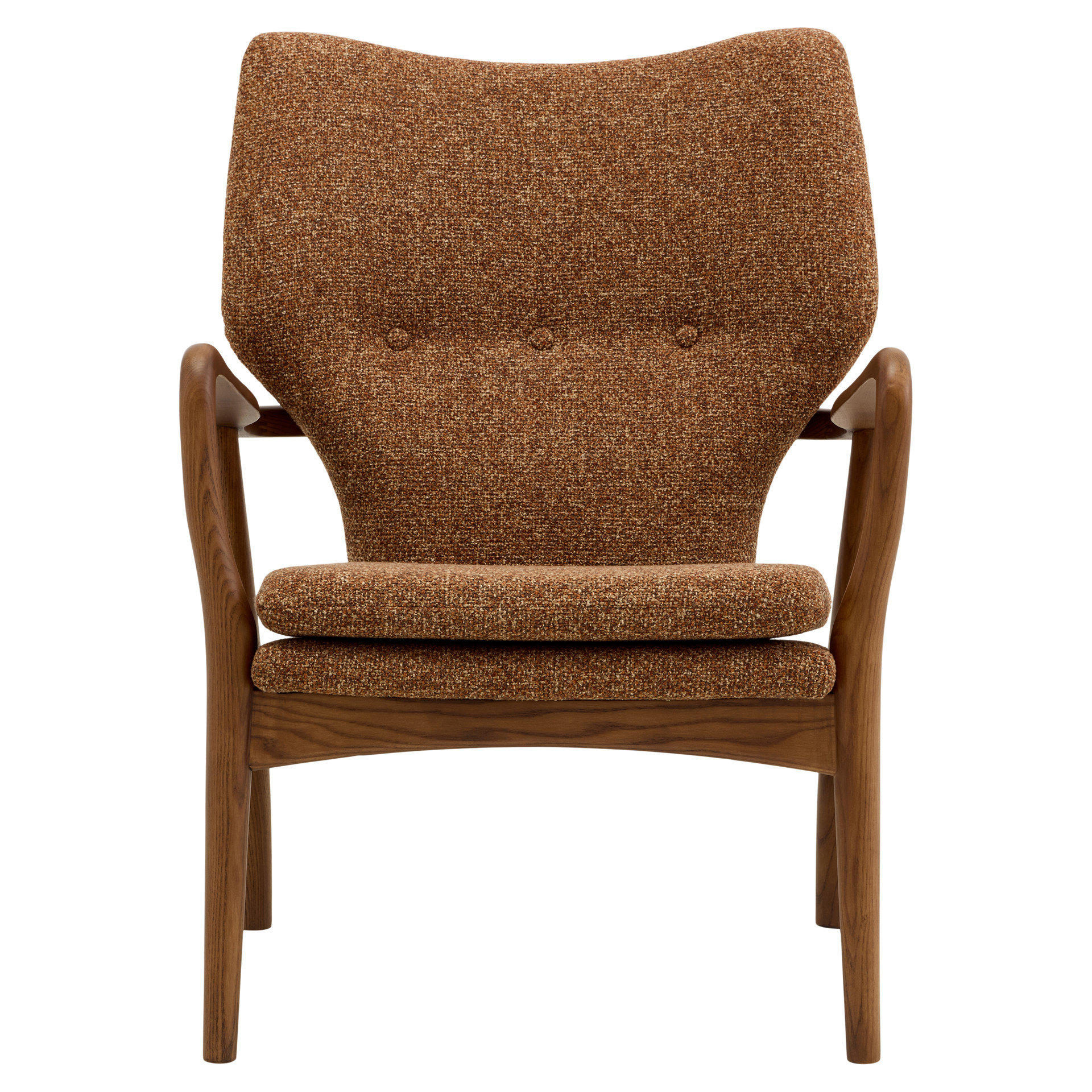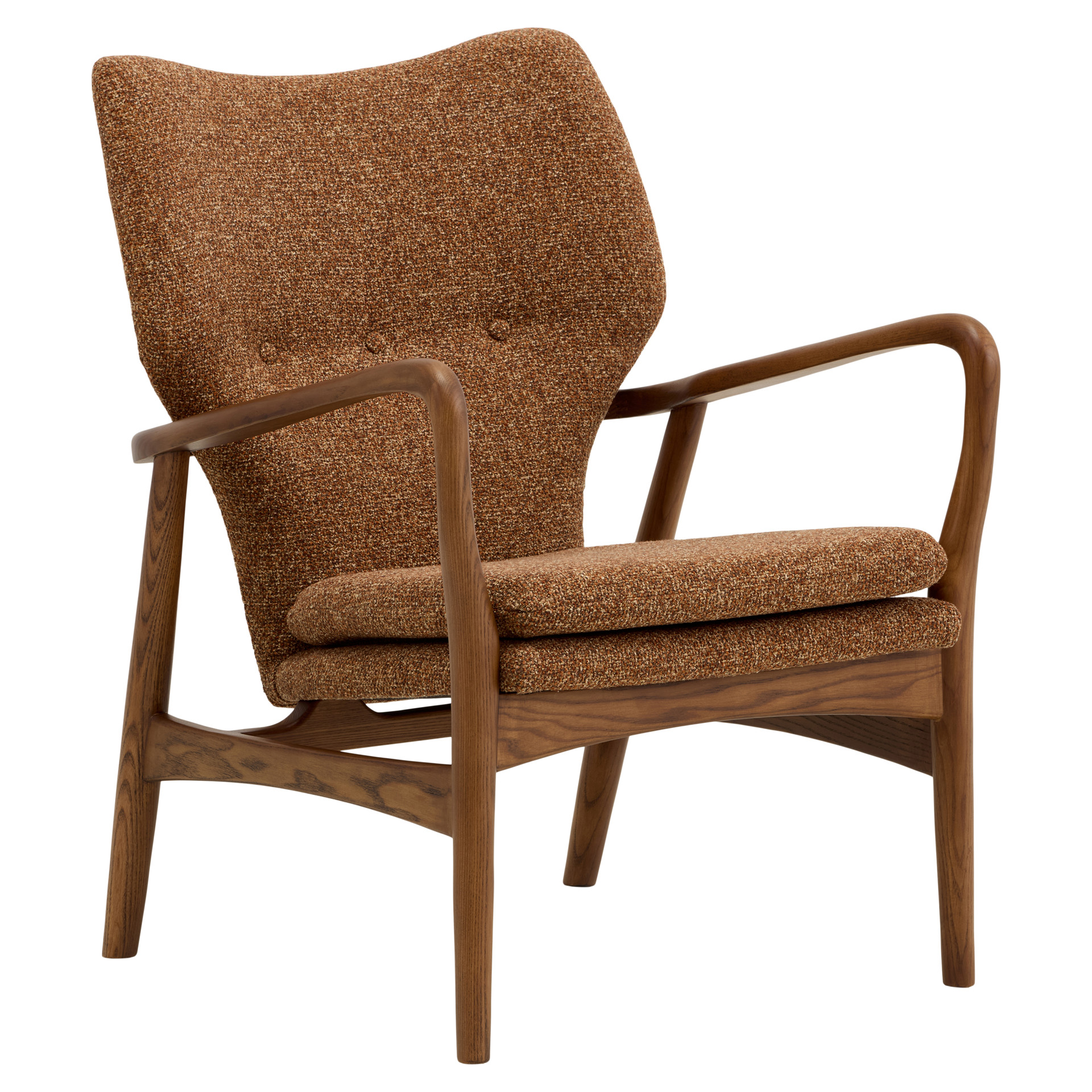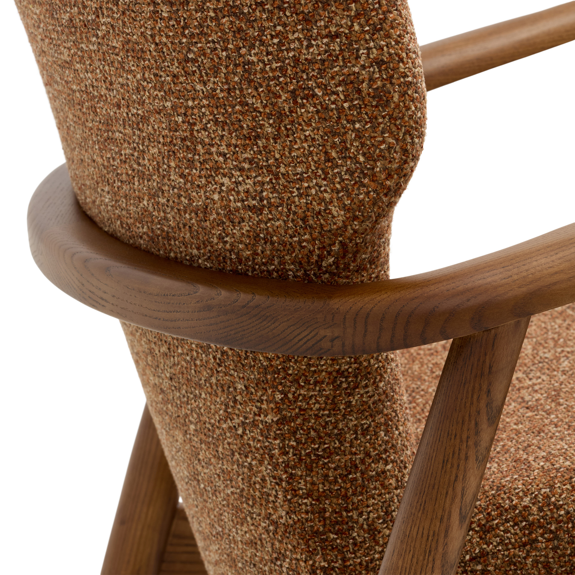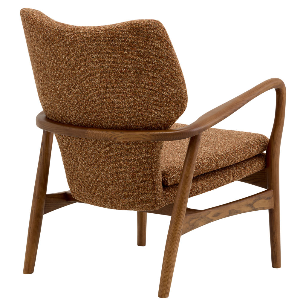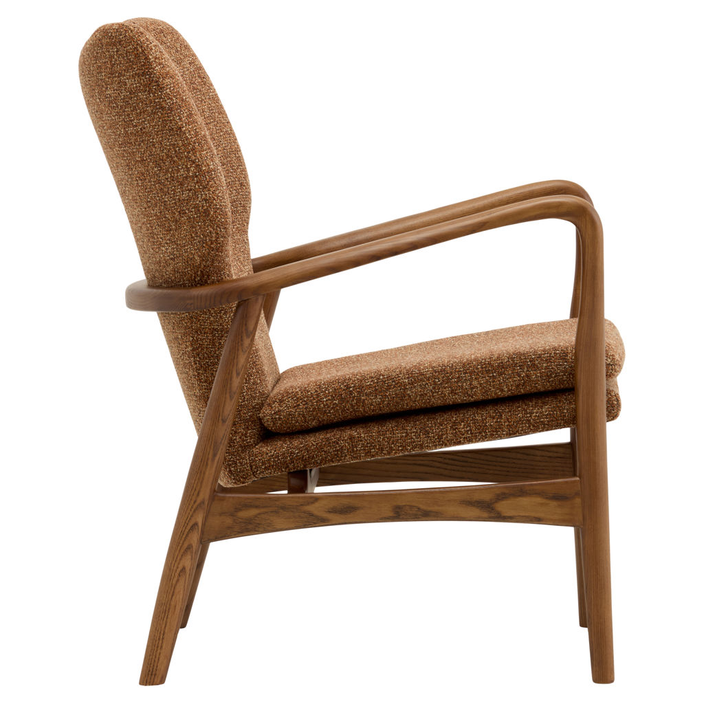 The INGRID chair is the elegant counterpart to our INGE chair, featuring gracefully curved wooden arms and luxurious copper-toned bouclé fabric upholstery. Its size and design allow it to blend seamlessly into nearly any décor. The only thing better than having one INGRID chair in your home is having two.