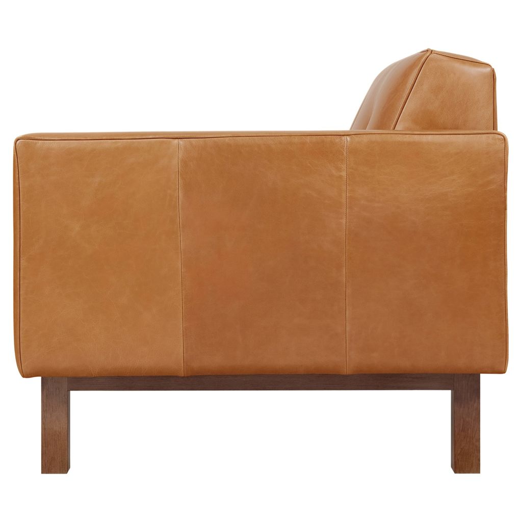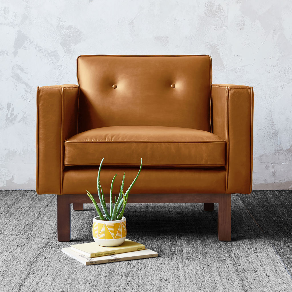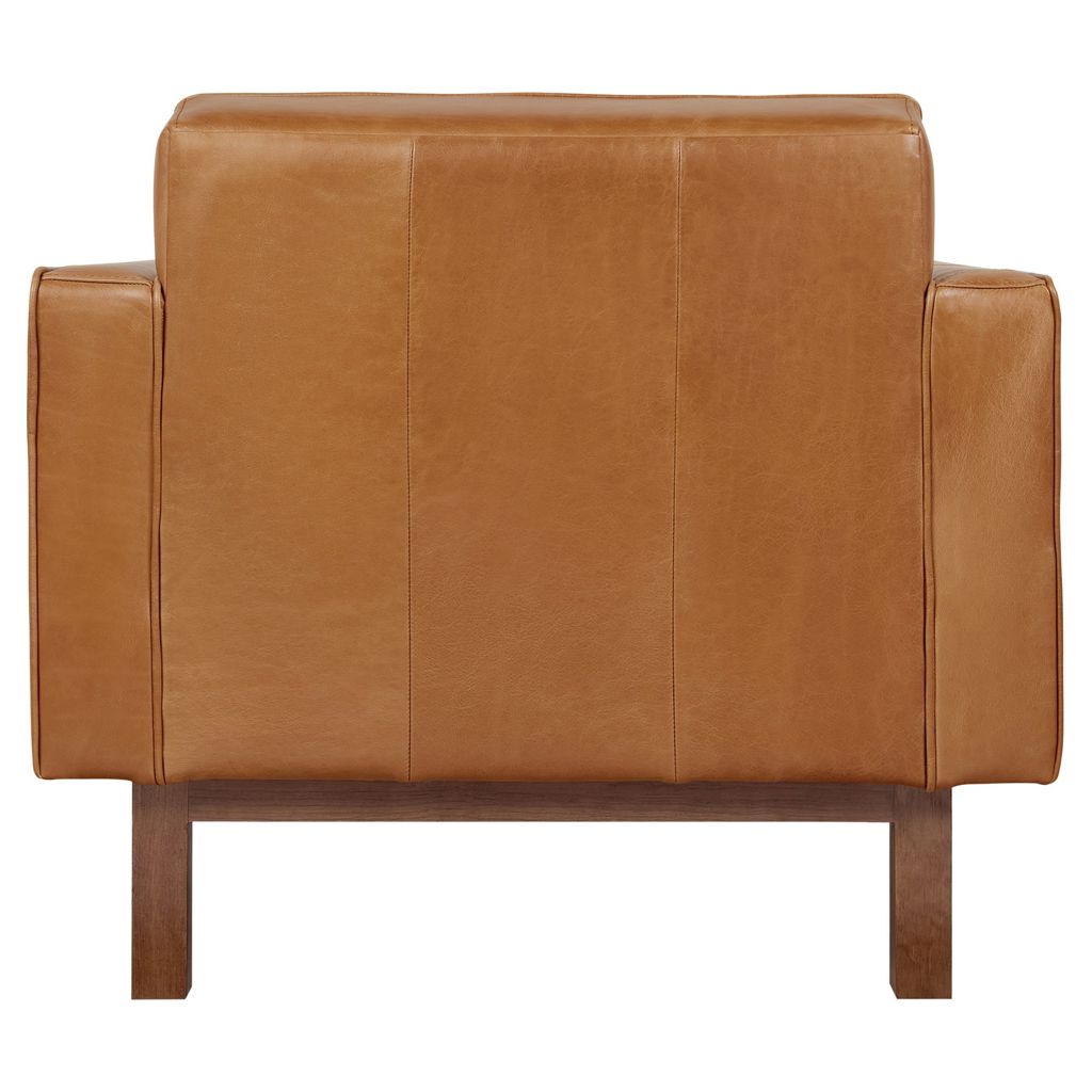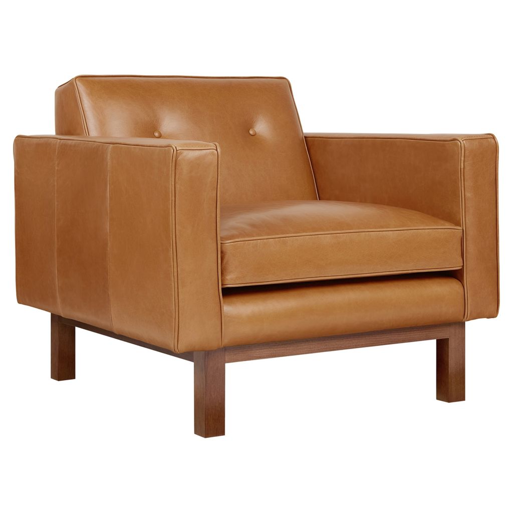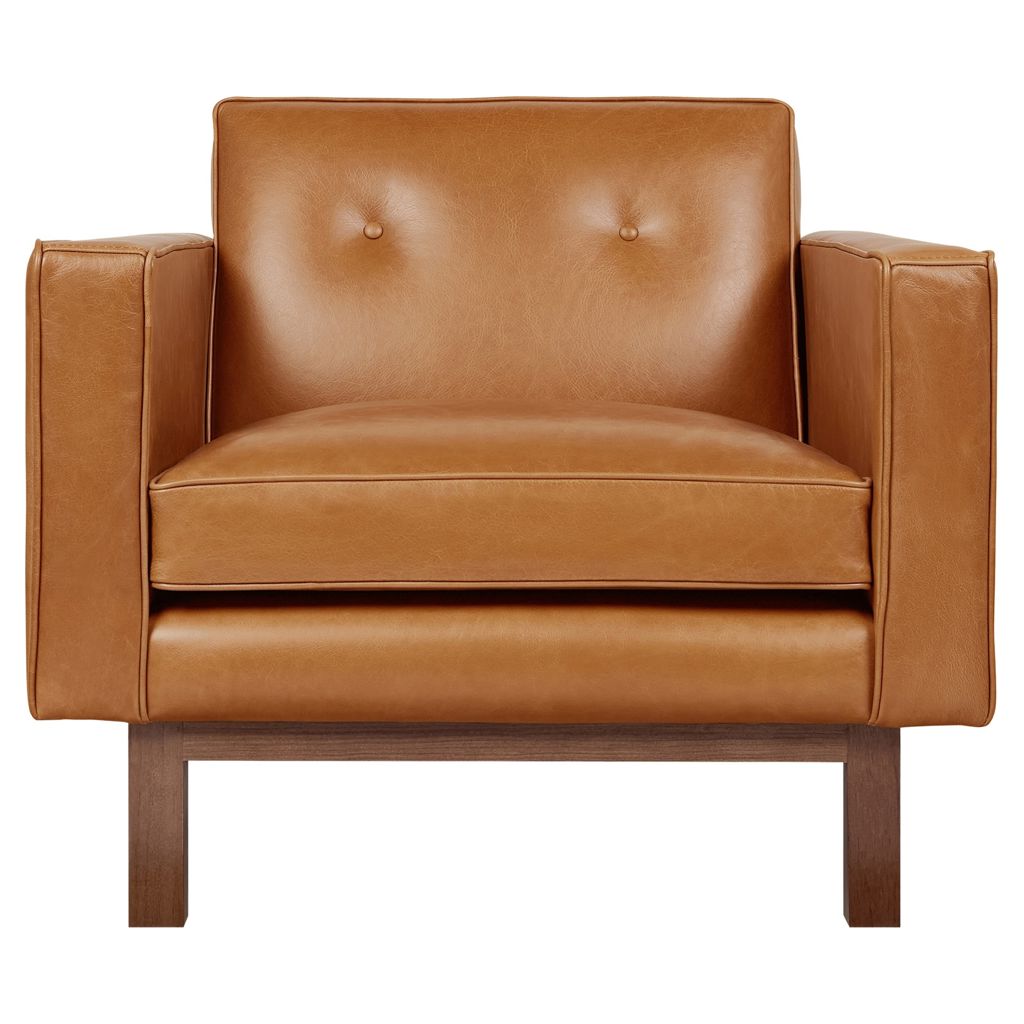 The structure rests on a recessed solid wood base, and the chair is offered in two classic leathers, each chosen for its unique natural grain that will age beautifully, developing a rich, authentic patina over time.