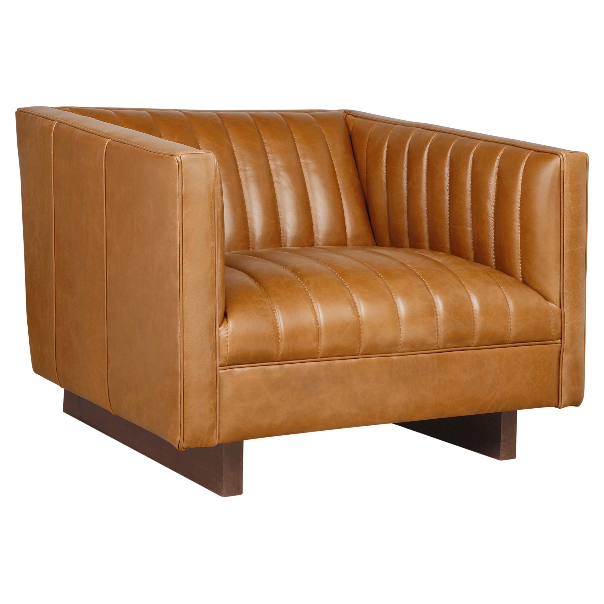The Wallace Chair is a modern reinterpretation of the classic English Chesterfield design. Channel-stitched leather upholstery on the seat, back, and arms creates a surface that’s both visually striking and remarkably comfortable.