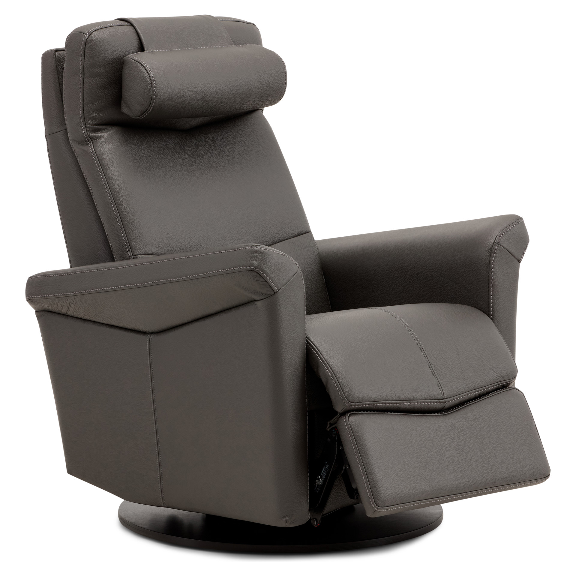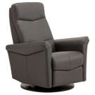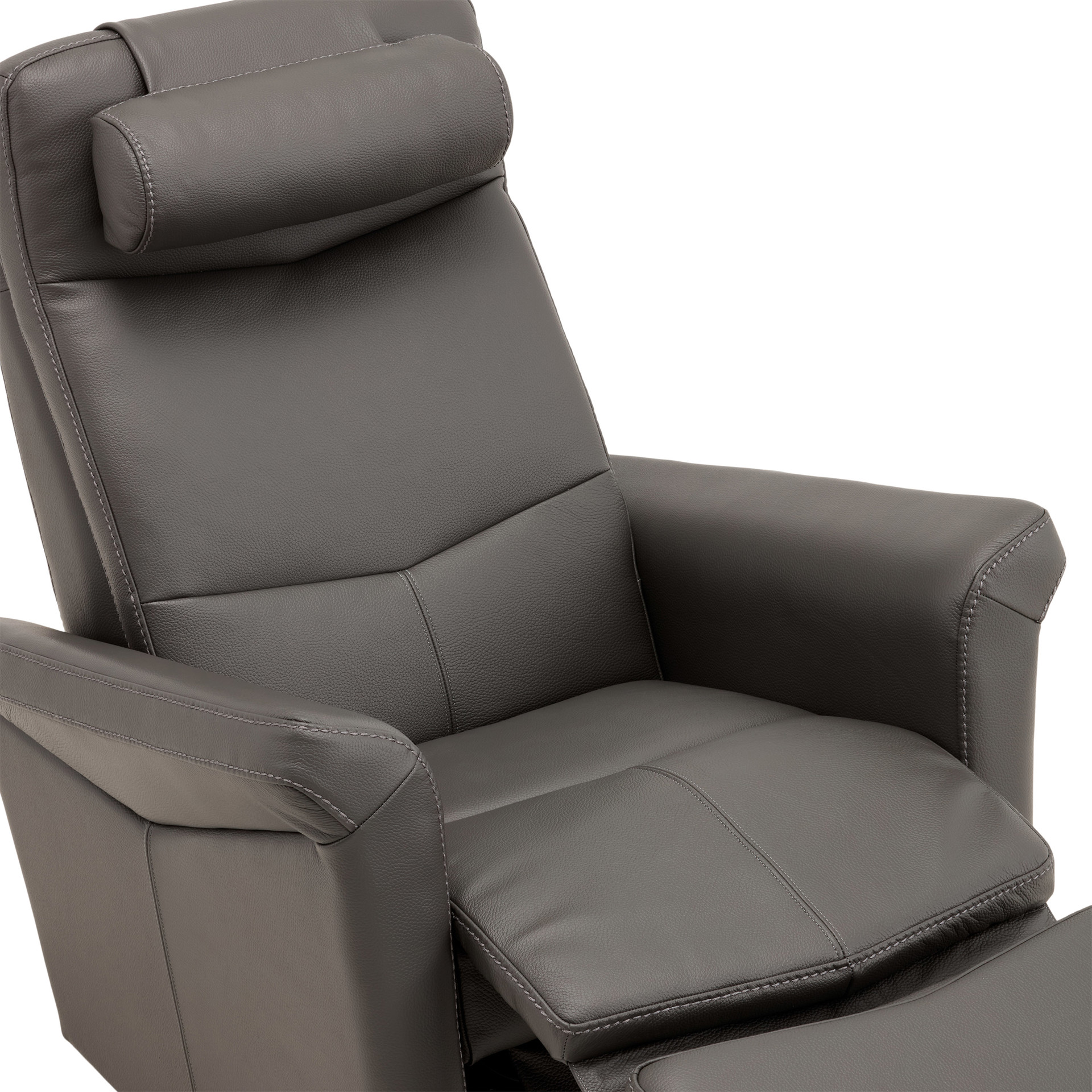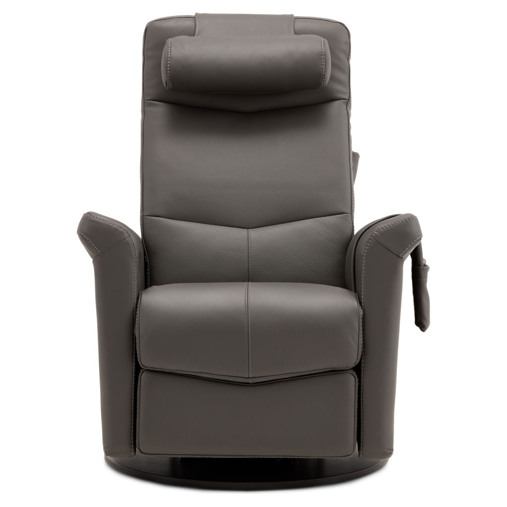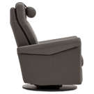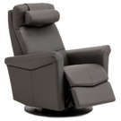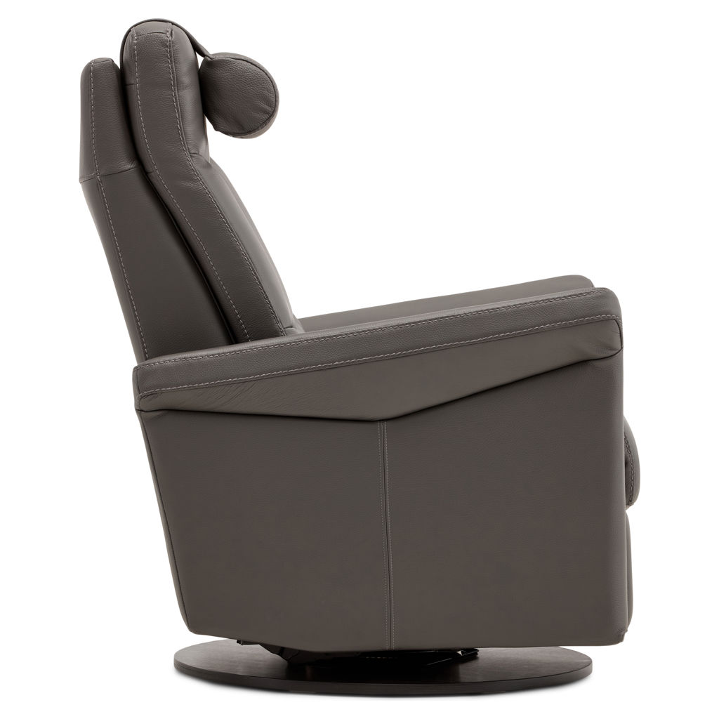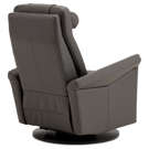 Swivel, rocker and recliner chair with heated backrest with heat intensity and lumbar support. Push-button-controlled, powered full-leg reclining footrest with USB port. Round cushion for headrest included.