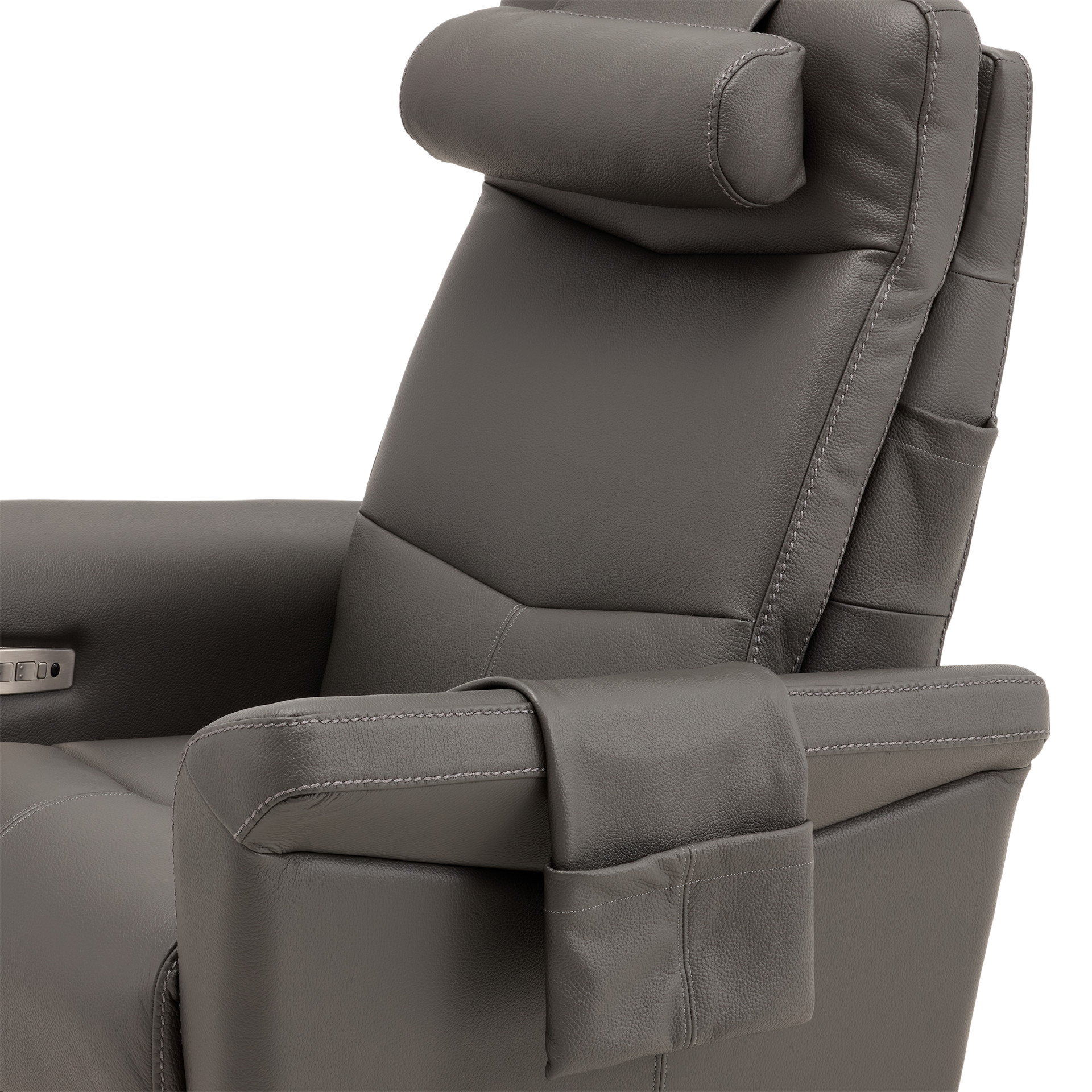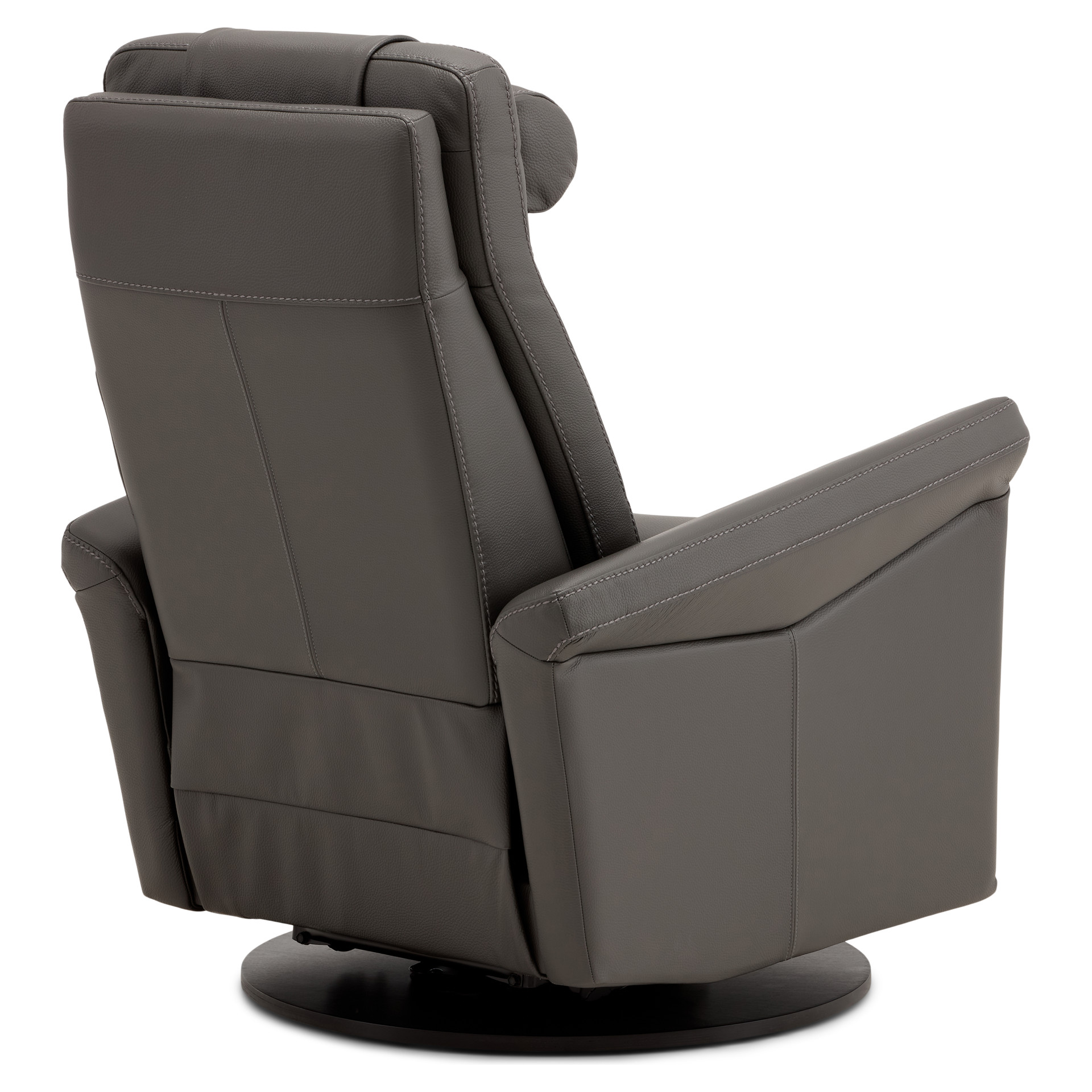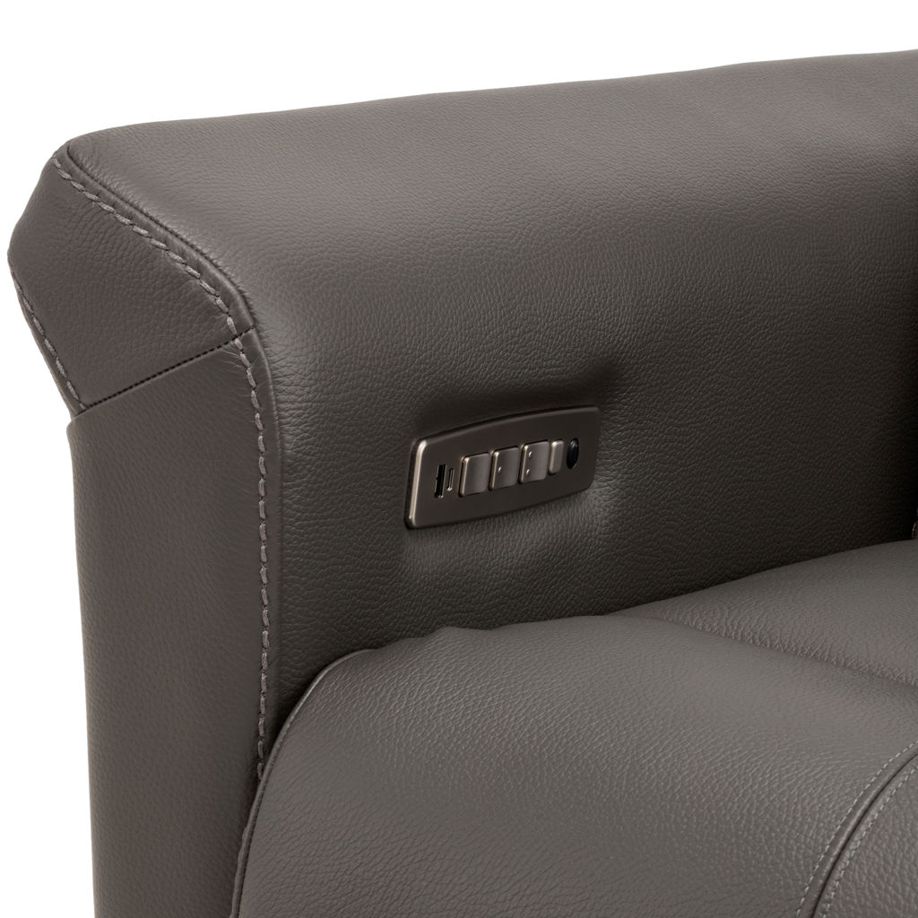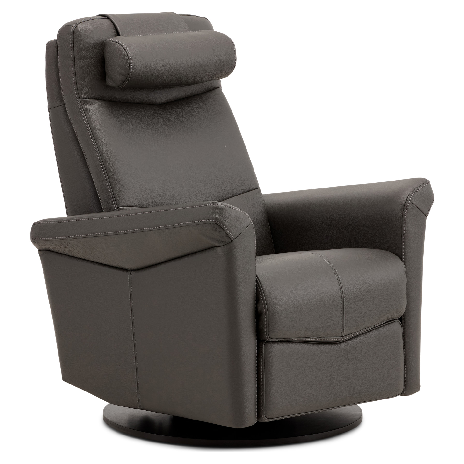 Swivel, rocker and recliner chair with heated backrest with heat intensity and lumbar support. Push-button-controlled, powered full-leg reclining footrest with USB port. Round cushion for headrest included.