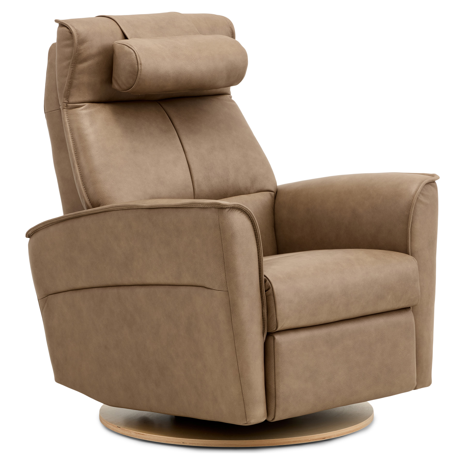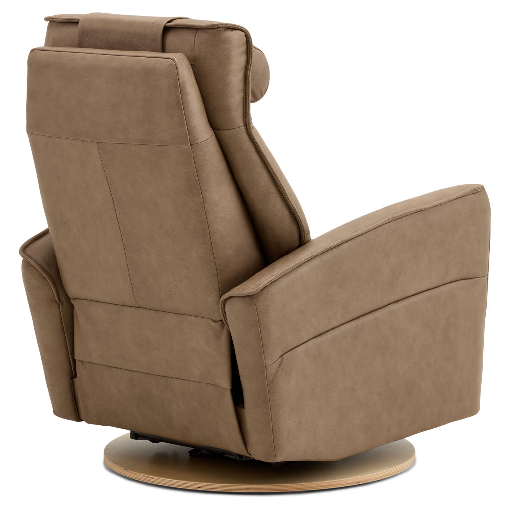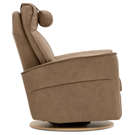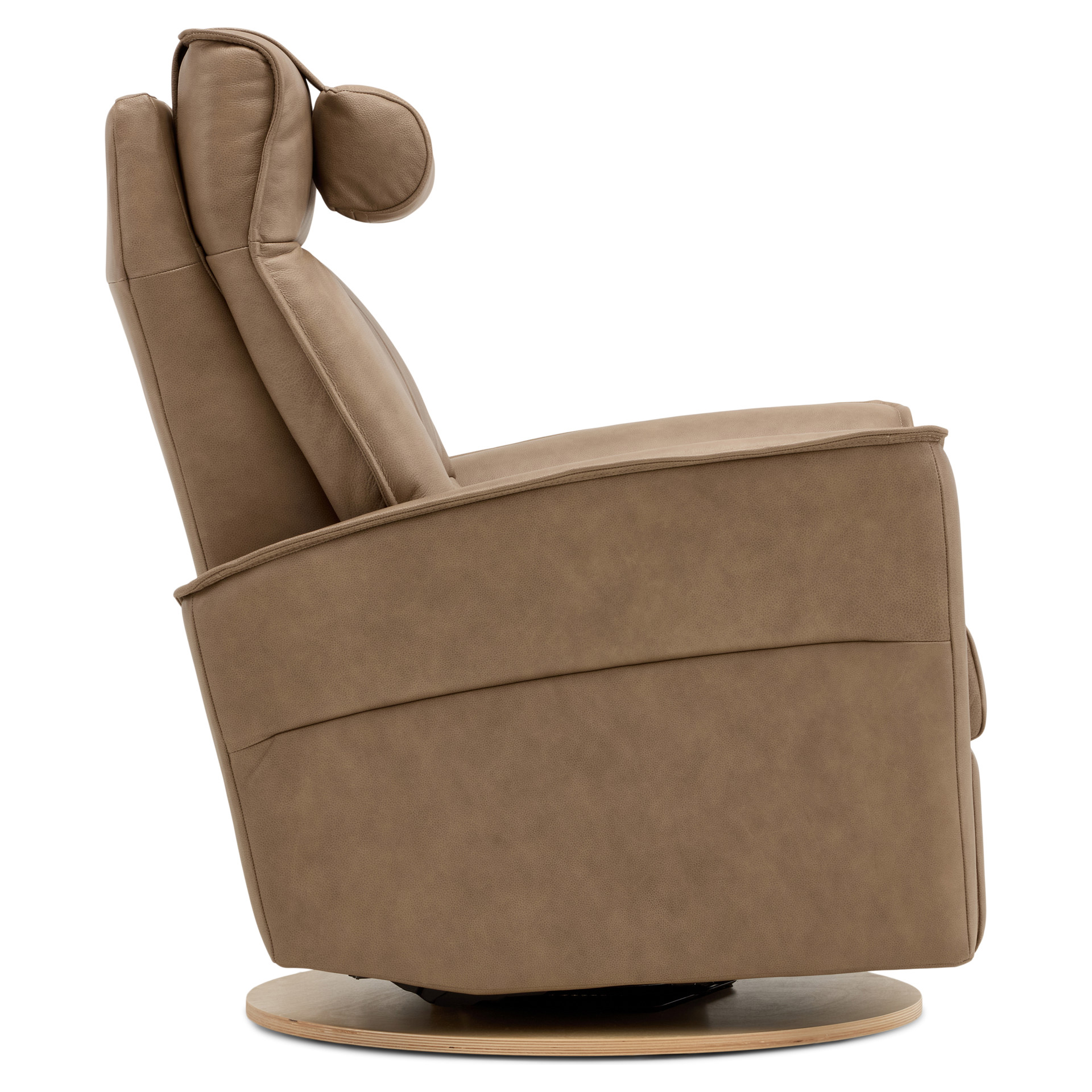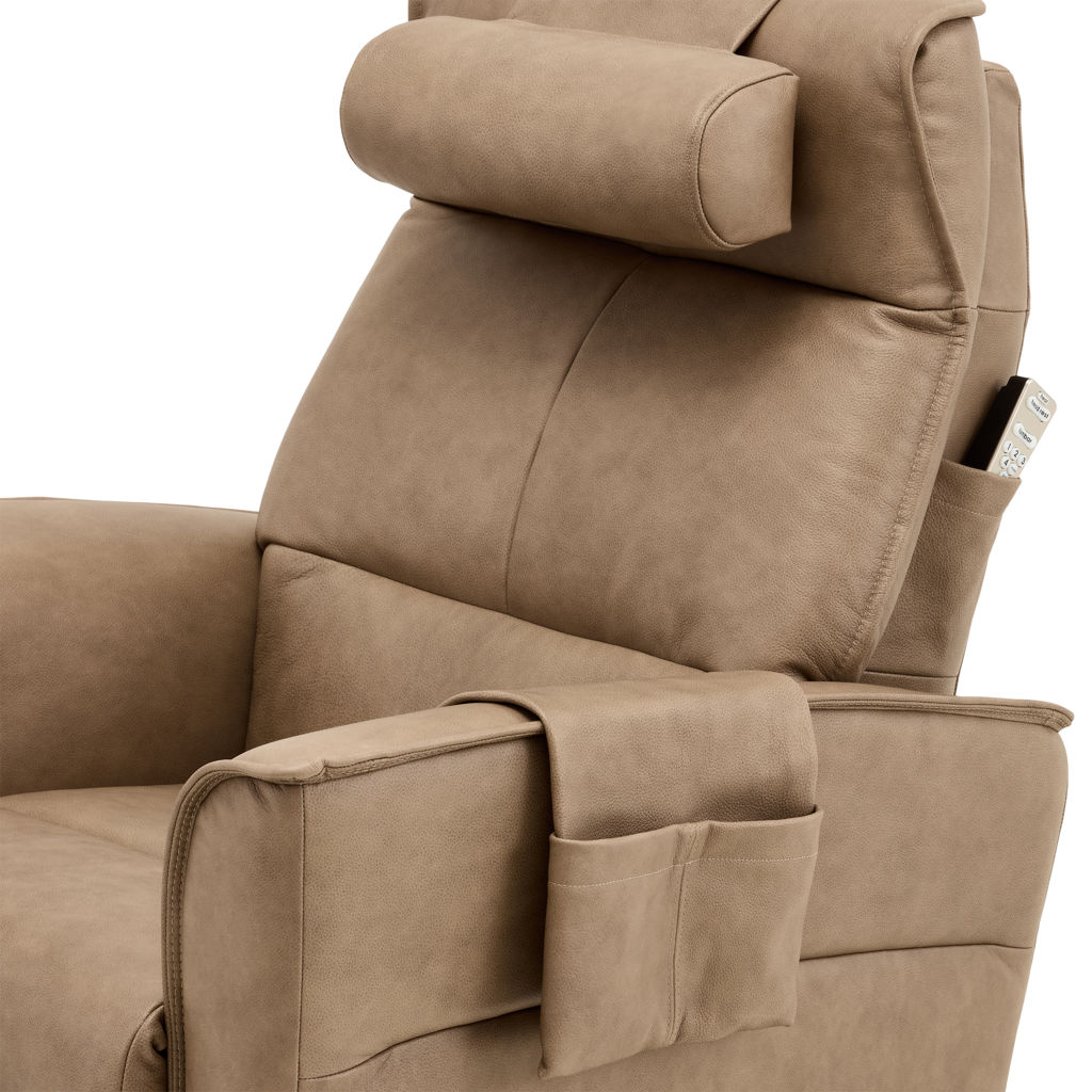 This swivel, rocker recliner chair featuring a 4-zone massage system with 3 different modes, as well as a heated back with heat intensity and lumbar support. Wireless remote control for massage system and electric headrest included. Push-button-controlled full-leg power reclining footrest with USB port. Round cushion for headrest included.