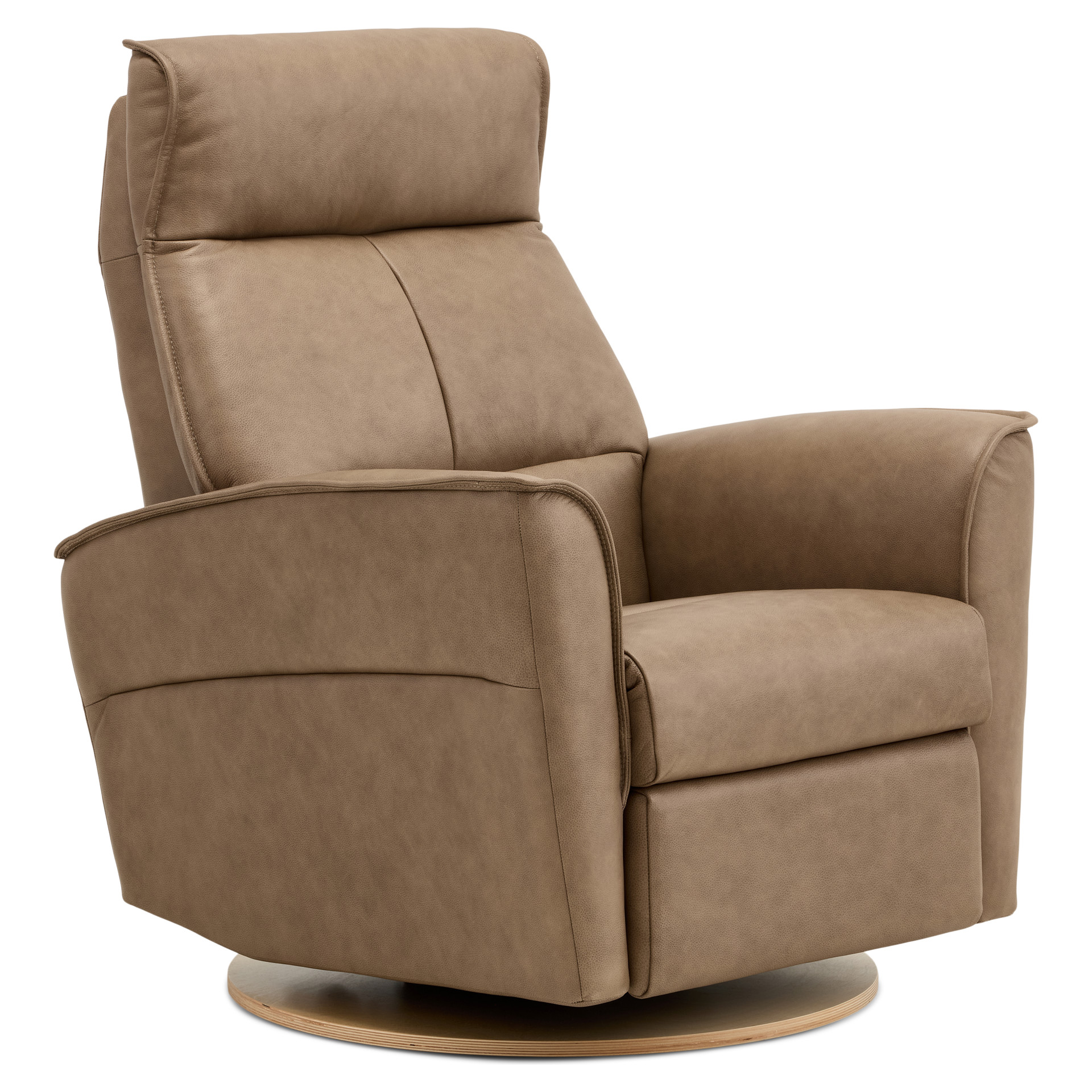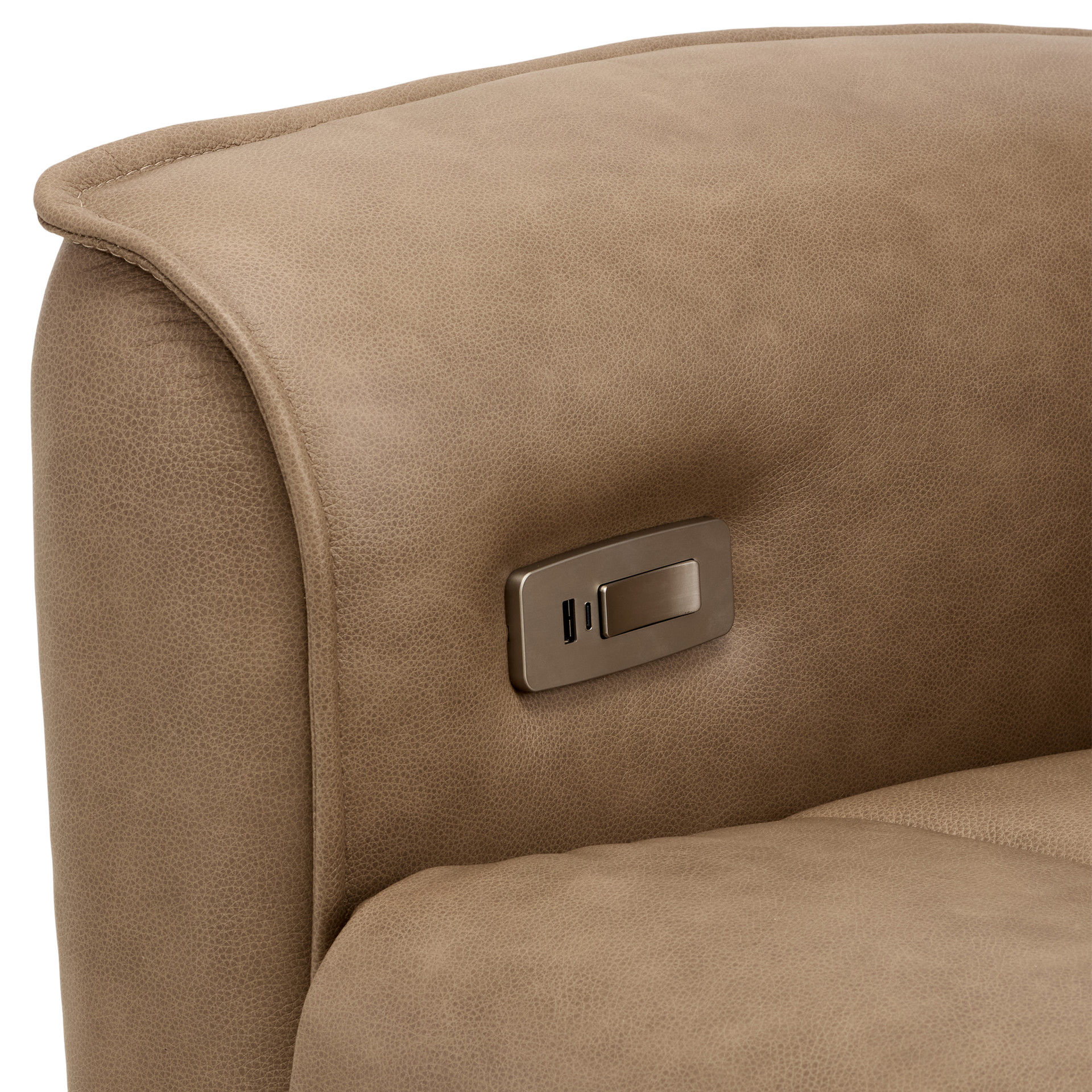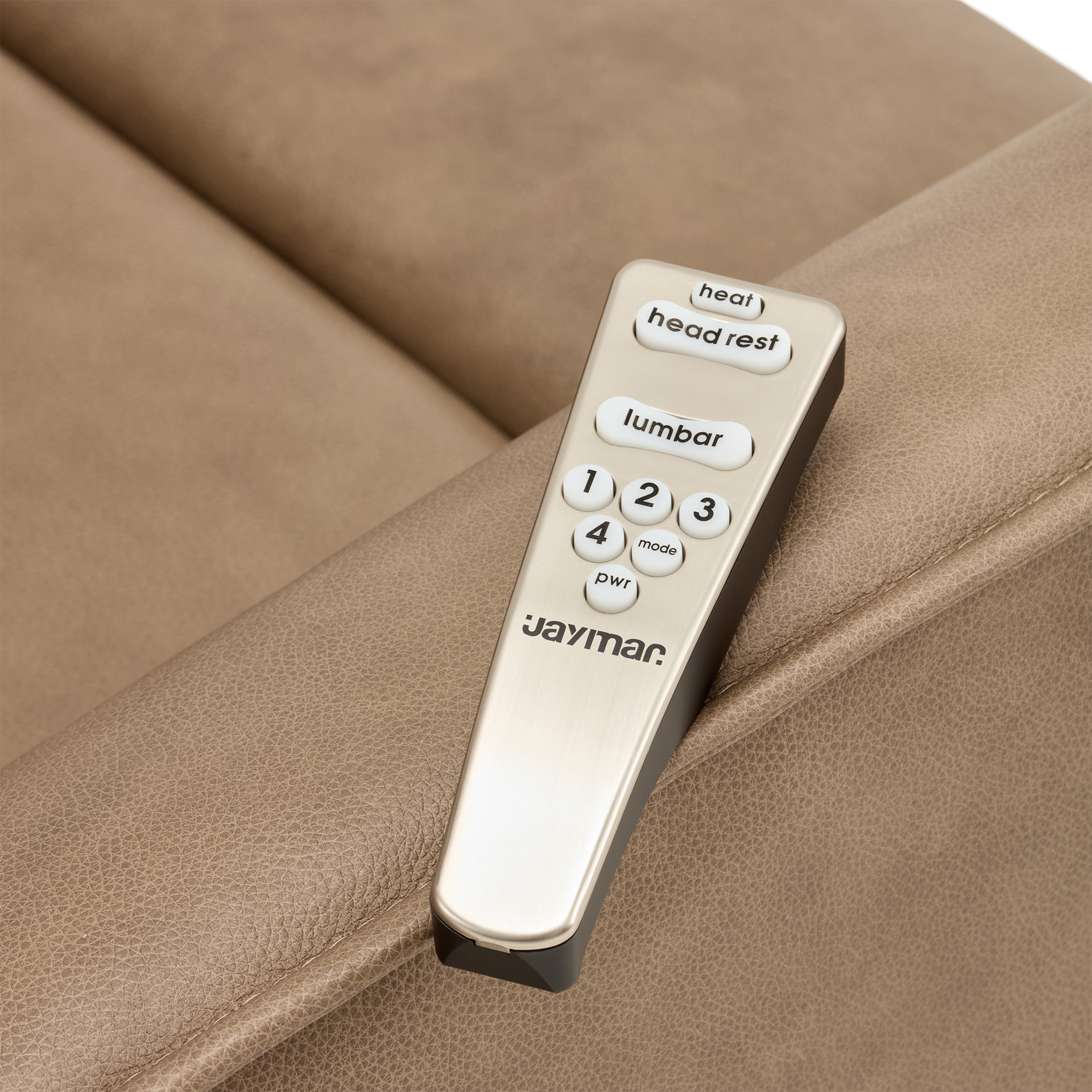 This swivel, rocker recliner chair featuring a 4-zone massage system with 3 different modes, as well as a heated back with heat intensity and lumbar support. Wireless remote control for massage system and electric headrest included. Push-button-controlled full-leg power reclining footrest with USB port. Round cushion for headrest included.