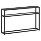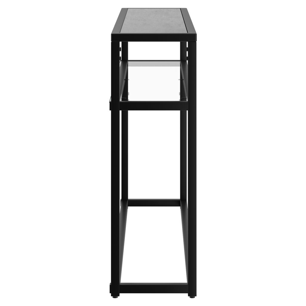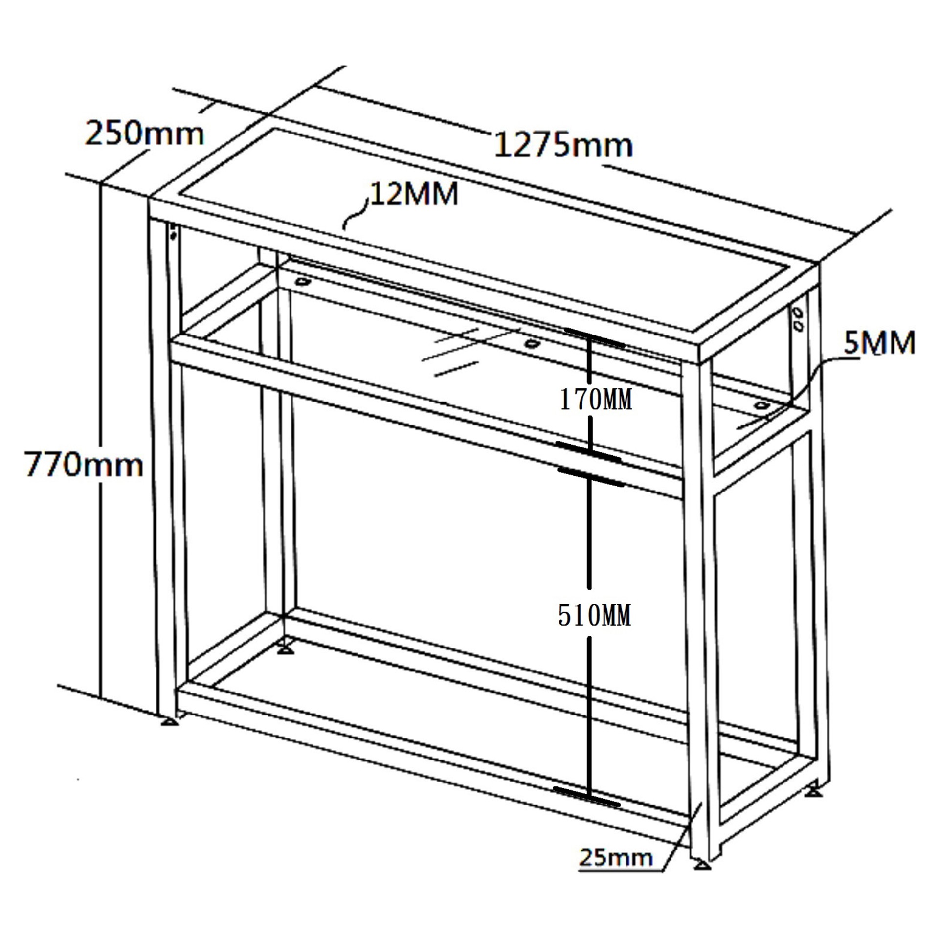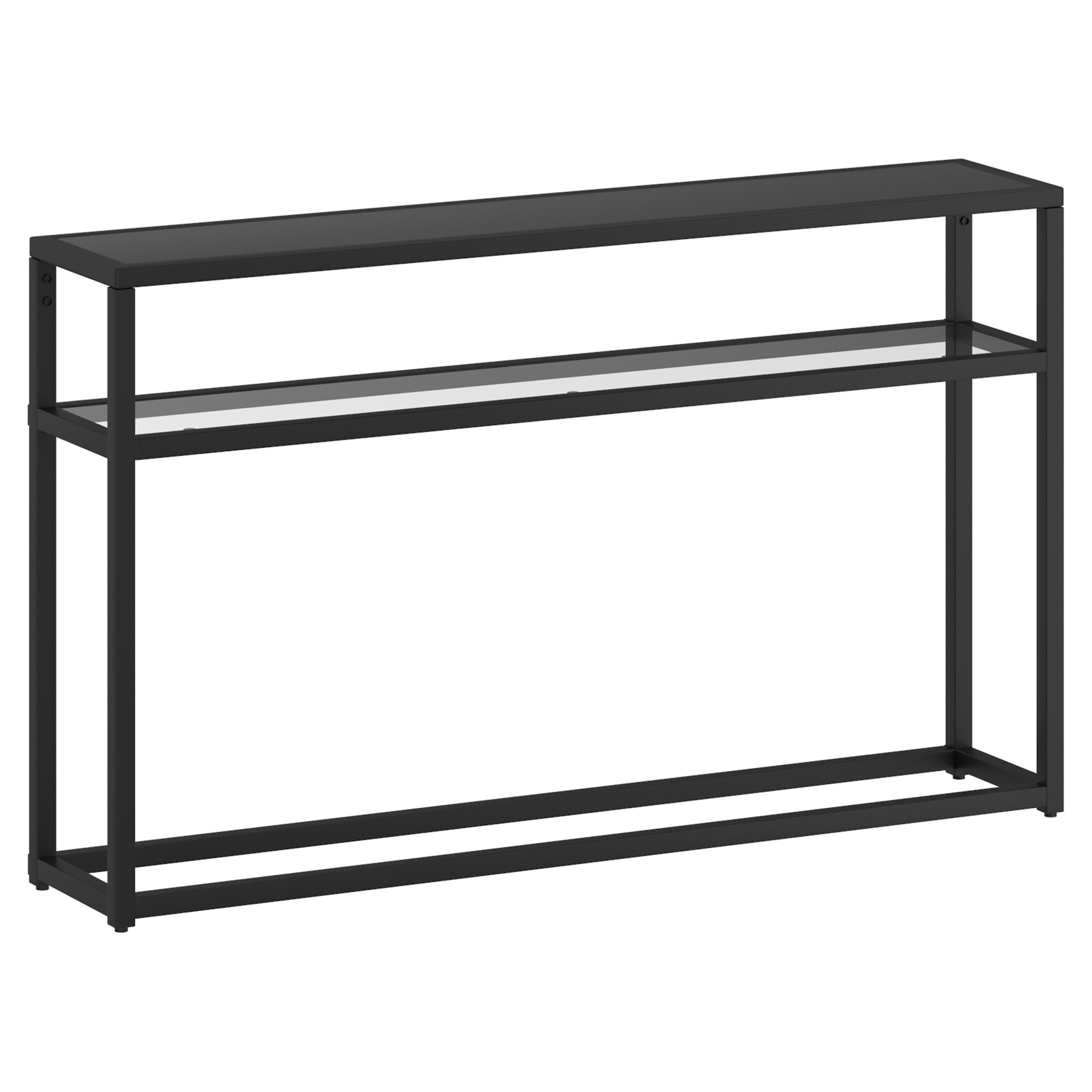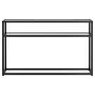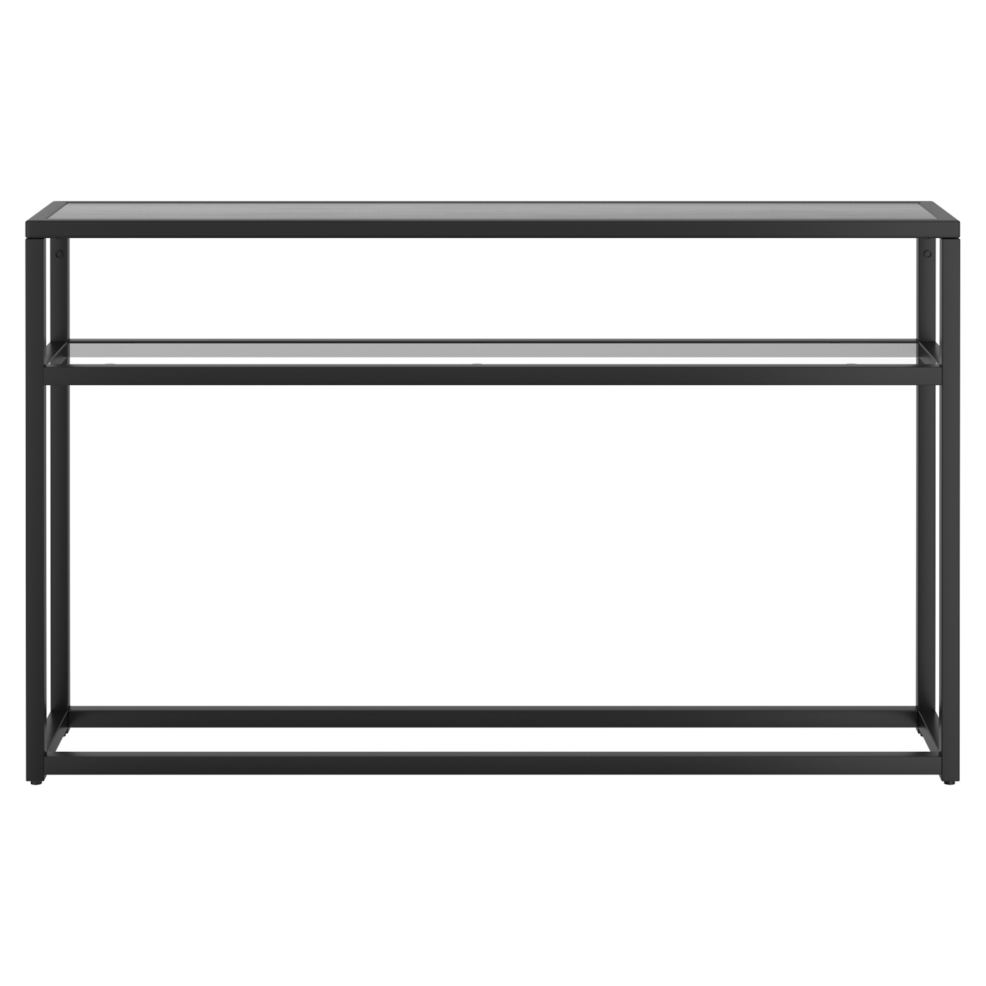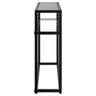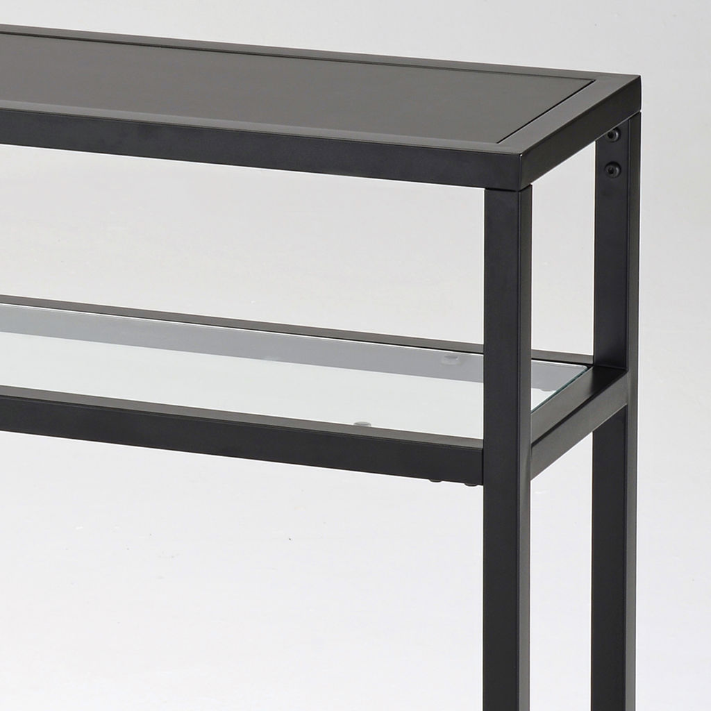 The clear glass bottom shelf perfectly complements the all-black finish of the square metal framed MDF top shelf.