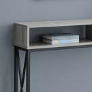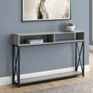 Adding plants, baskets, books or other decor items to the entryway, living room or bedroom? Featuring 2 open shelves, this console table is a stunning combination of grey wood look tones with a sturdy X-design black metal frame to pair with any style. Also including a bottom panel for additional space, this accent table is your versatile storage solution at a perfect height and compact design to bring an edge to your small home, apartment or condo. It will look fabulous anywhere!