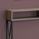 Durable wood look surface with a contemporary taupe finish. This console table is supported by a strong black metal X design frame. Perfect entryway table or accent table for the hallway, living room, bedroom or office.