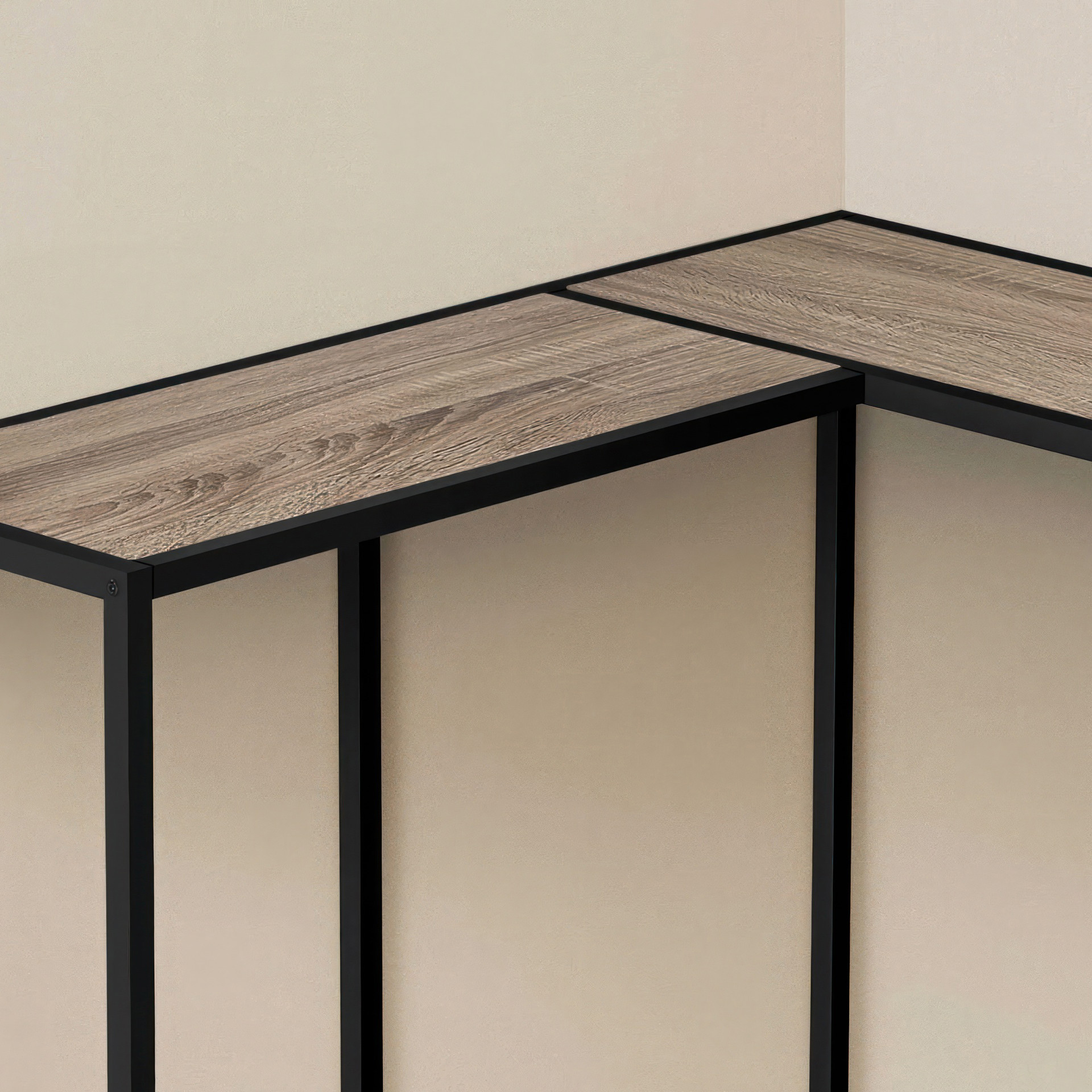 Tabletop panels in a dark taupe wood-look laminate provide ample surfaces for displaying decorative objects. The slim metal frame in a contrasting black finish offers stability and has an open, airy design.