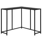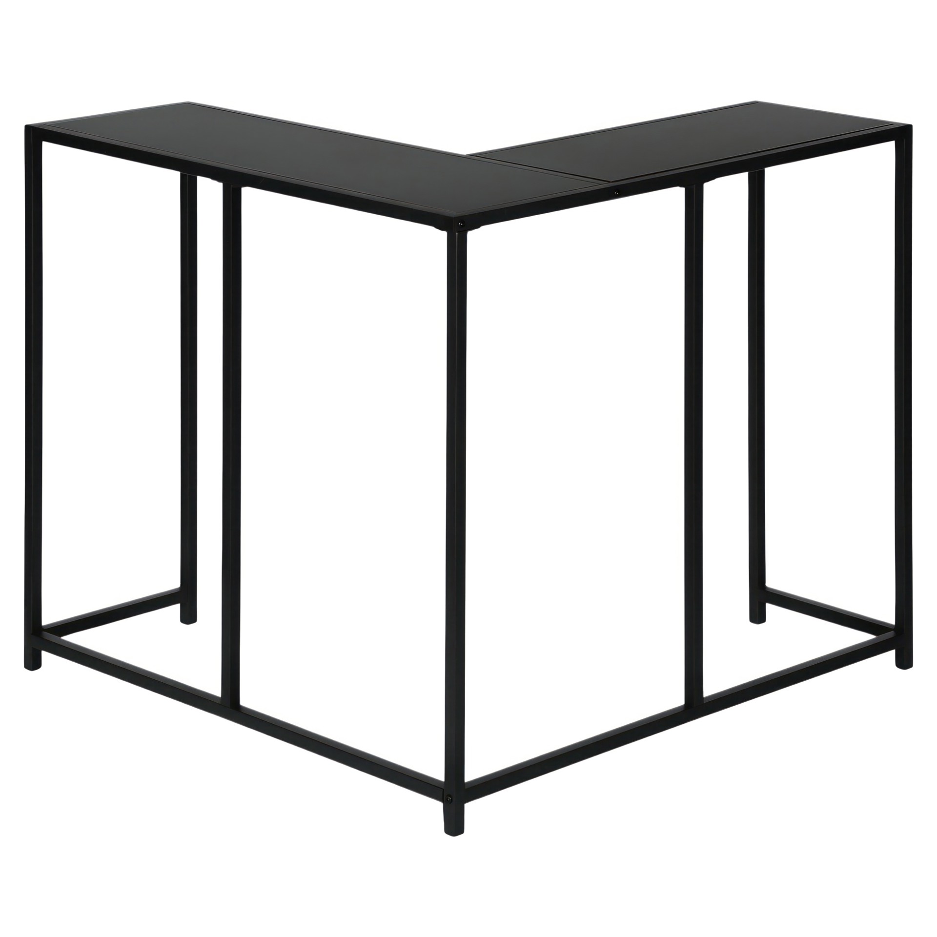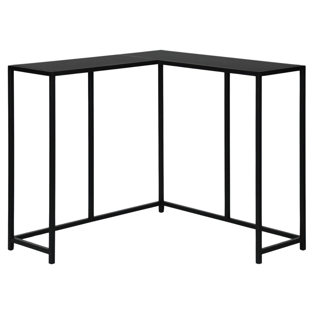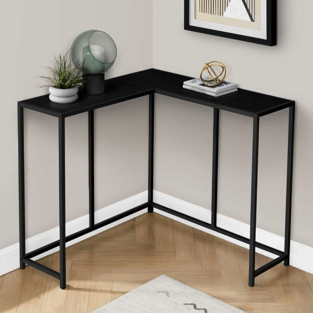 This corner console table offers a sleek, modern alternative to standard corner etageres and tables. While tall, narrow corner units maximize vertical space, this accent table optimizes the horizontal space available in a corner.