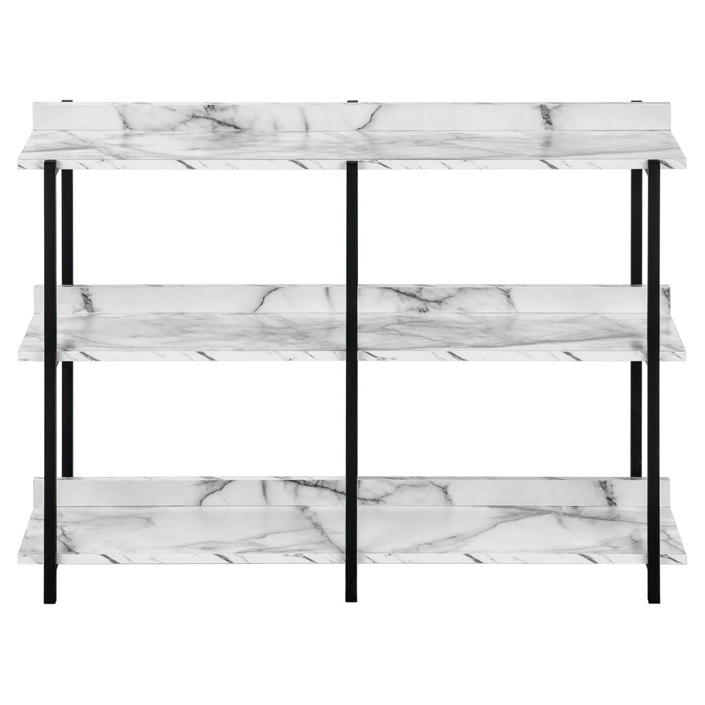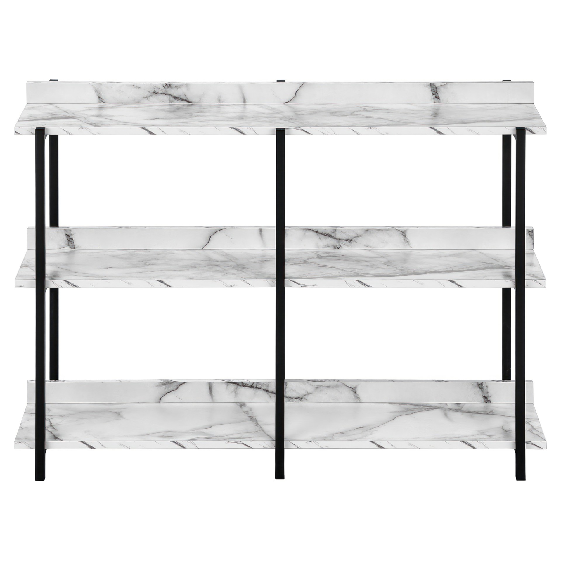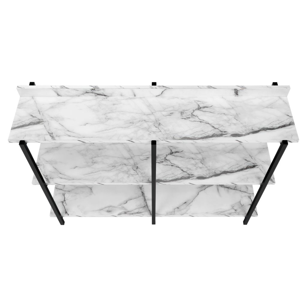 Proudly display prized possessions on this rectangular console table with 3-tier shelving. Underneath the long, narrow tabletop are shelves arranged on 2 levels. Distribute books, plants, and decorative items among the tabletop and shelves, which are in an elegant white marble-look laminate finish.