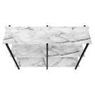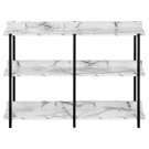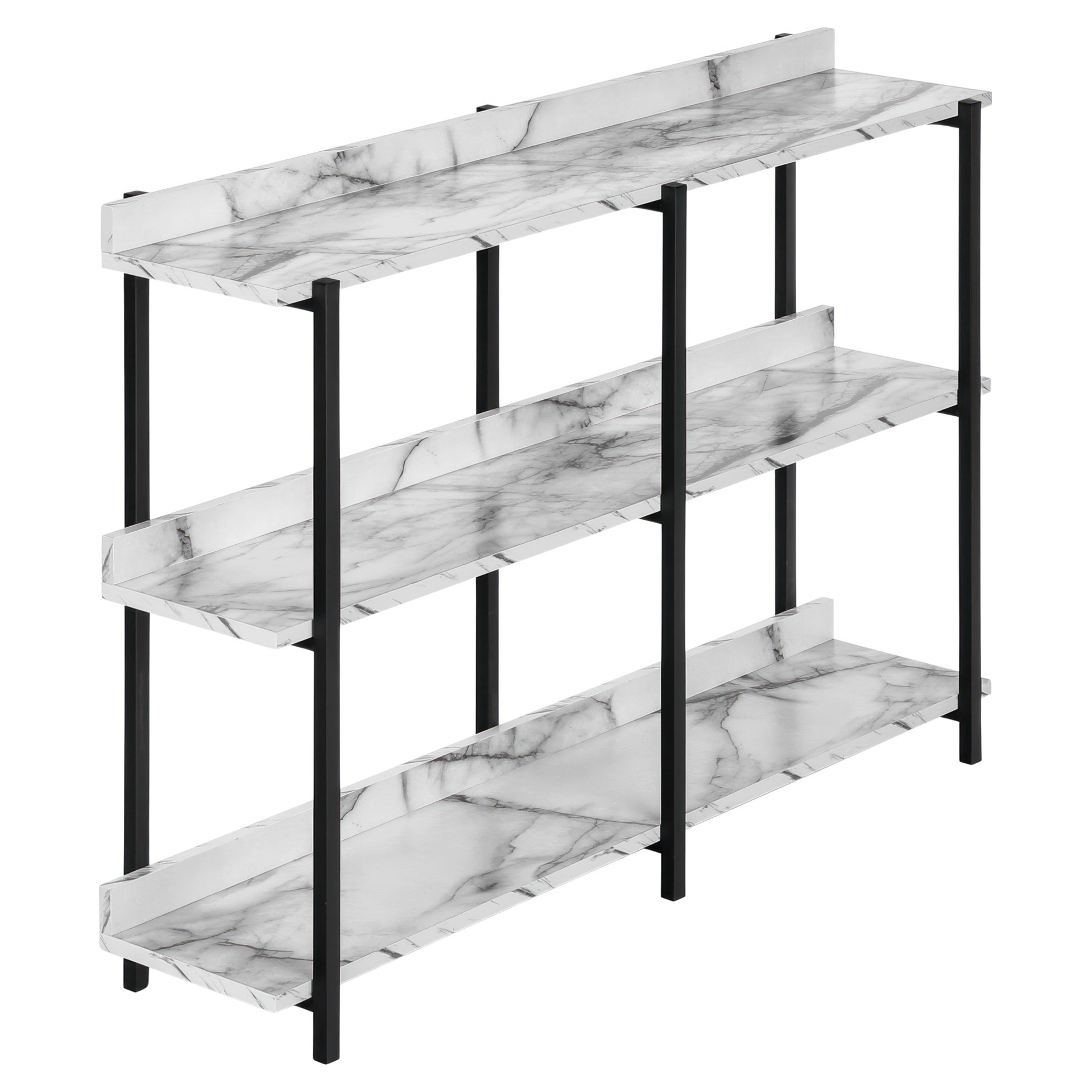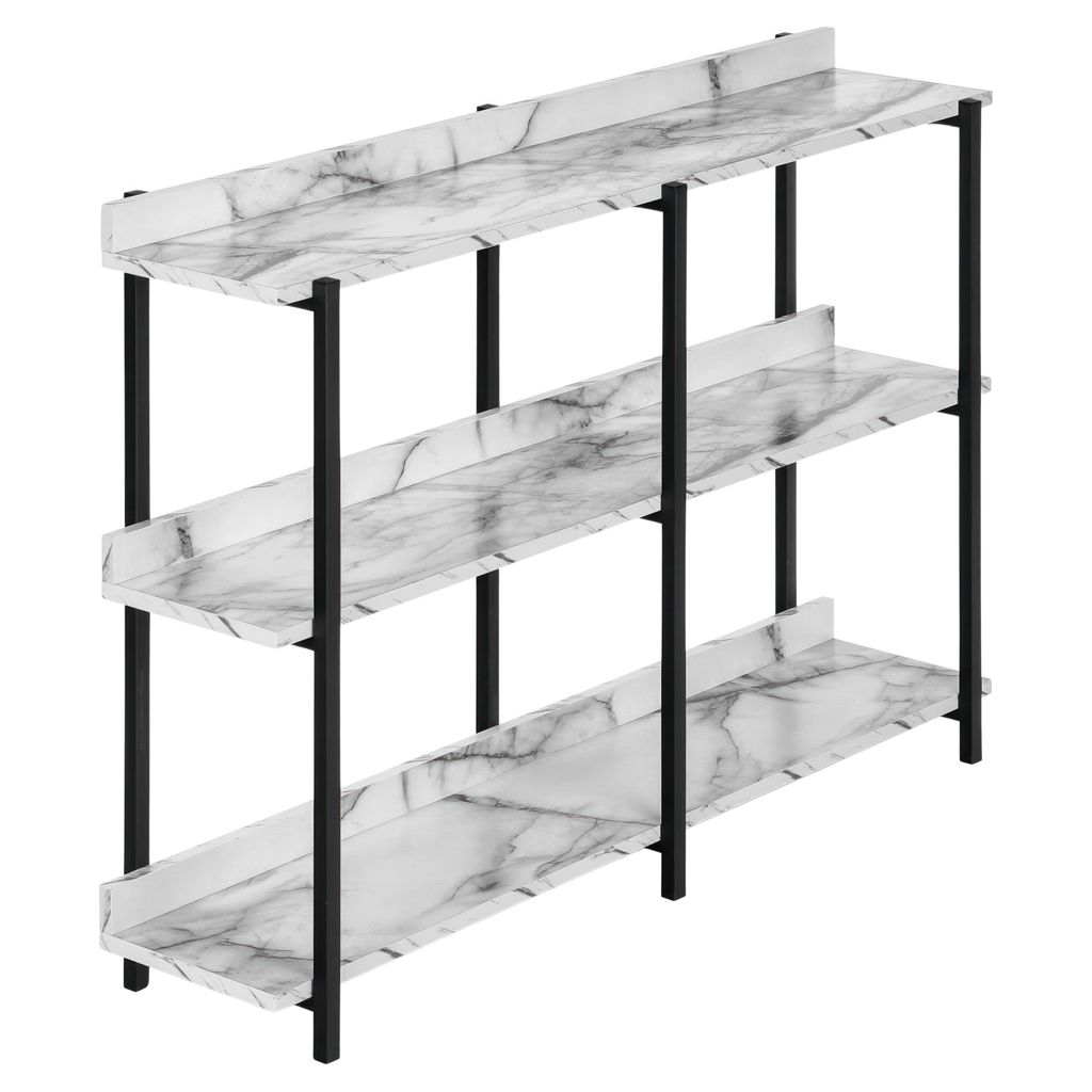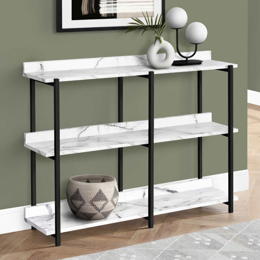 Proudly display prized possessions on this rectangular console table with 3-tier shelving. Underneath the long, narrow tabletop are shelves arranged on 2 levels. Distribute books, plants, and decorative items among the tabletop and shelves, which are in an elegant white marble-look laminate finish.