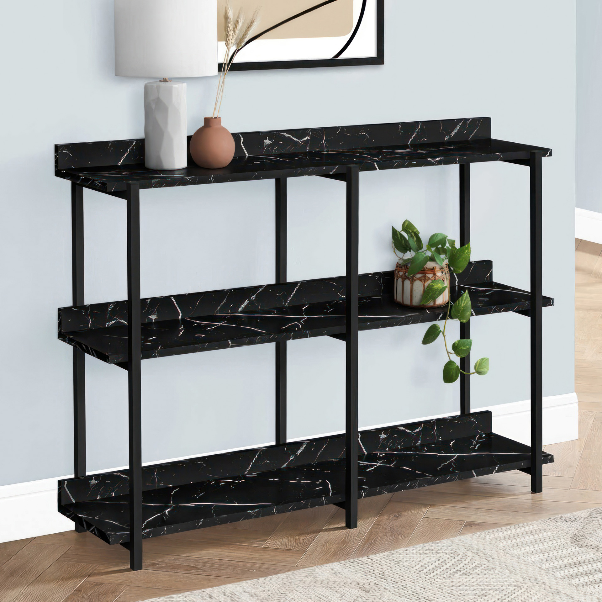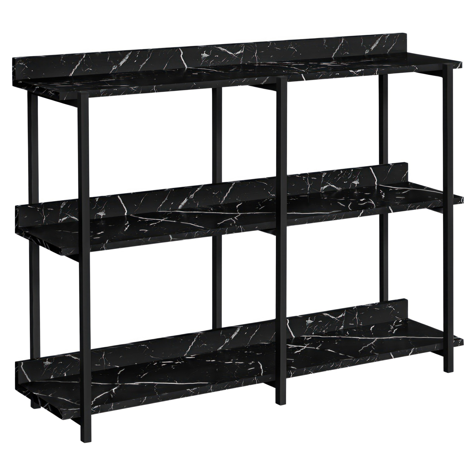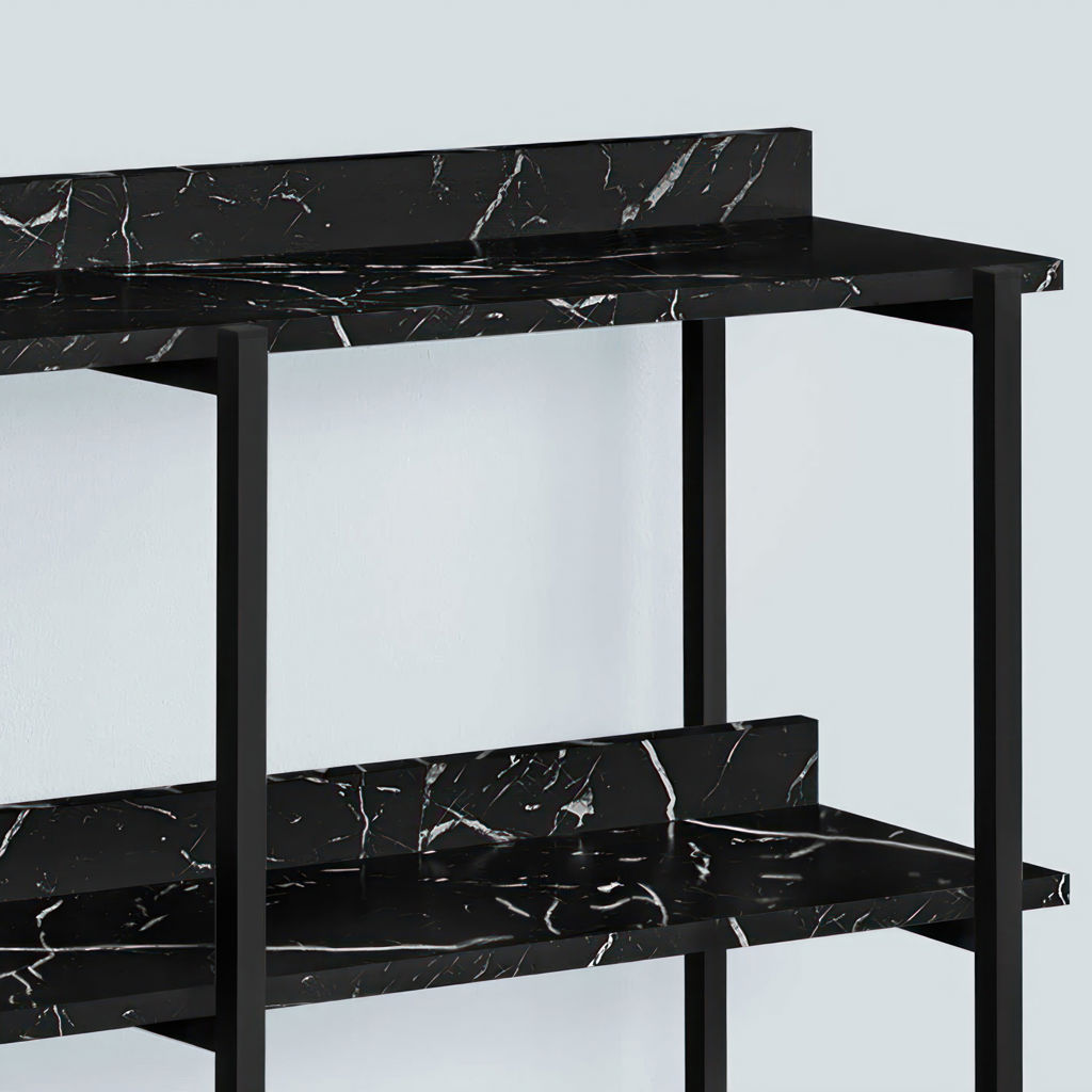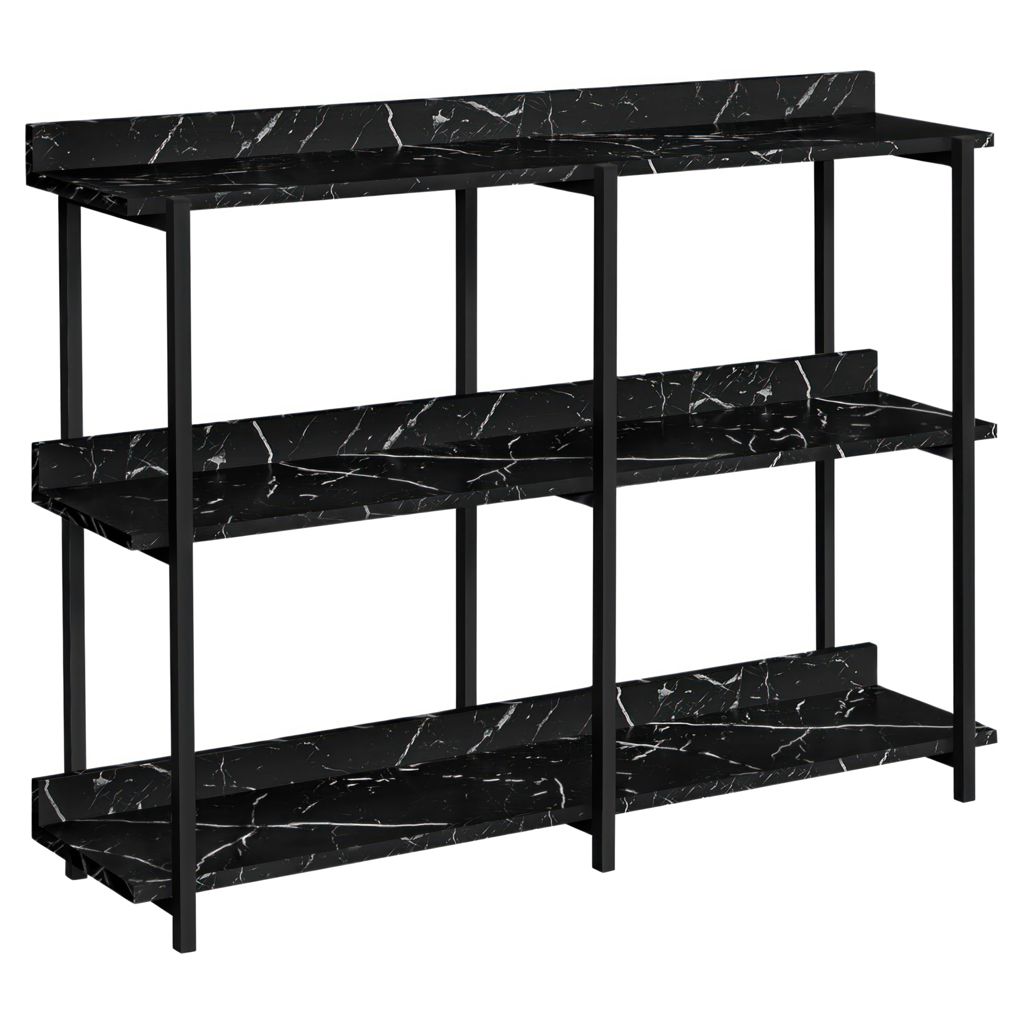 Distribute books, plants, and decorative items among the tabletop and shelves, which are in a elegant black marble-look laminate finish. The sturdy metal frame in black finish features clean lines and right angles for a modern look.