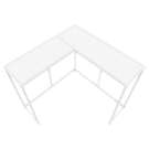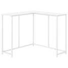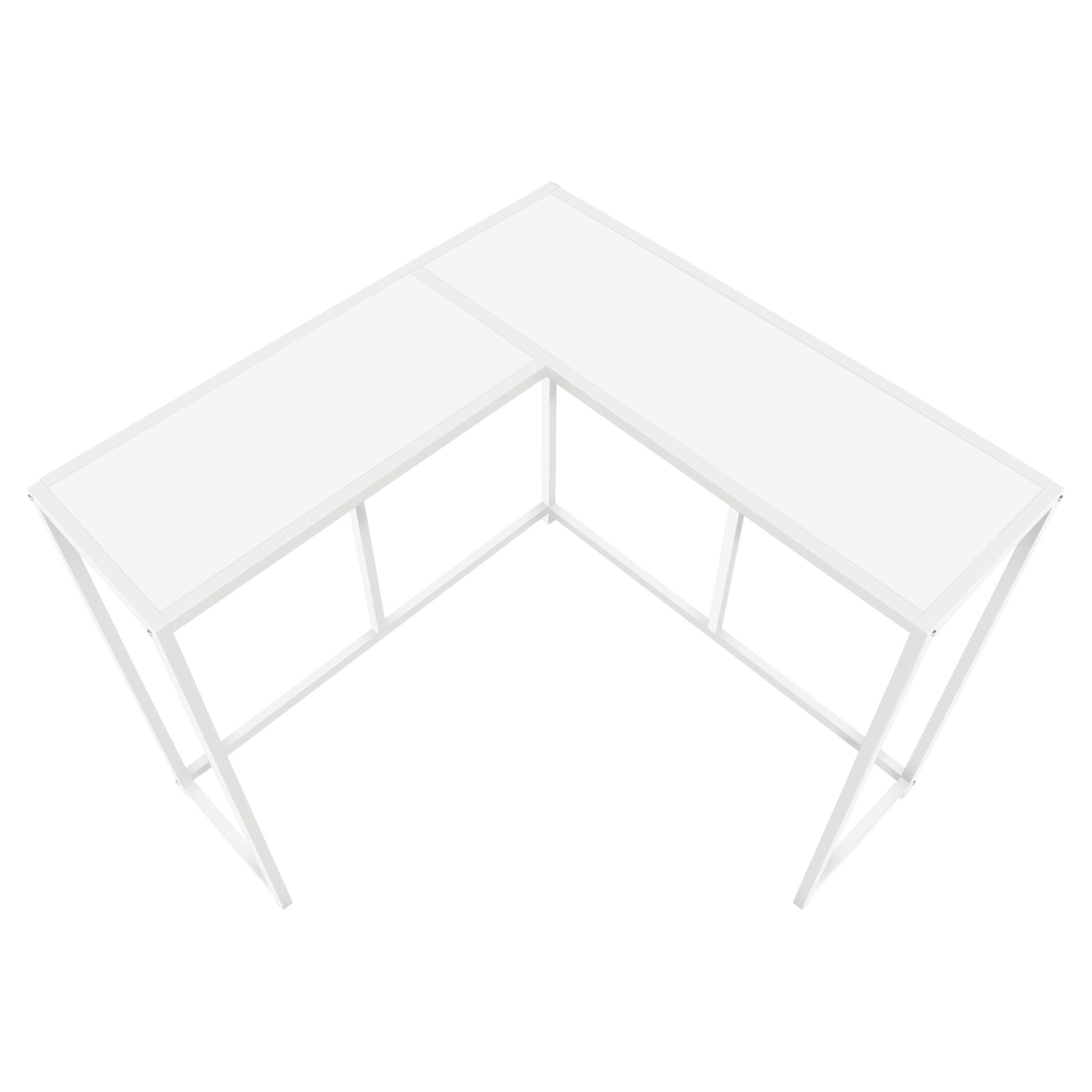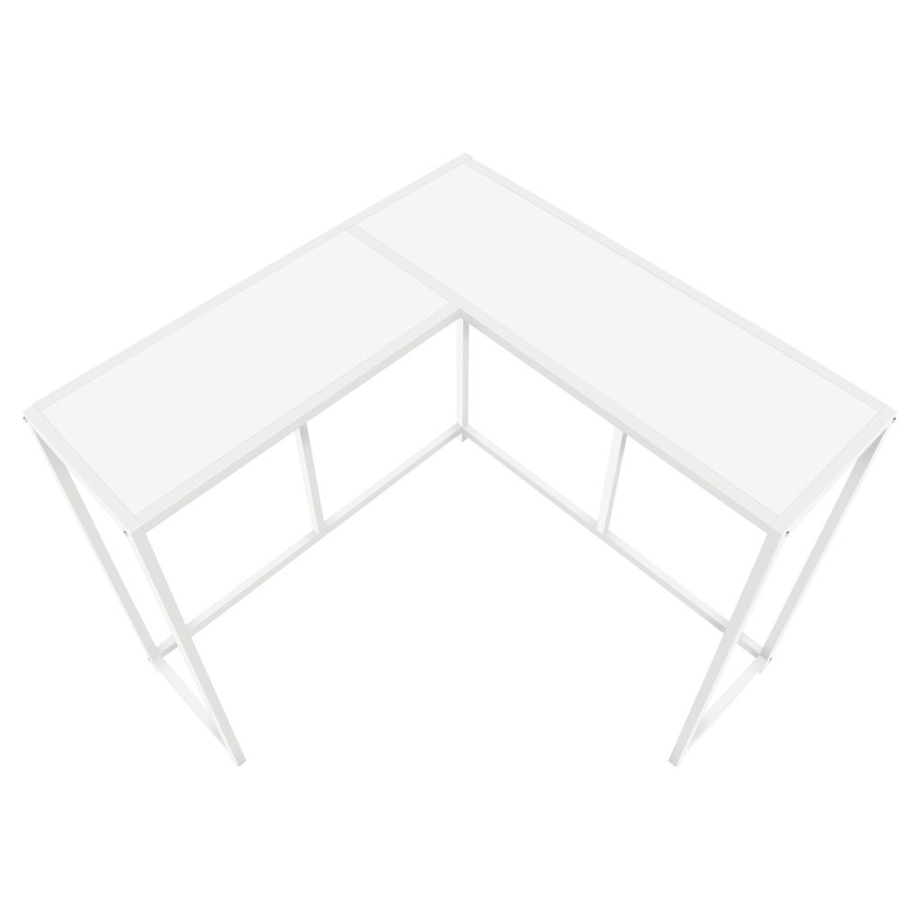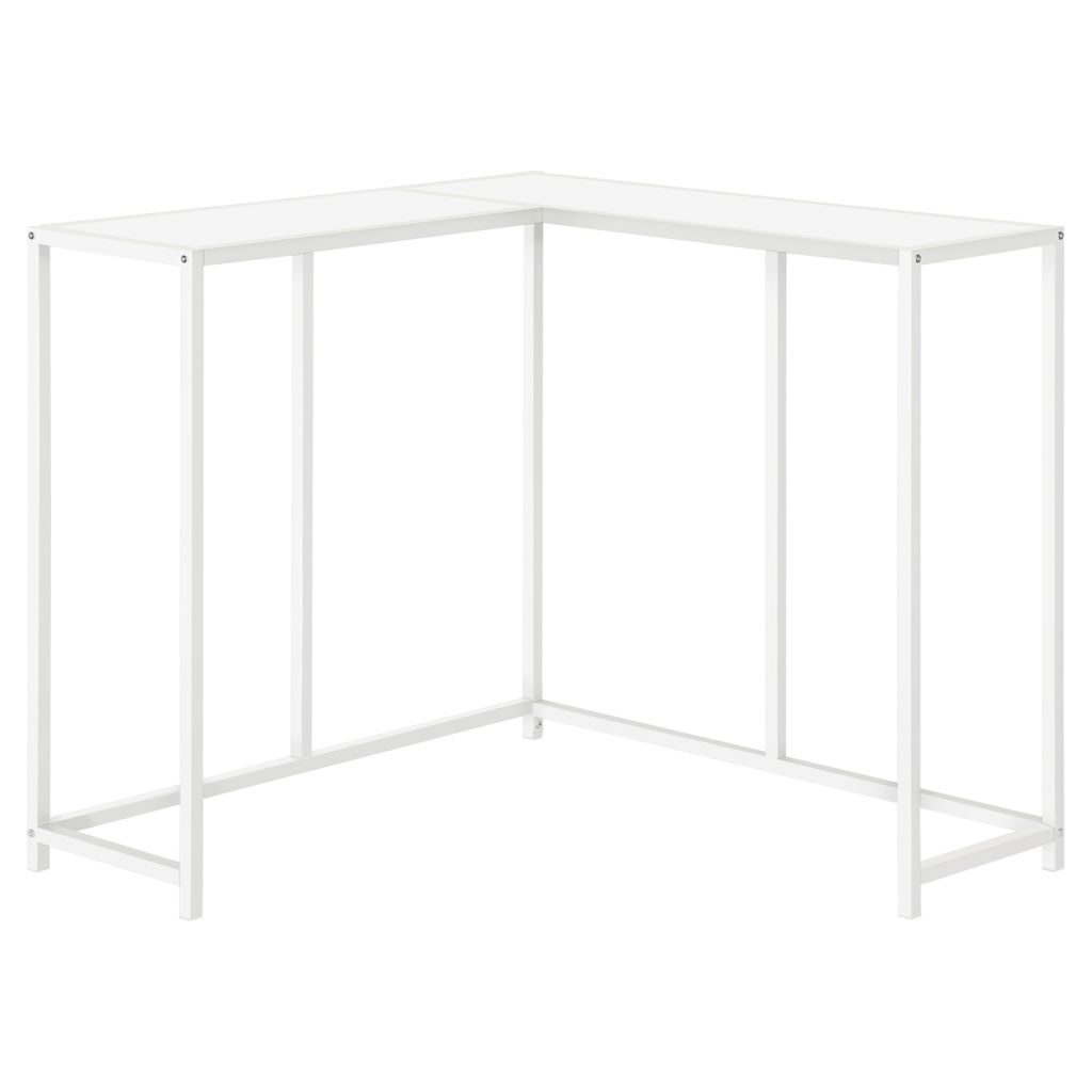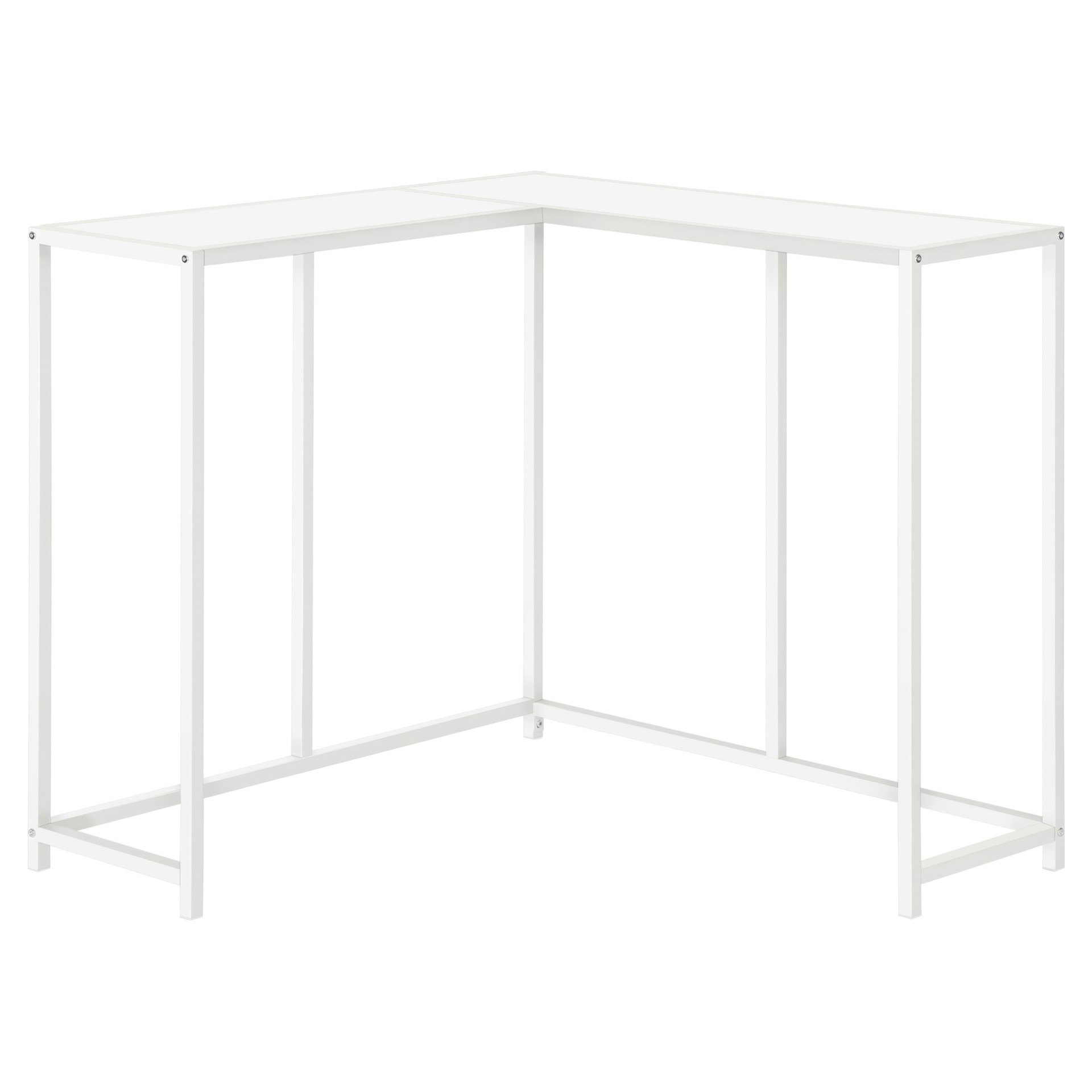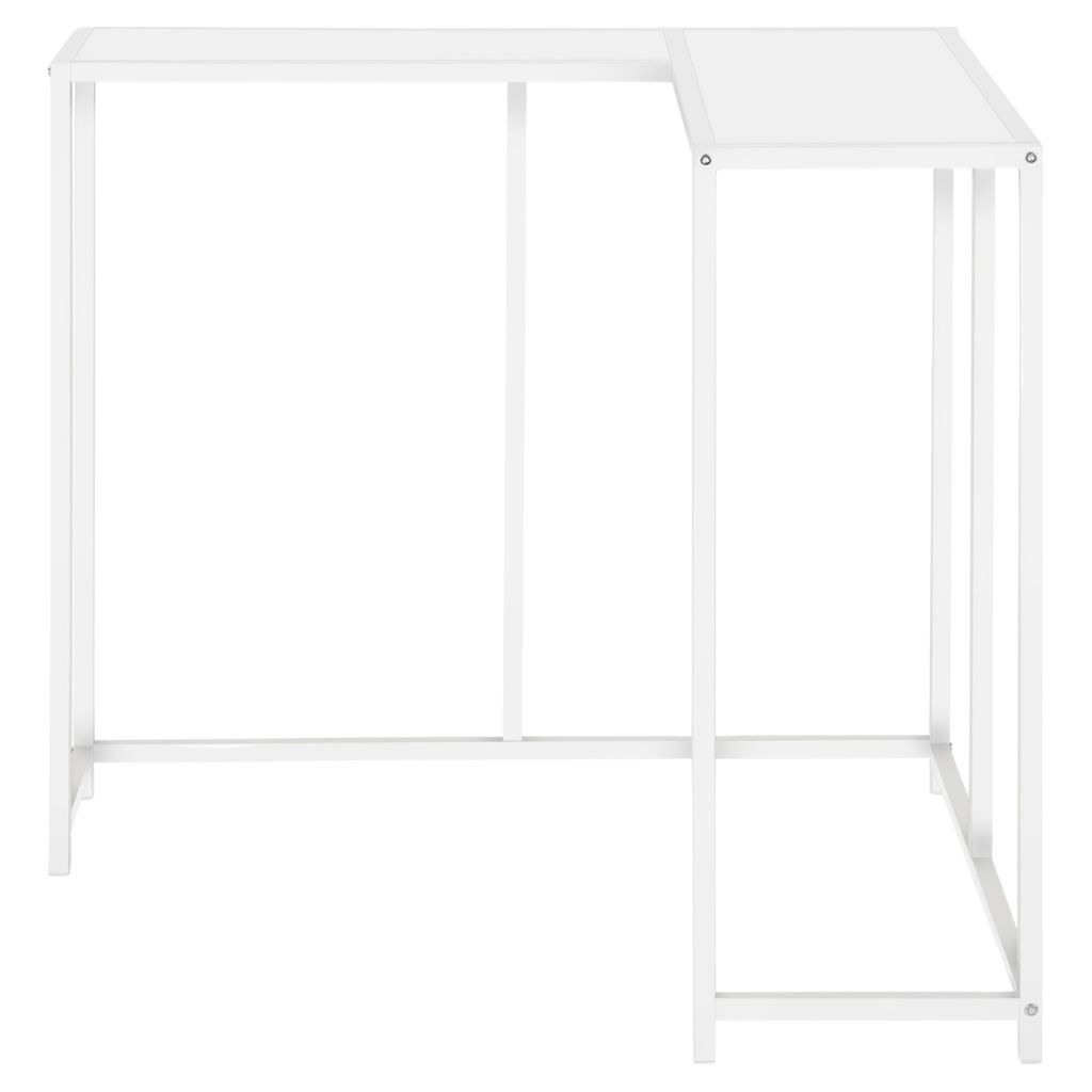 Tabletop panels in a white laminate provide ample surfaces for displaying decorative objects.  The slim metal frame in a matching white finish offers stability and has an open, airy design.