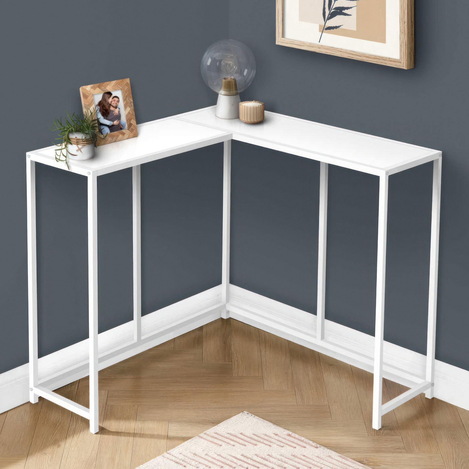 This corner console table offers a sleek, modern alternative to standard corner etageres and tables. While tall, narrow corner units maximize vertical space, this accent table optimizes the horizontal space available in a corner.