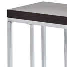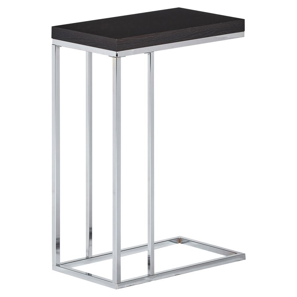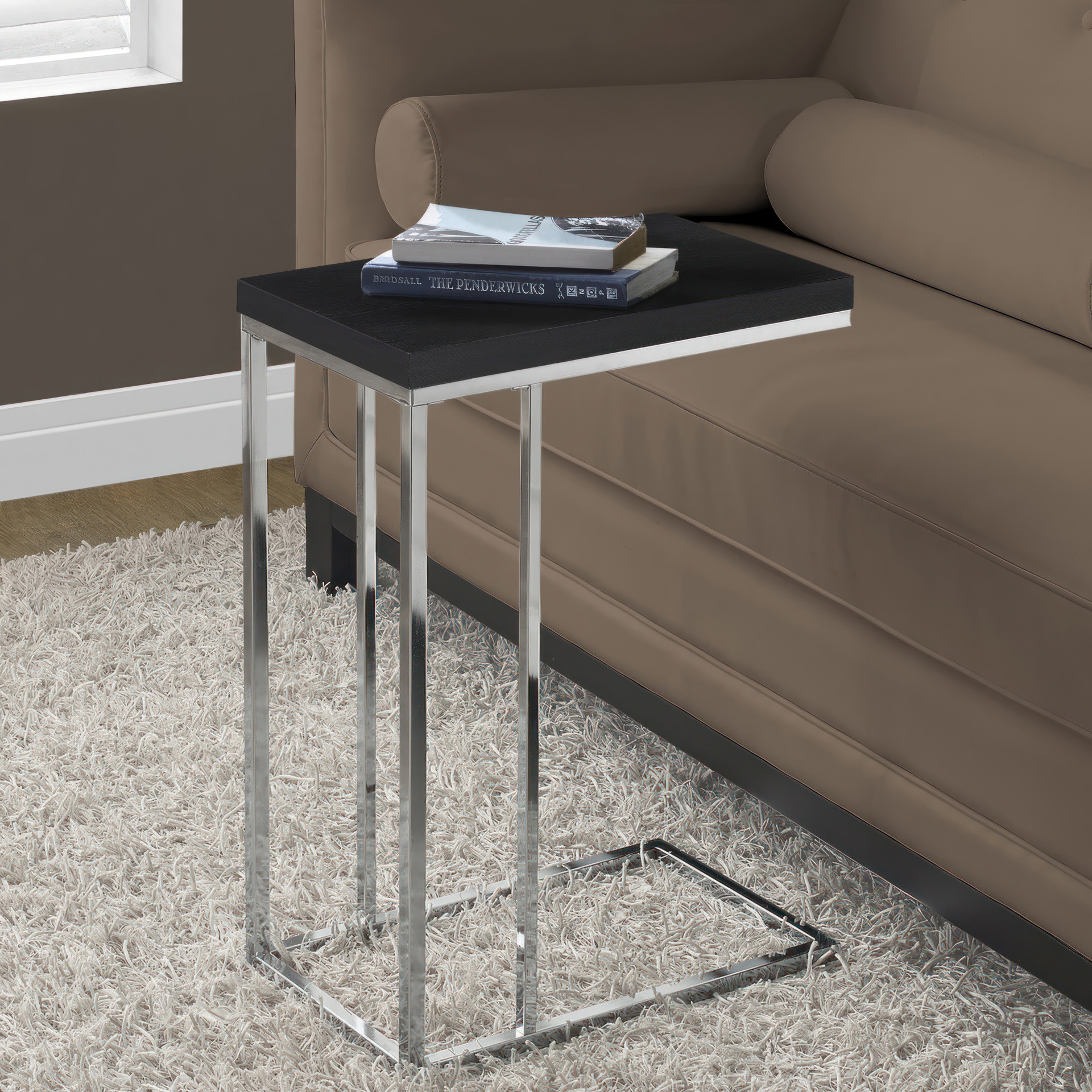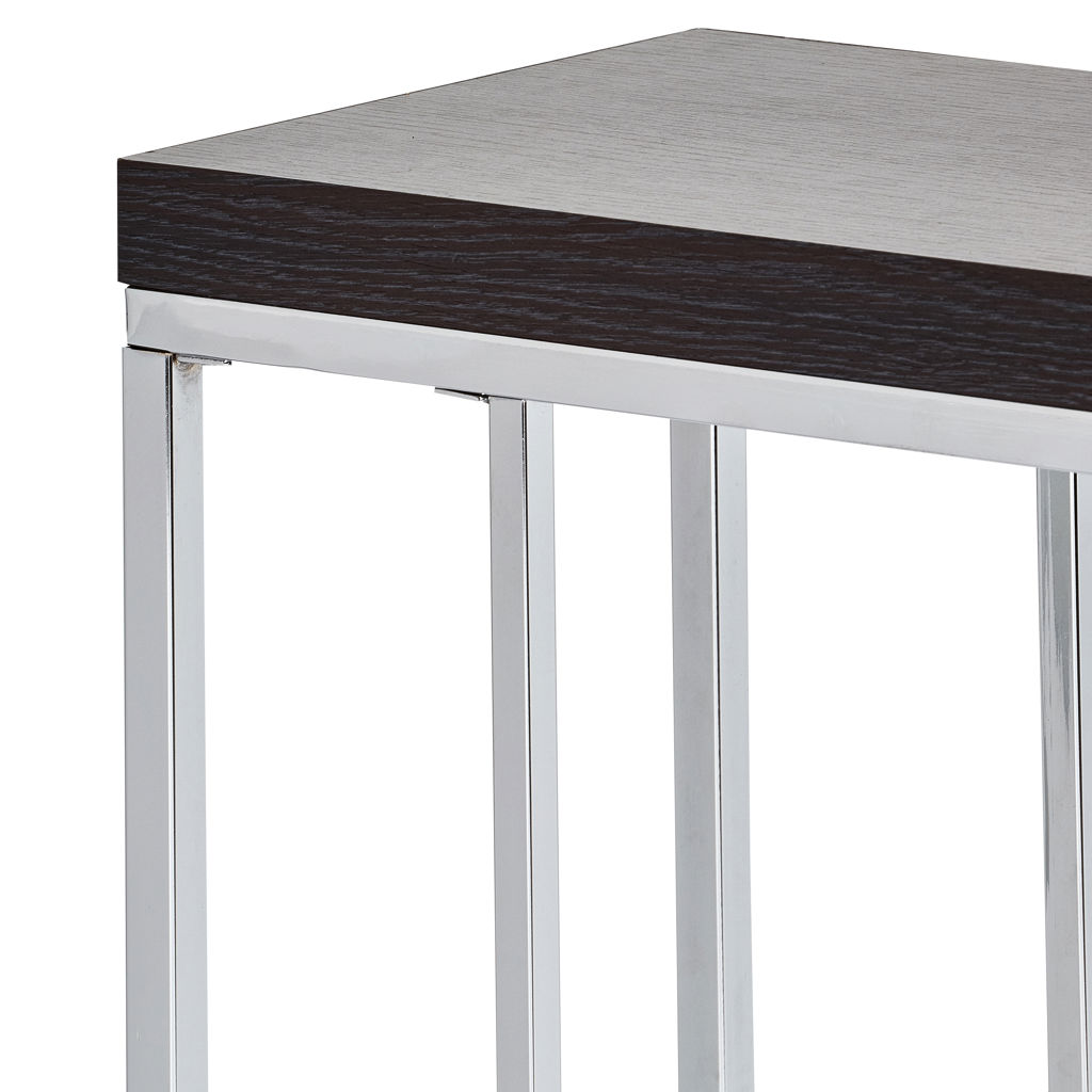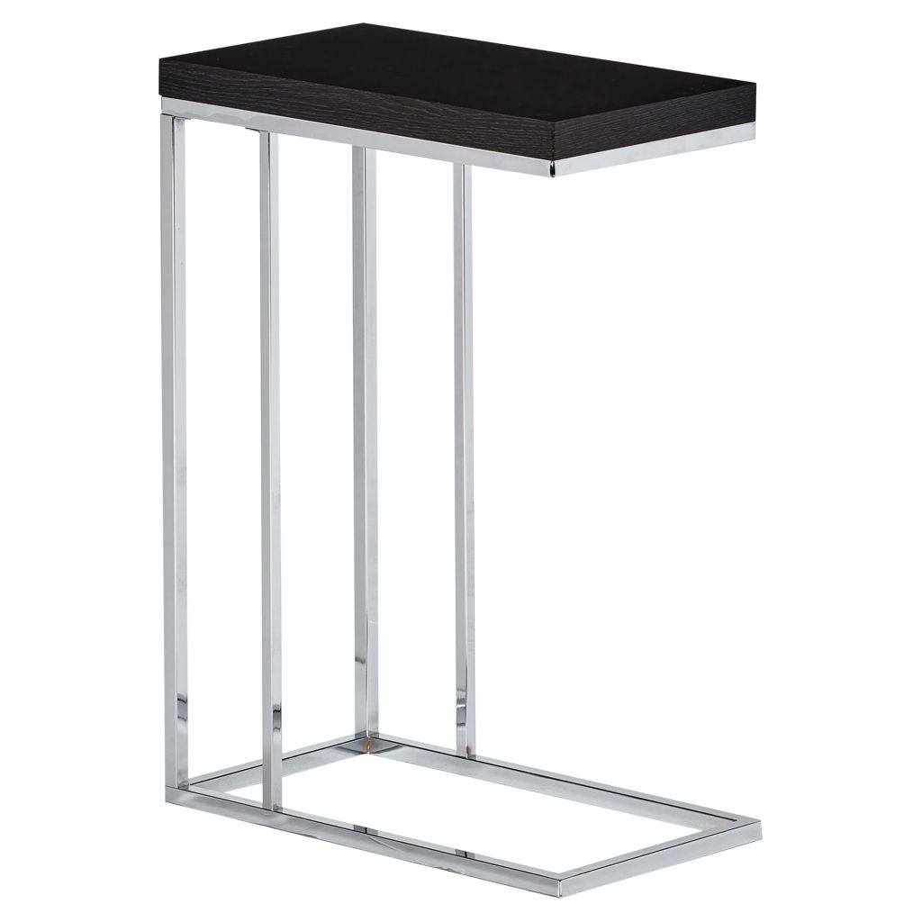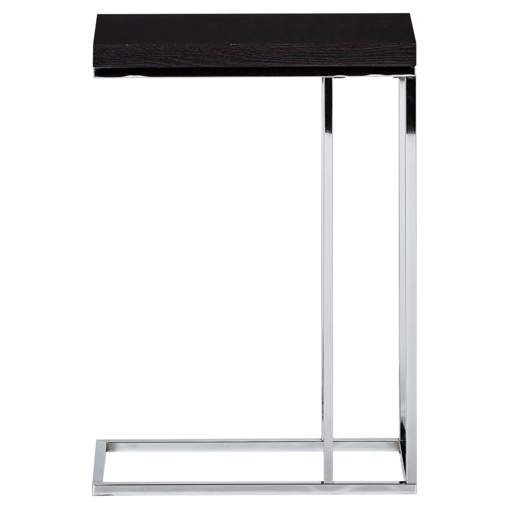 This cappuccino-finished, hollow-core side table provides enough space for you to eat your meals and snacks or set down your drinks! Its chrome metal base provides sturdy support and adds a stylish touch to your chosen decor