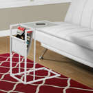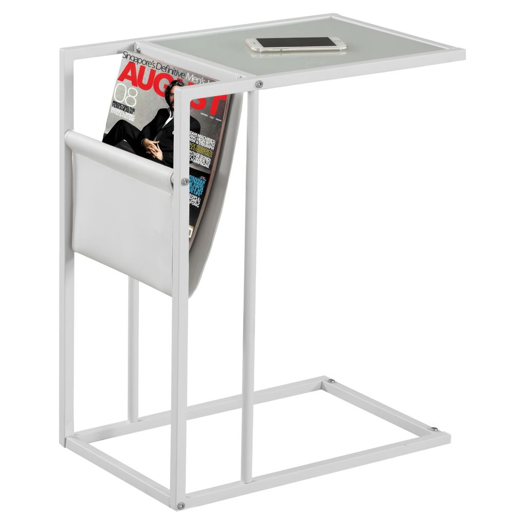 Chic for your condo, apartment or small home and versatile as a side table or bedside table, this beautiful table is here for you. Use it while watching your favourite movie or during your snack time, anything goes. The table features a built-in magazine rack with a frosted glass panel supported by a solid white metal base. Let yourself be charmed by this beautiful table. A versatile style to use as a sofa side table, side table or bedside table. Includes a built-in leatherette magazine rack in a convenient location. Sturdy white metal base holds everything in place effortlessly; sits slightly high off the floor to prevent damage. The blown glass panel is elegant and easy to clean; easily accommodates your favourite flowers, picture frames or other decorations.