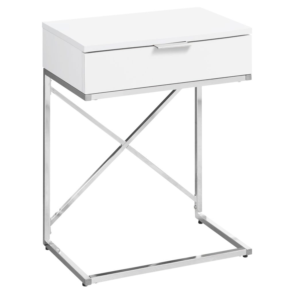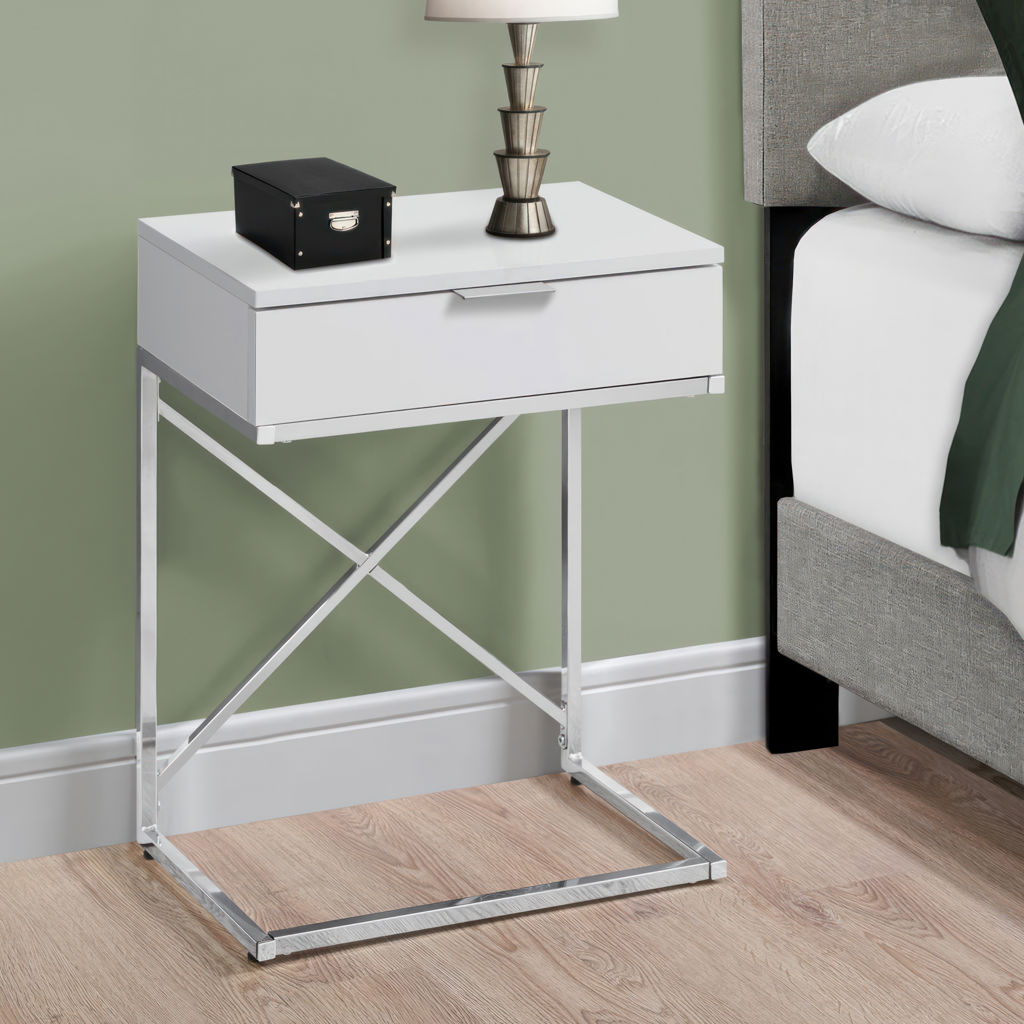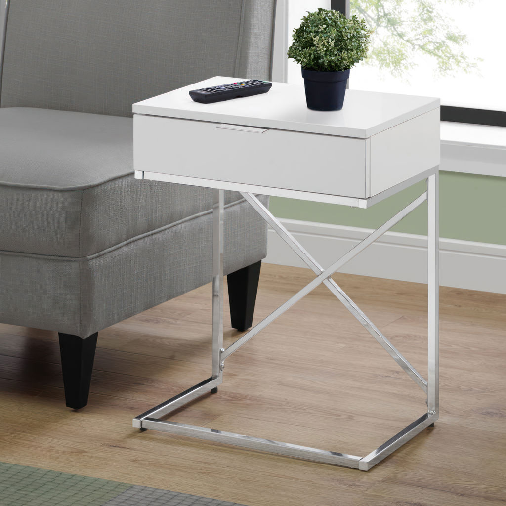 Add a contemporary touch to your space with this multifunctional side table. The spacious rectangular tabletop is constructed of premium MDF panels finished in a glossy white. It features, a large metal pull-out drawer accented by a slim silver metal handle. Its sturdy chrome-plated metal base with an X-shaped frame frames the table giving it a beautiful style. Whether you use this fashionable table in a bedroom as a bedside table or in the living room as a side table, this table will add fresh style to any room! Spacious rectangular tabletop finished in glossy white. A large drawer with a simple and discreet chrome metal handle. Chrome metal X-shaped design base. Versatile side table can be used as a side table or bedside table. Trendy design that fits in today's home.